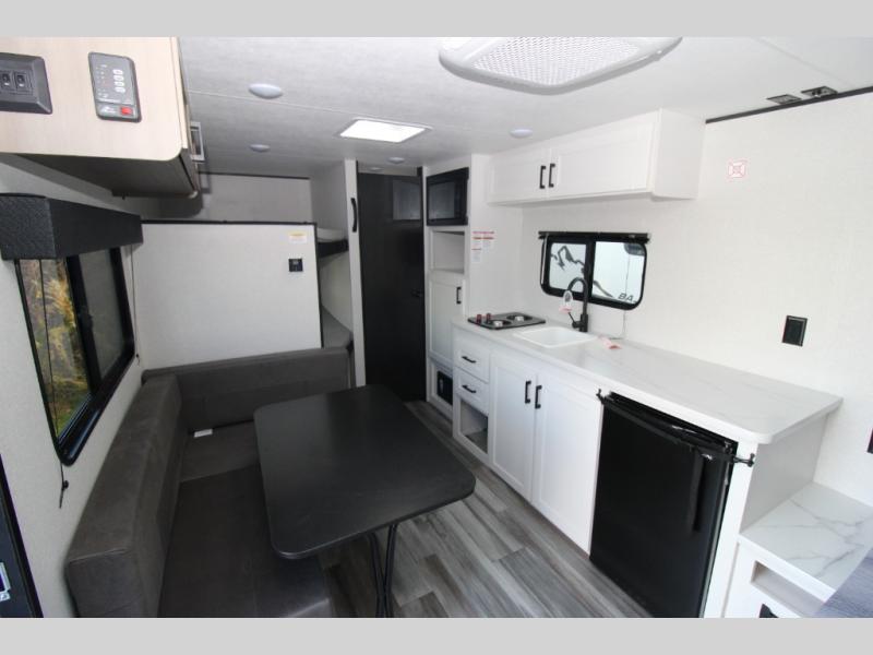 Your crew of six will love camping in this travel trailer! There are double-size bunk beds in the rear corner and a private bath in the other rear corner for easy nighttime use. You will have the front queen bed to yourselves, along with an overhead shelf and a nightstand for your things. And the L-shaped dinette provides a place to dine and play games. The Customer Value Package on this Sport Edition model includes a 19K BTU furnace, stabilizer jacks, a power awning, an entry door with a window and shade prep, and many more stand-out features!