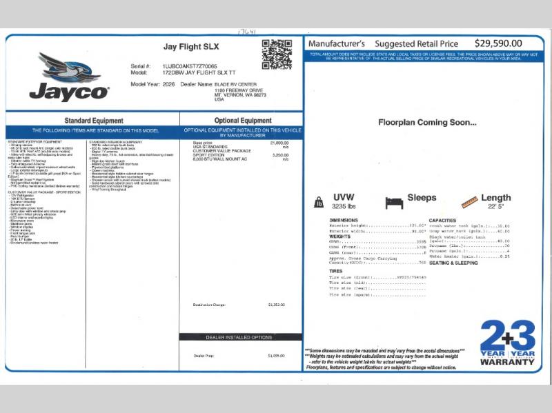 New 2026 Jayco Jay Flight SLX 172DBW Travel Trailer