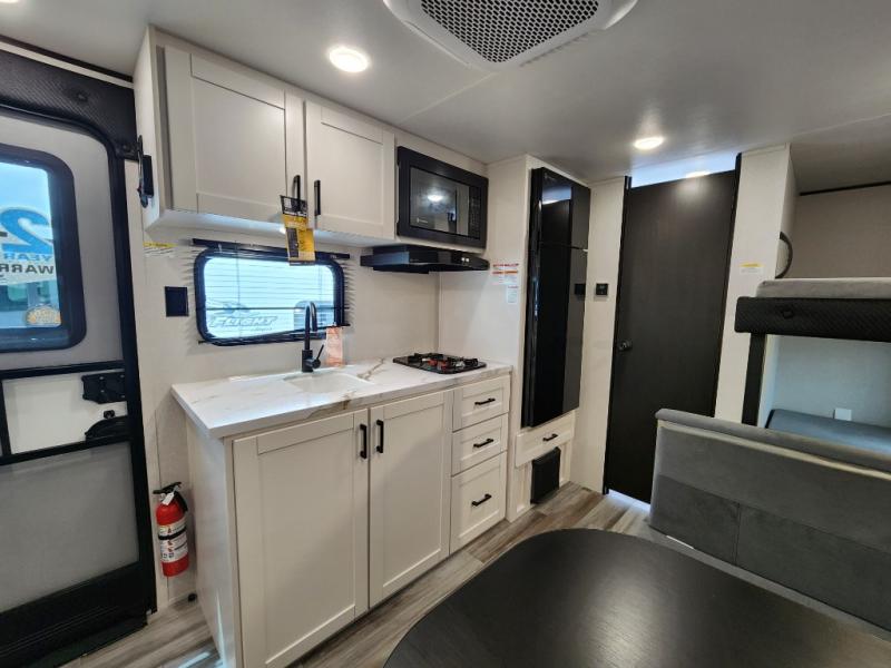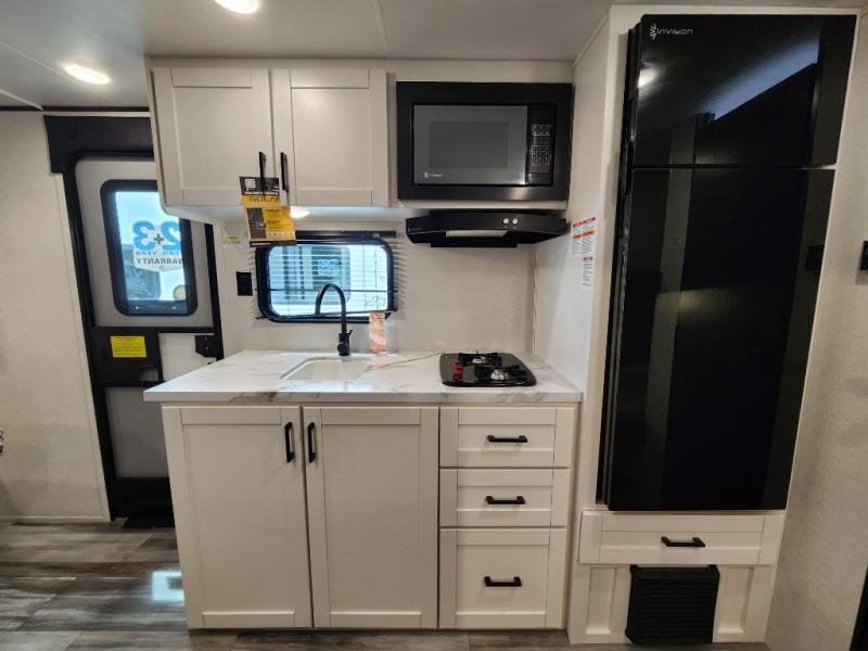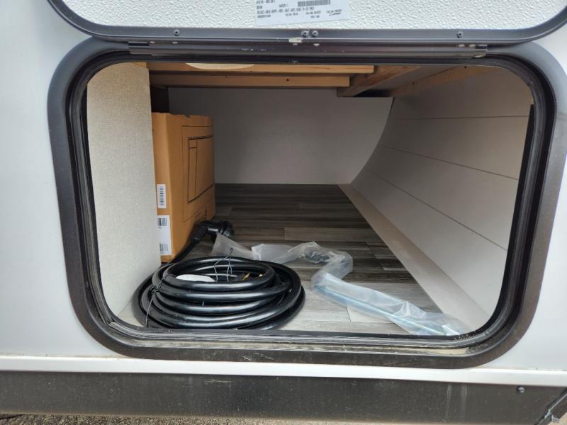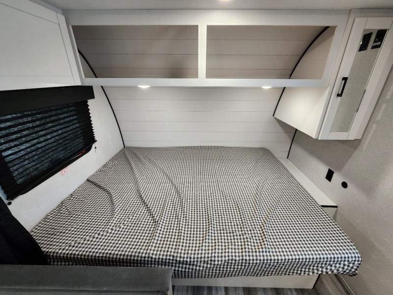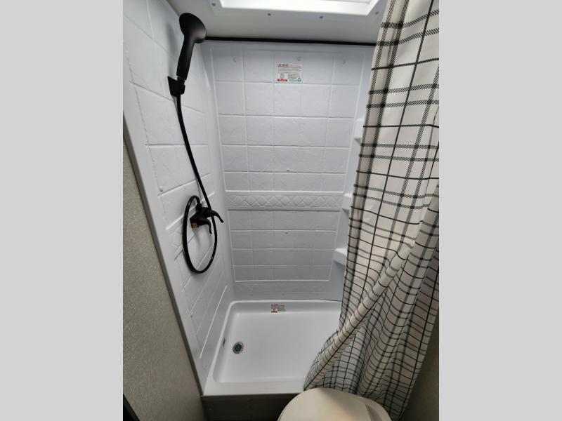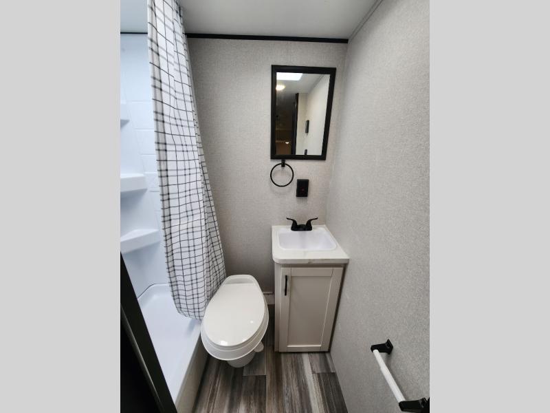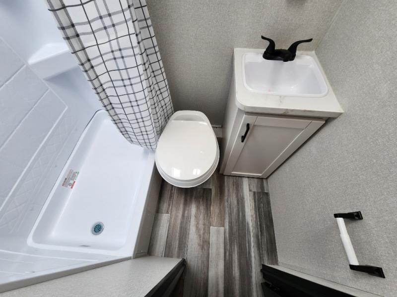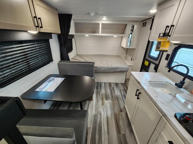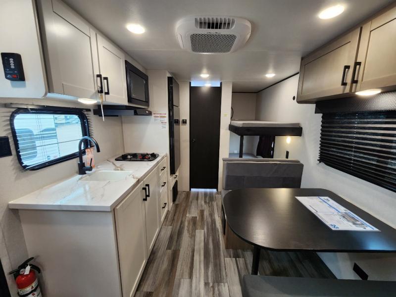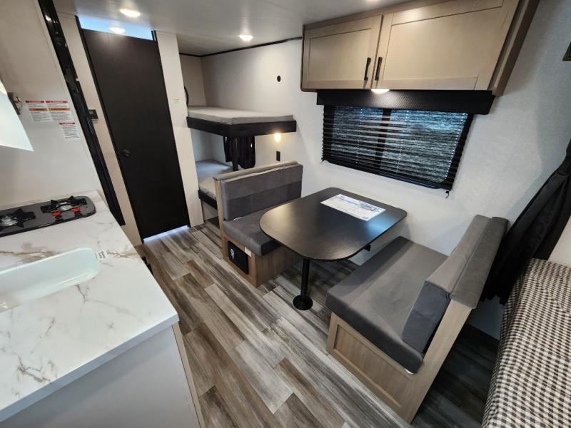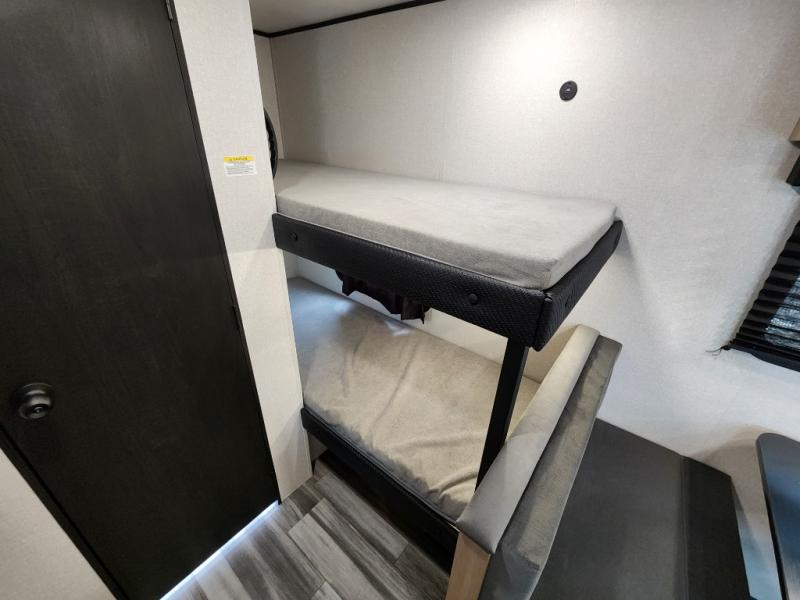Your crew of five will love camping in this single-axle travel trailer! There are bunk beds in the rear corner and a full bath in the other rear corner for easy nighttime use. You will have the front queen bed to yourselves, along with a privacy curtain, overhead shelf, and a nightstand/wardrobe for your clothes. The booth dinette provides a place to dine, play games, and even let an extra guest stay over. The optional STX Edition can be added on this model which includes 16 in. off-road tires, triple entry steps, a power tongue jack, and more!