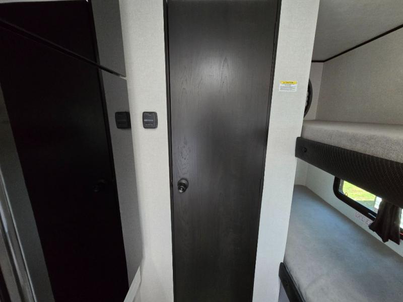 Your crew of five will love camping in this single-axle travel trailer! There are bunk beds in the rear corner and a full bath in the other rear corner for easy nighttime use. You will have the front queen bed to yourselves, along with a privacy curtain, overhead shelf, and a nightstand/wardrobe for your clothes. The booth dinette provides a place to dine, play games, and even let an extra guest stay over.