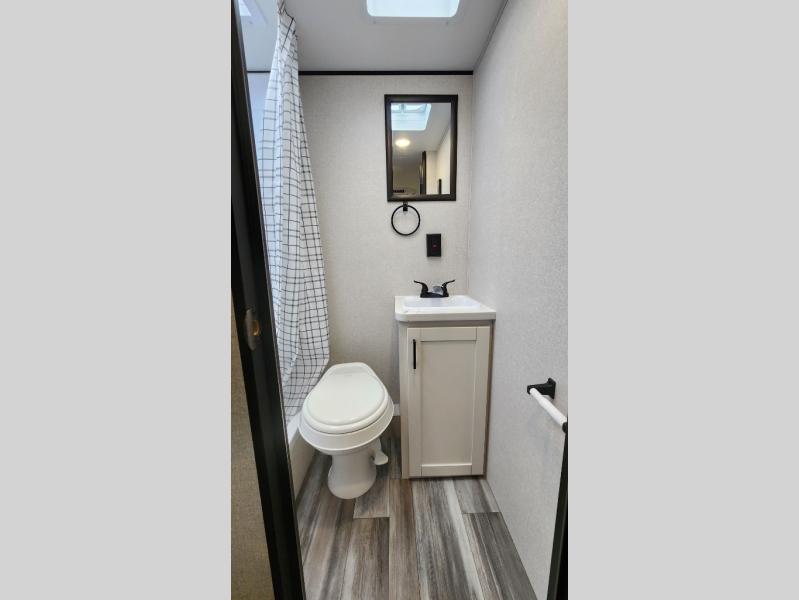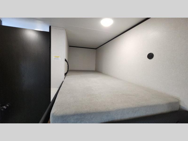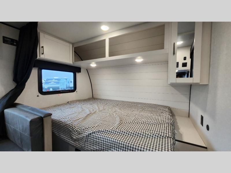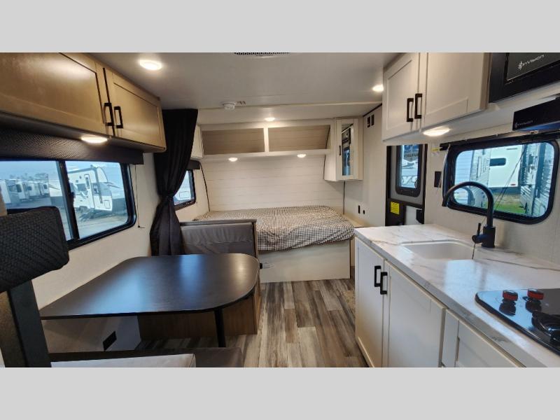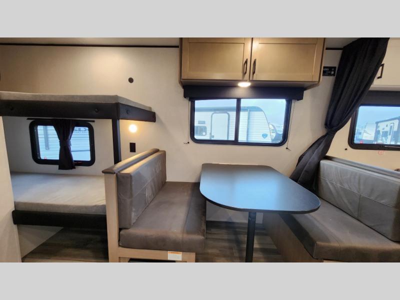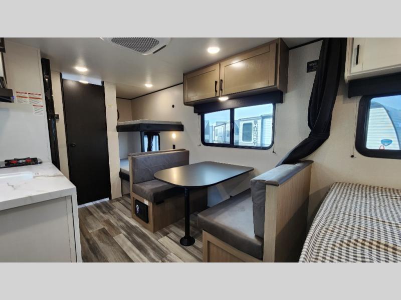Your crew of five will love camping in this single-axle travel trailer! There are bunk beds in the rear corner and a full bath in the other rear corner for easy nighttime use. You will have the front queen bed to yourselves, along with a privacy curtain, overhead shelf, and a nightstand/wardrobe for your clothes. The booth dinette provides a place to dine, play games, and even let an extra guest stay over.