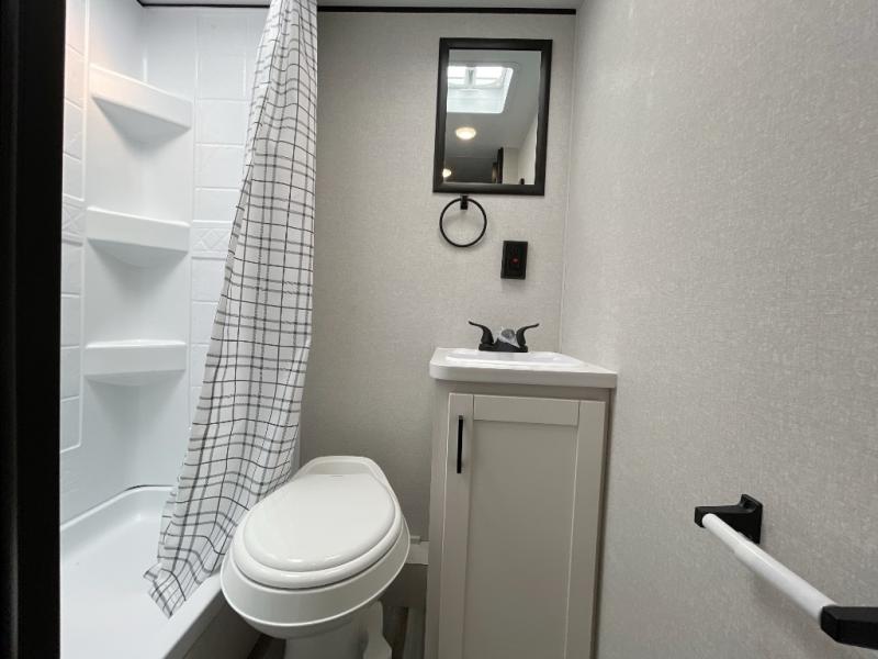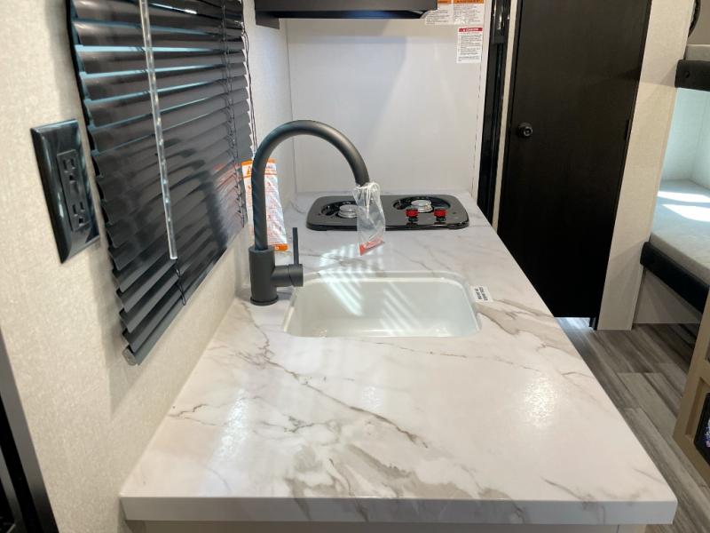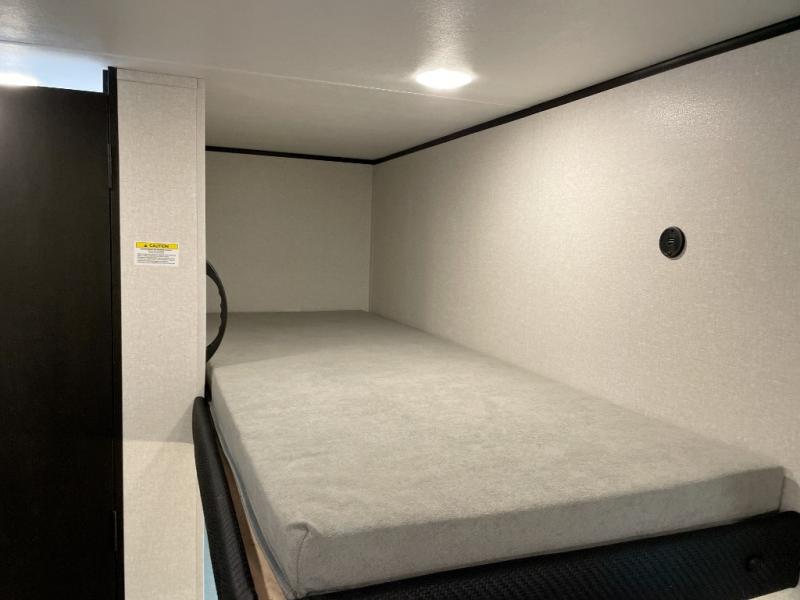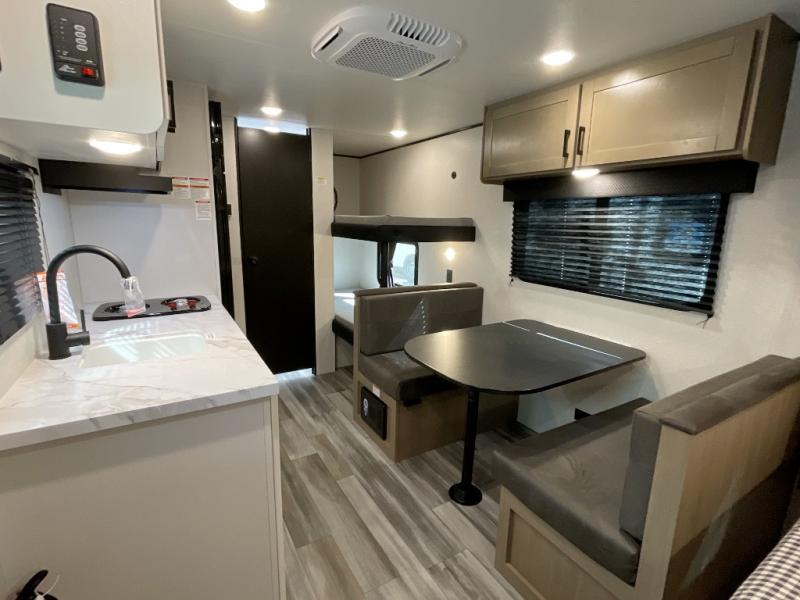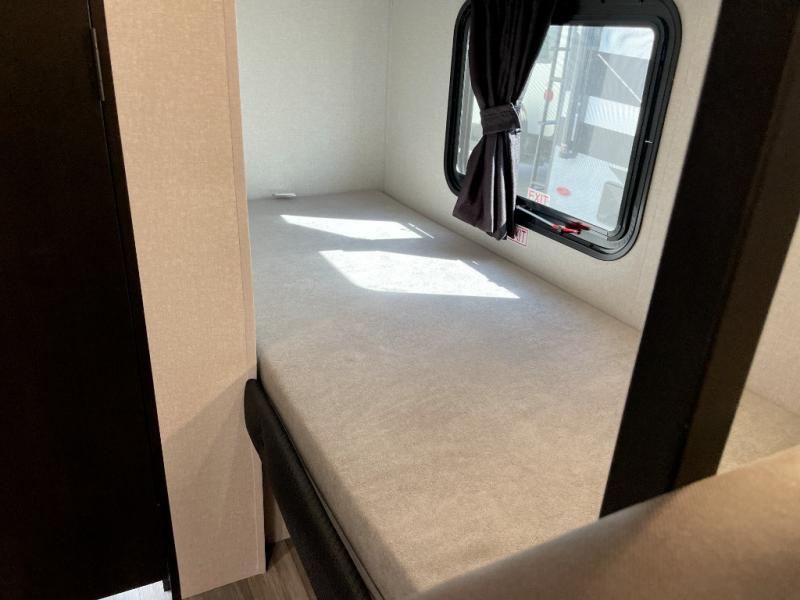 Your crew of five will love camping in this single-axle travel trailer! There are bunk beds in the rear corner and a full bath in the other rear corner for easy nighttime use. You will have the front queen bed to yourselves, along with a privacy curtain, overhead shelf, and a nightstand/wardrobe for your clothes. The booth dinette provides a place to dine, play games, and even let an extra guest stay over.