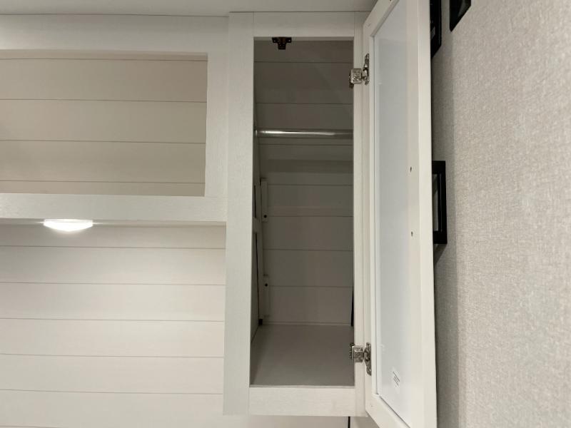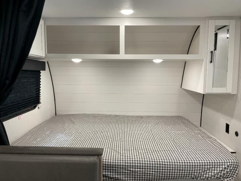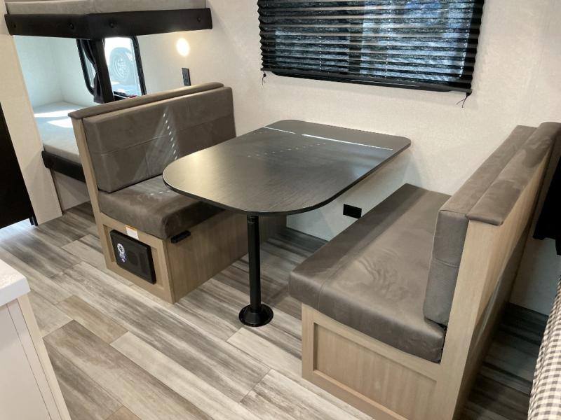 Your crew of five will love camping in this single-axle travel trailer! There are bunk beds in the rear corner and a full bath in the other rear corner for easy nighttime use. You will have the front queen bed to yourselves, along with a privacy curtain, overhead shelf, and a nightstand/wardrobe for your clothes. The booth dinette provides a place to dine, play games, and even let an extra guest stay over.