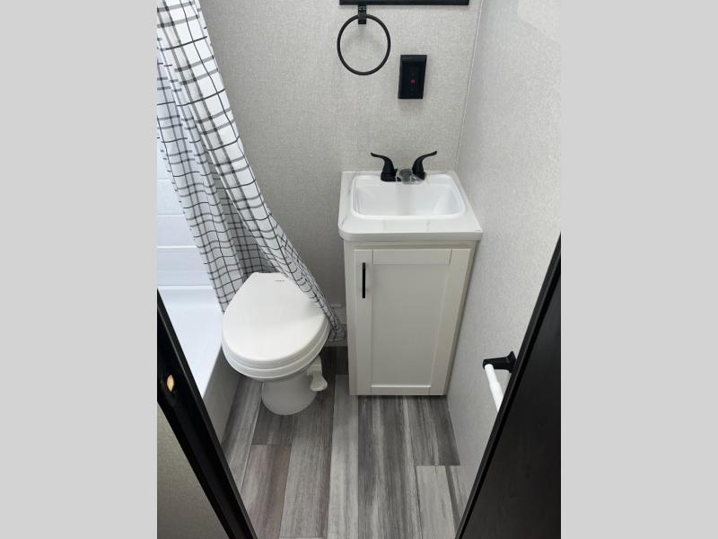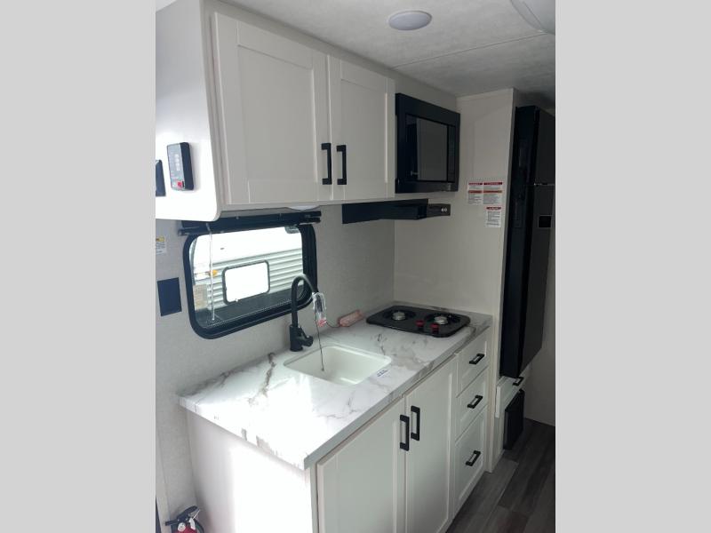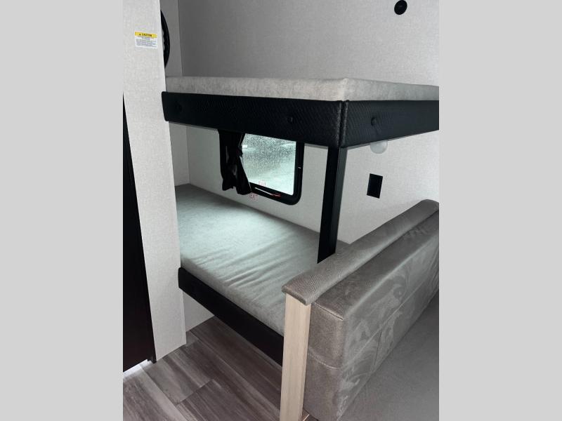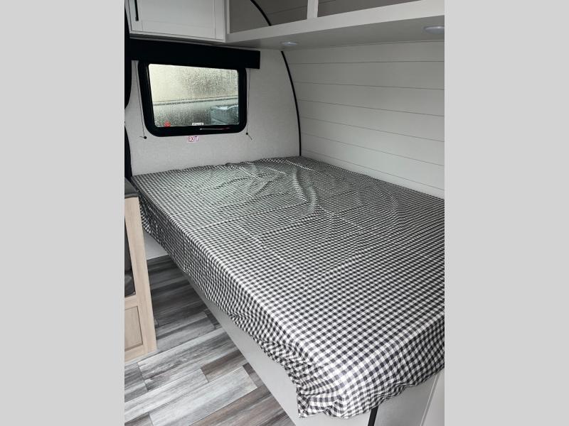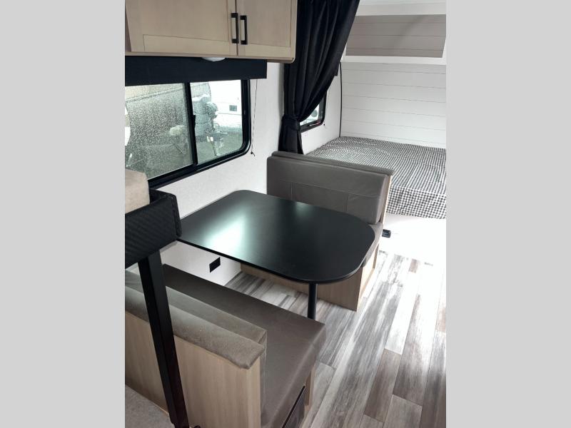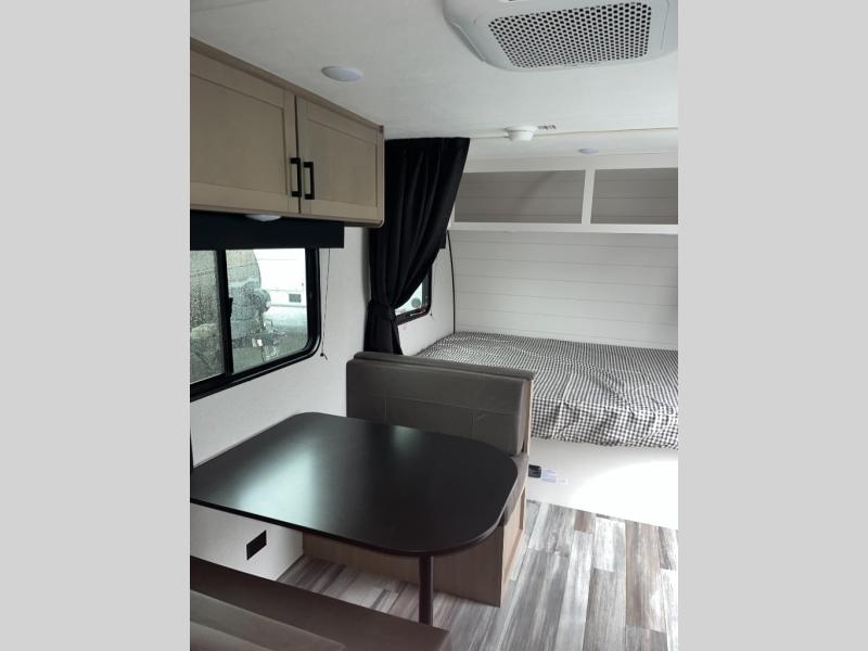 Your crew of five will love camping in this single-axle travel trailer! There are bunk beds in the rear corner and a full bath in the other rear corner for easy nighttime use. You will have the front queen bed to yourselves, along with a privacy curtain, overhead shelf, and a nightstand/wardrobe for your clothes. The booth dinette provides a place to dine, play games, and even let an extra guest stay over.