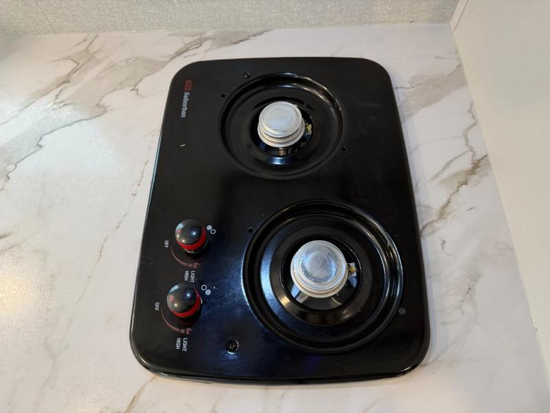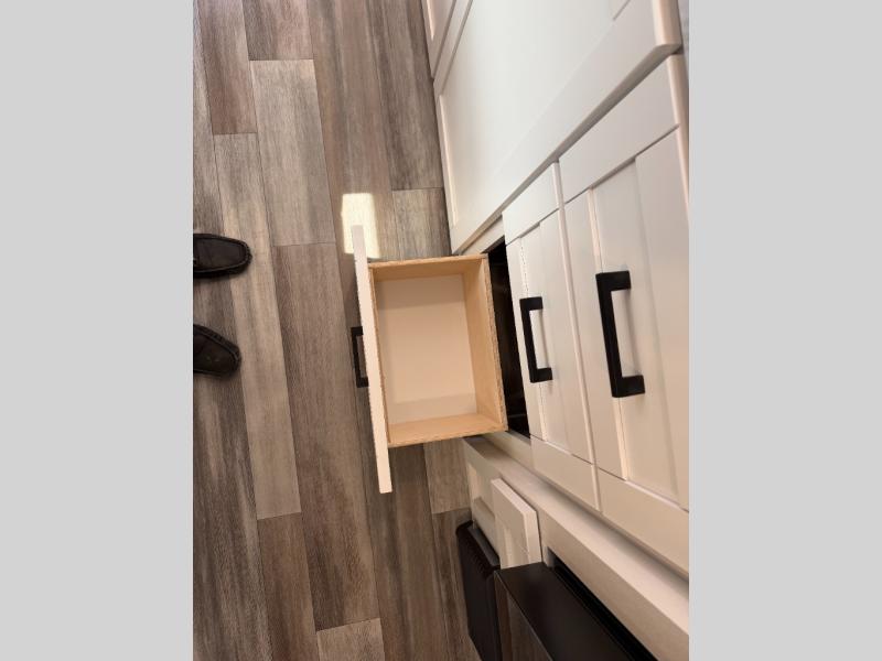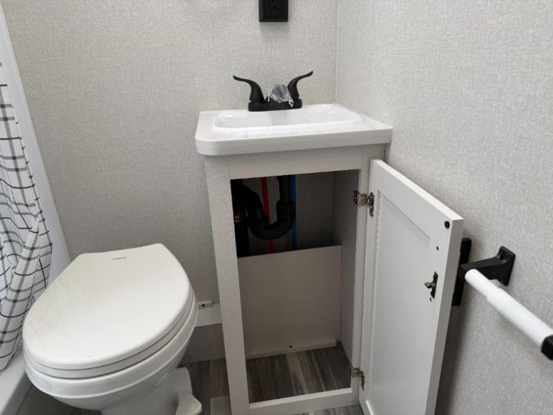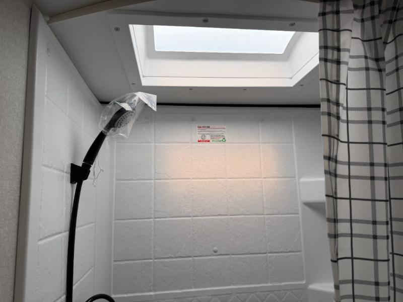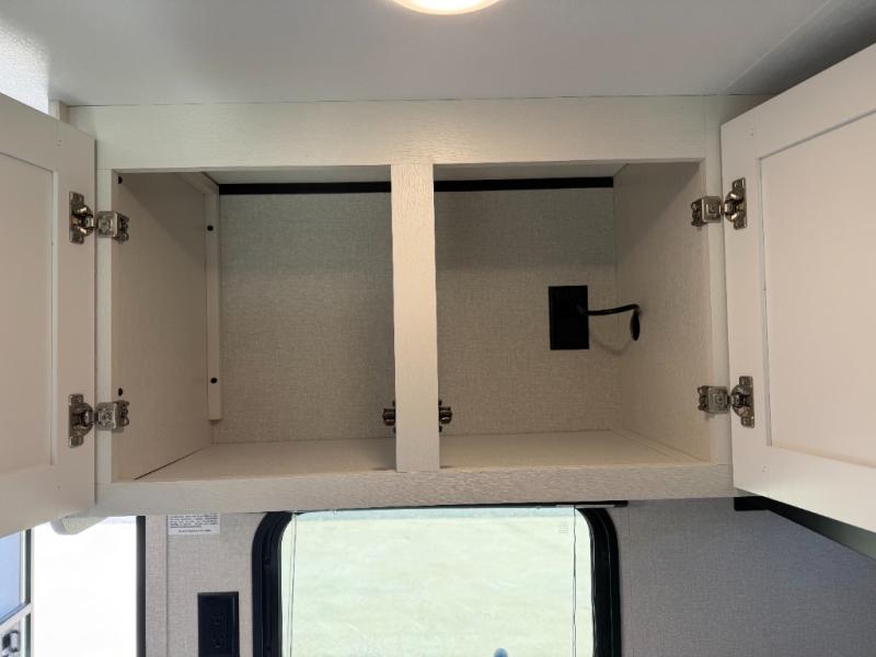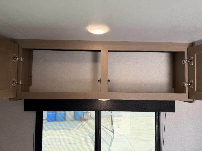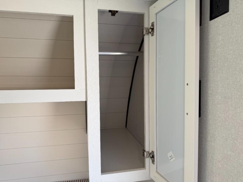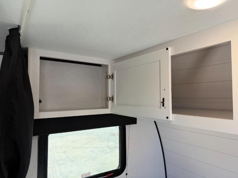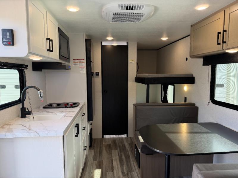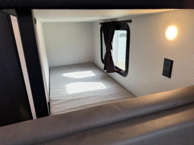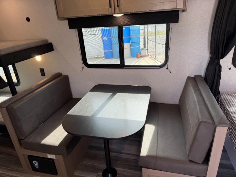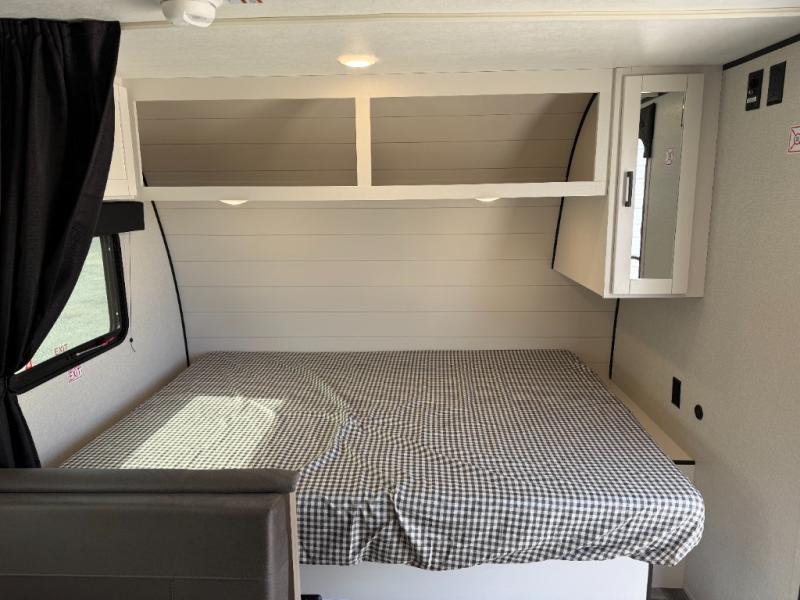 Your crew of five will love camping in this single-axle travel trailer! There are bunk beds in the rear corner and a full bath in the other rear corner for easy nighttime use. You will have the front queen bed to yourselves, along with a privacy curtain, overhead shelf, and a nightstand/wardrobe for your clothes. The booth dinette provides a place to dine, play games, and even let an extra guest stay over.