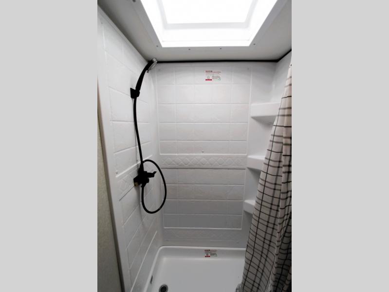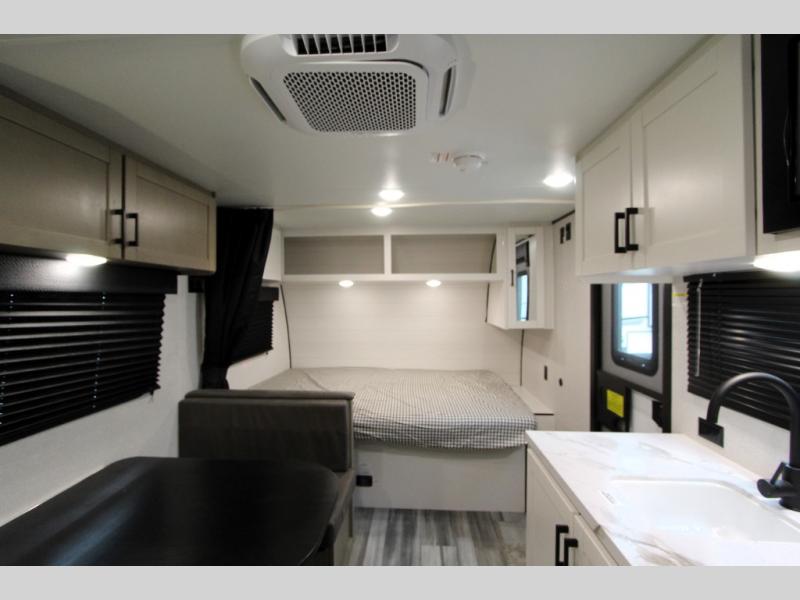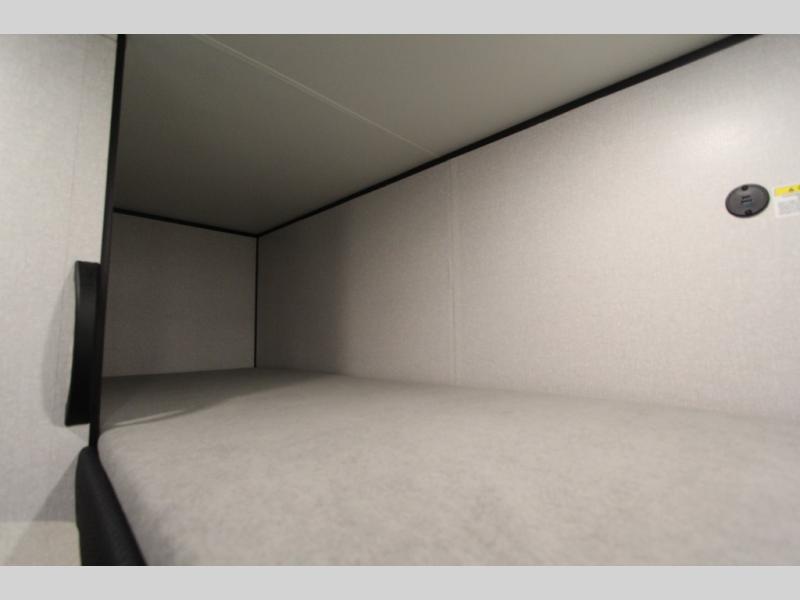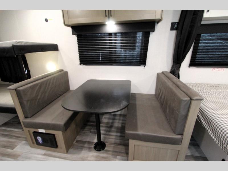 Your crew of five will love camping in this single-axle travel trailer! There are bunk beds in the rear corner and a full bath in the other rear corner for easy nighttime use. You will have the front queen bed to yourselves, along with a privacy curtain, overhead shelf, and a nightstand/wardrobe for your clothes. The booth dinette provides a place to dine, play games, and even let an extra guest stay over.