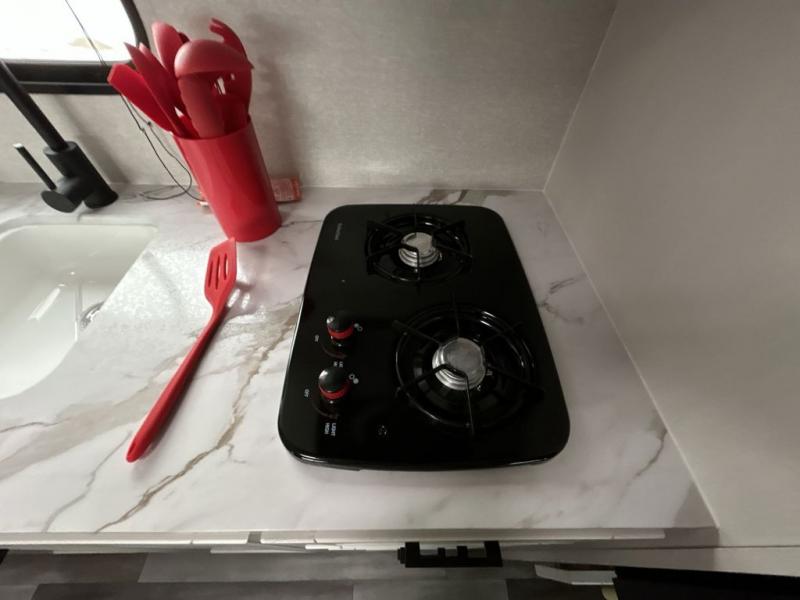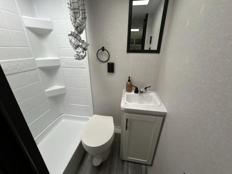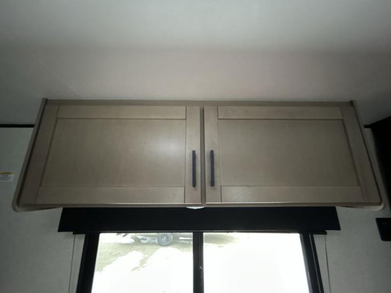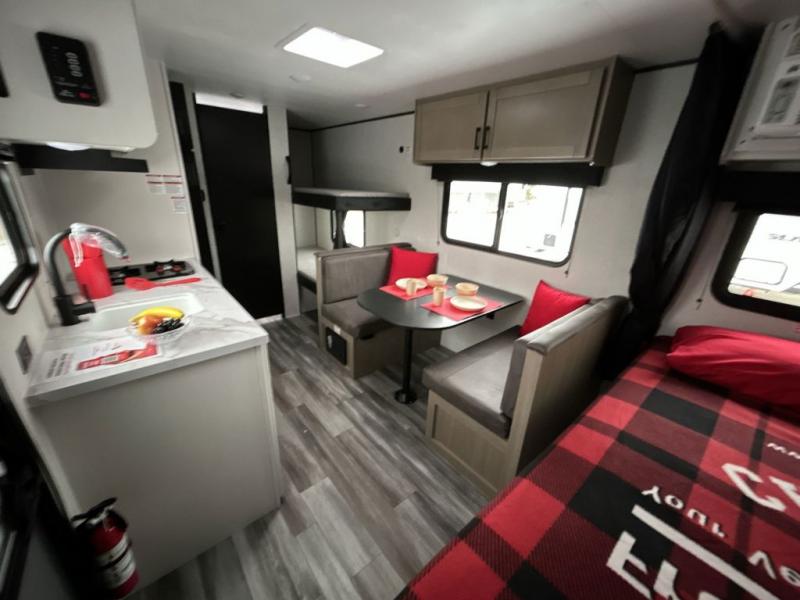 Your crew of five will love camping in this single-axle travel trailer! There are bunk beds in the rear corner and a full bath in the other rear corner for easy nighttime use. You will have the front queen bed to yourselves, along with a privacy curtain, overhead shelf, and a nightstand/wardrobe for your clothes. The booth dinette provides a place to dine, play games, and even let an extra guest stay over.