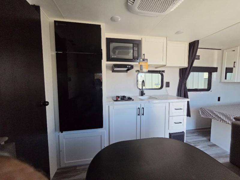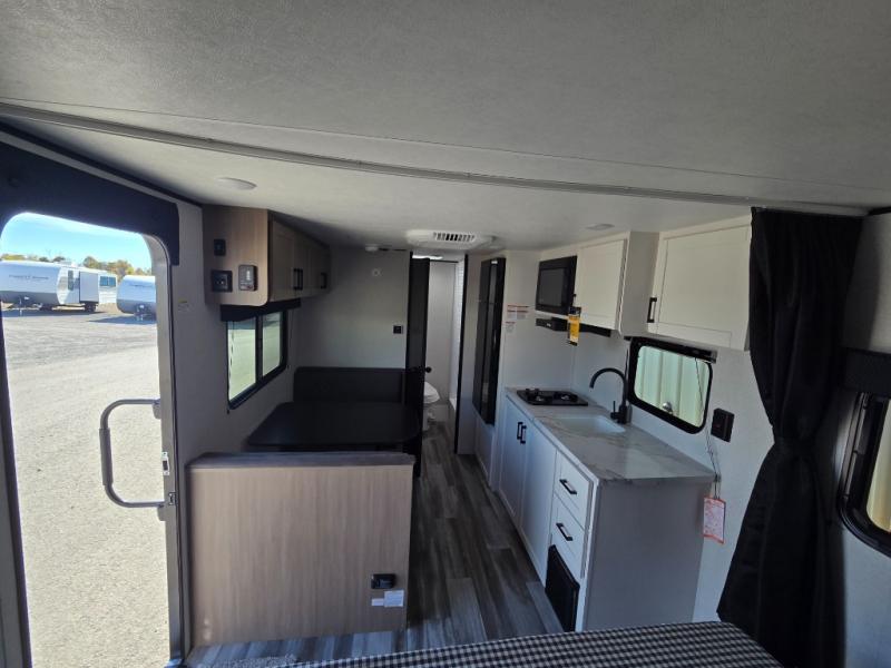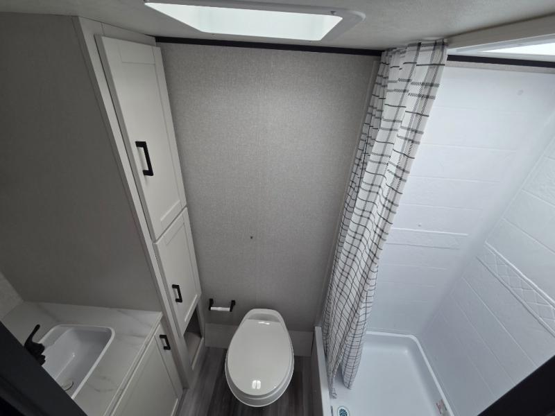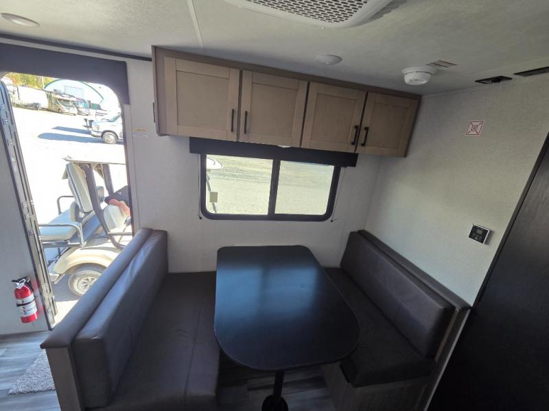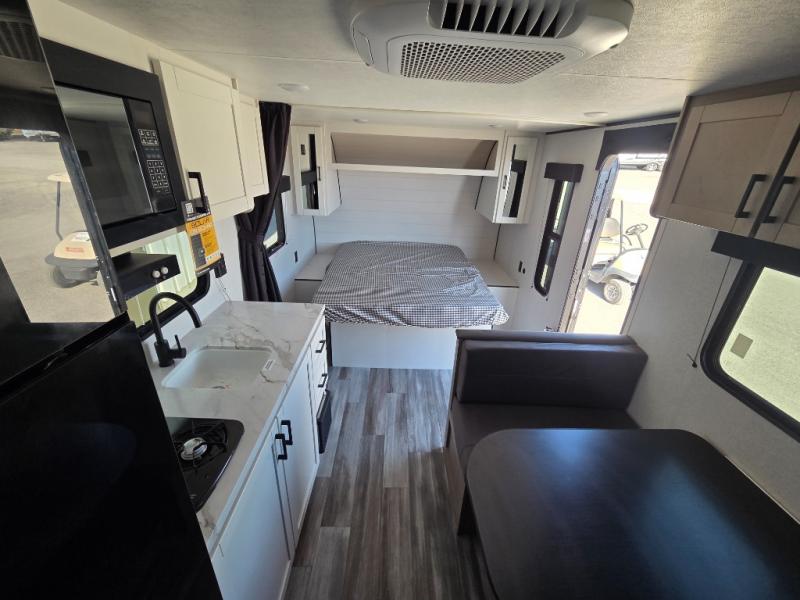 This travel trailer includes everything you need for fun trips at the lake. When you arrive at the campground, you can unload the exterior storage, then put out the 12' power awning with LED lights. There is also an LP Quick Connect if you want to hook up your own grill! The booth dinette inside will provide a place to dine together, and the full rear bath with a tub/shower will make bath time easier than ever for little ones. A front RV queen bed will provide a great night's rest, and the privacy curtain will be appreciated when you're getting dressed in the morning.