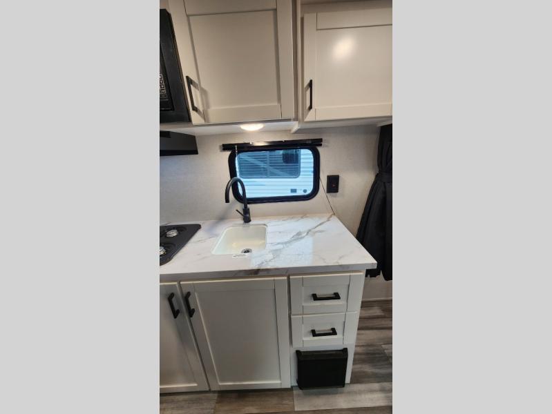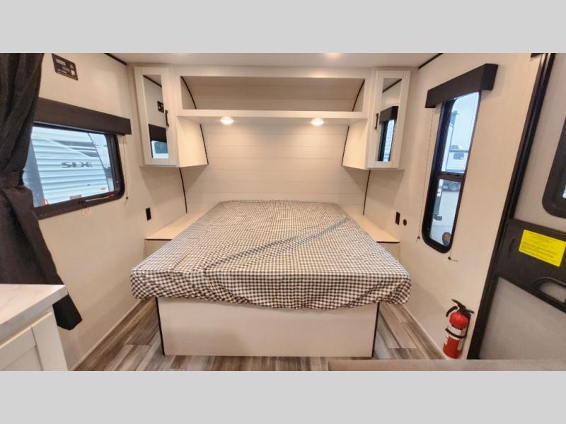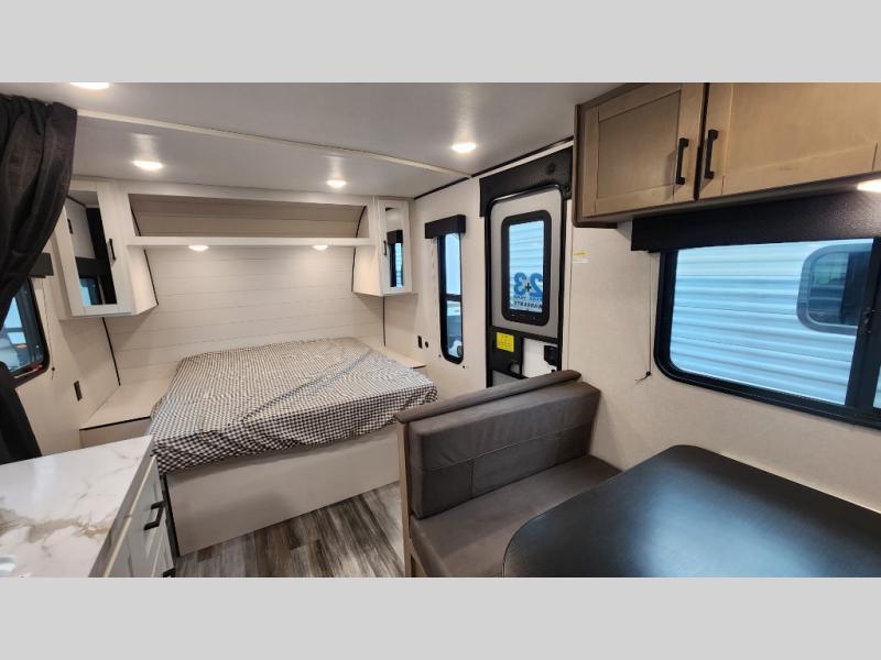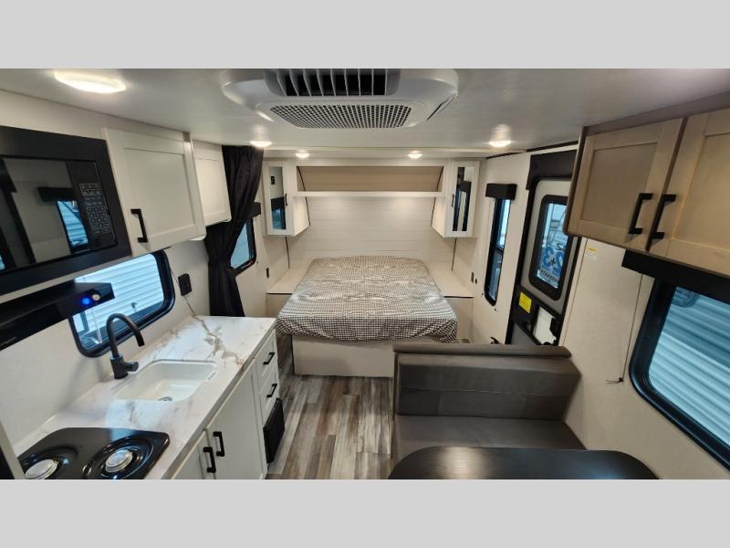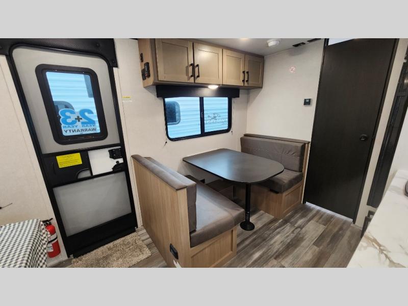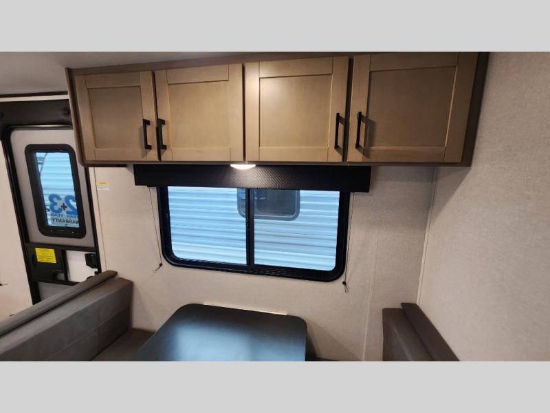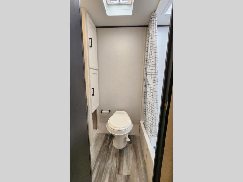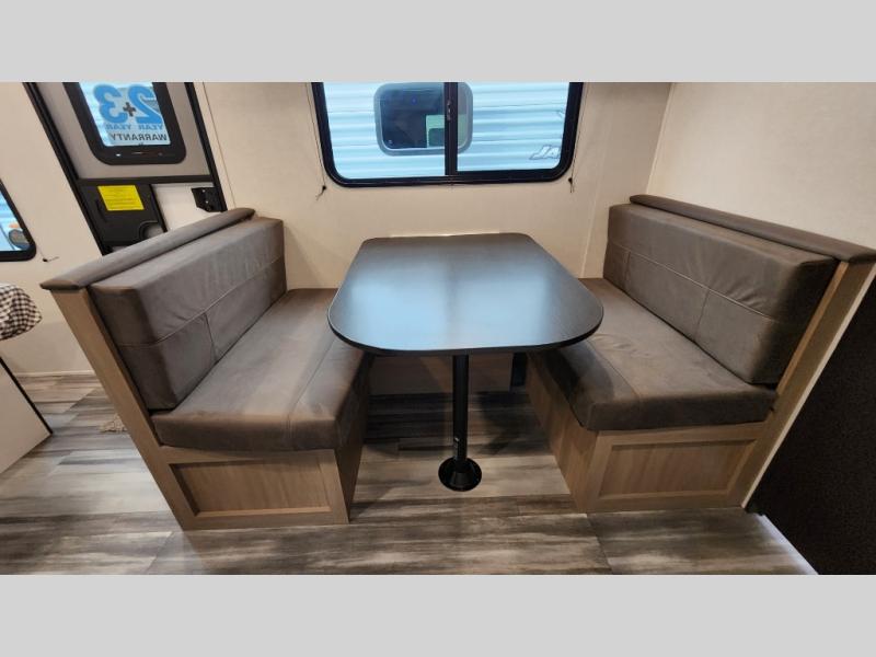 This travel trailer includes everything you need for fun trips at the lake. When you arrive at the campground, you can unload the exterior storage, then put out the 12' power awning with LED lights. There is also an LP Quick Connect if you want to hook up your own grill! The booth dinette inside will provide a place to dine together, and the full rear bath with a tub/shower will make bath time easier than ever for little ones. A front RV queen bed will provide a great night's rest, and the privacy curtain will be appreciated when you're getting dressed in the morning.