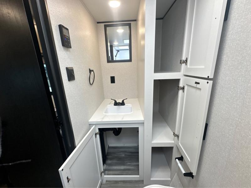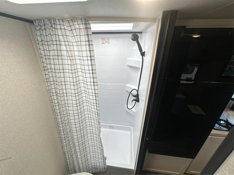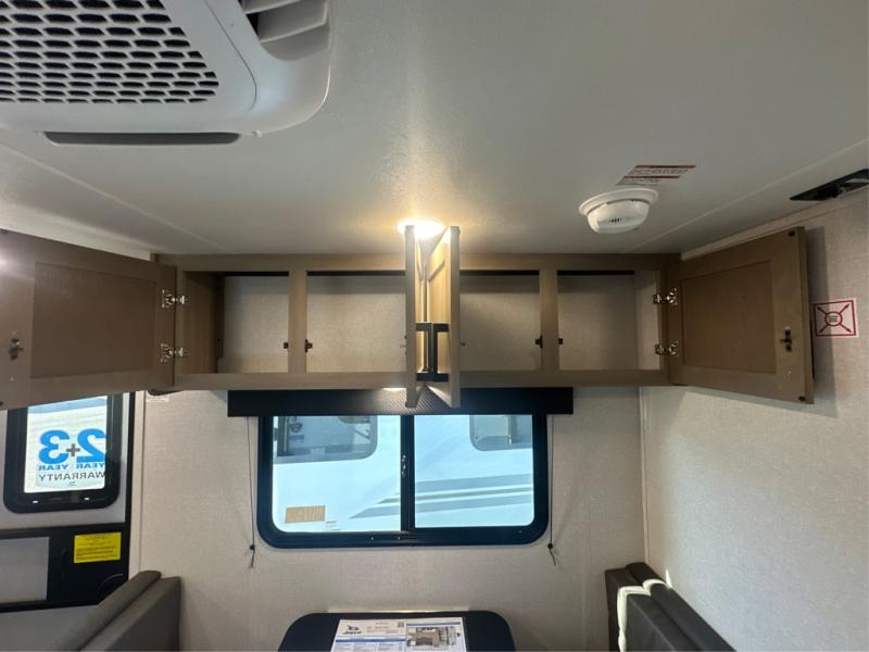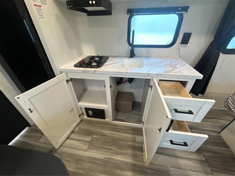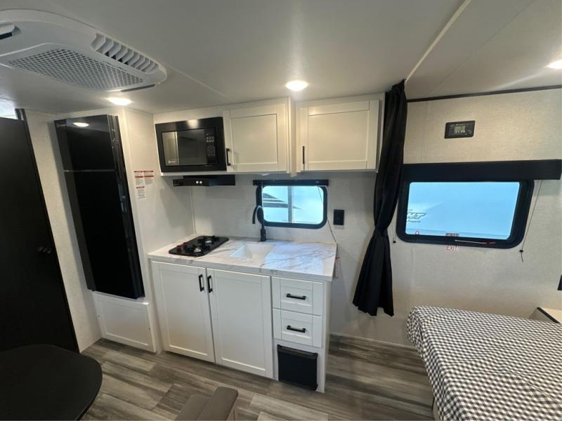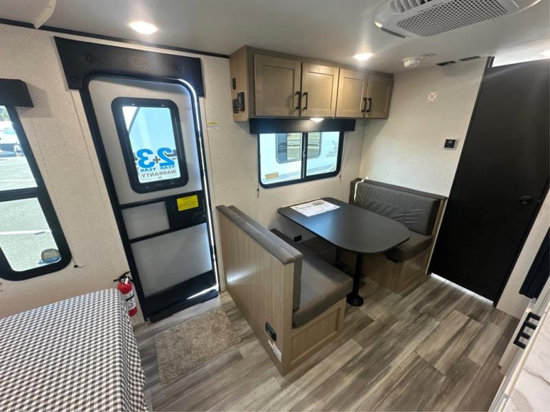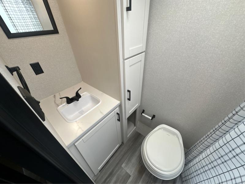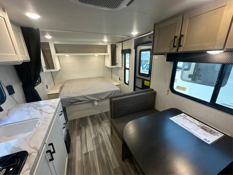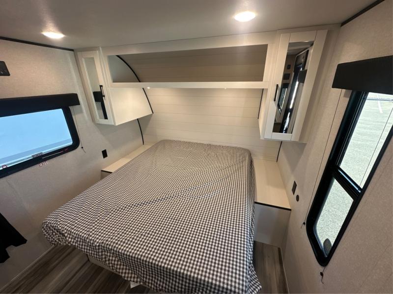 This travel trailer includes everything you need for fun trips at the lake. When you arrive at the campground, you can unload the exterior storage, then put out the 12' power awning with LED lights. There is also an LP Quick Connect if you want to hook up your own grill! The booth dinette inside will provide a place to dine together, and the full rear bath with a tub/shower will make bath time easier than ever for little ones. A front RV queen bed will provide a great night's rest, and the privacy curtain will be appreciated when you're getting dressed in the morning.