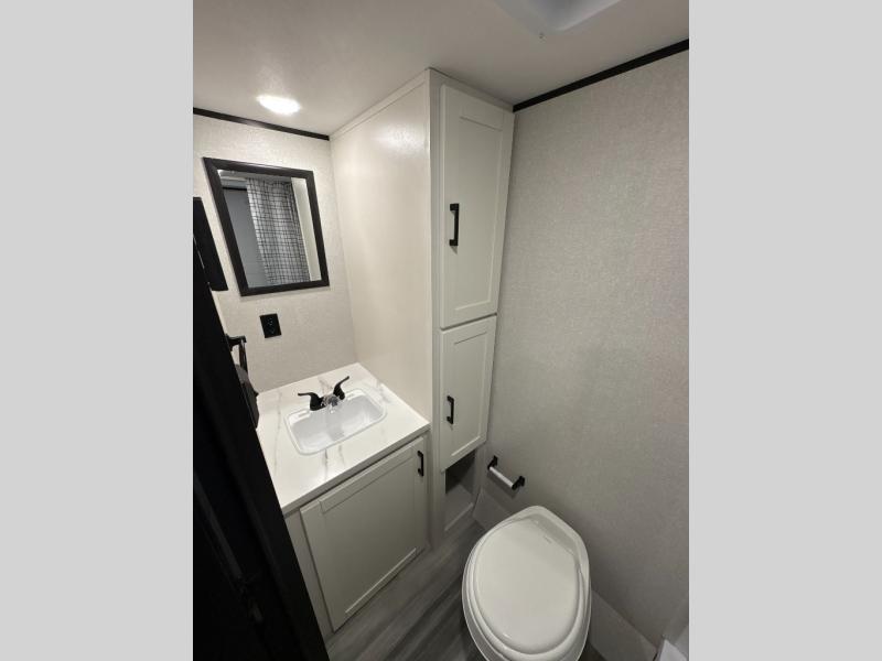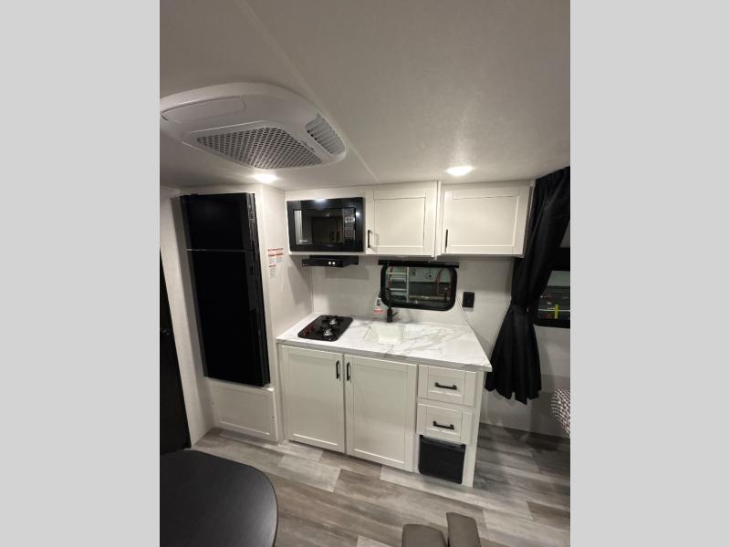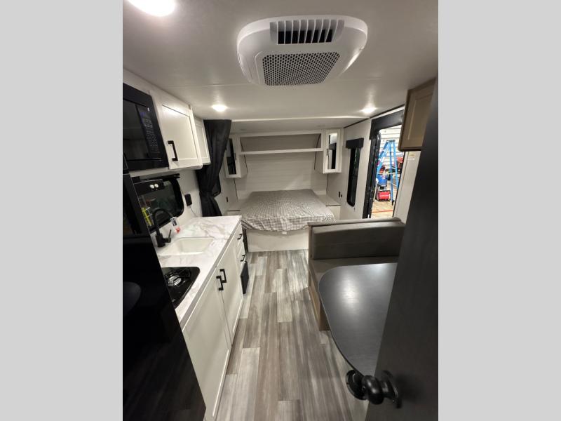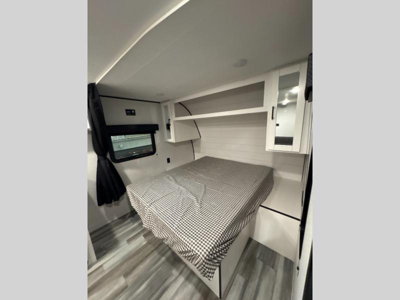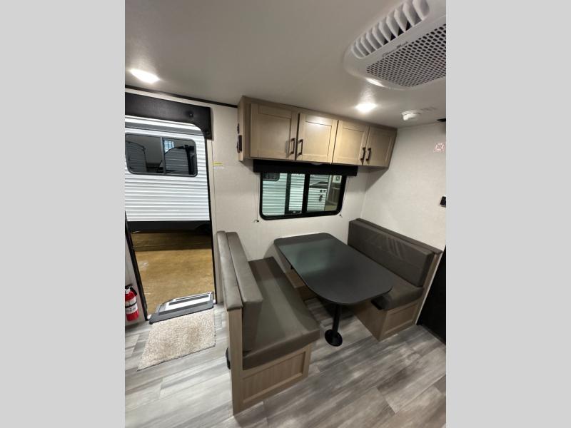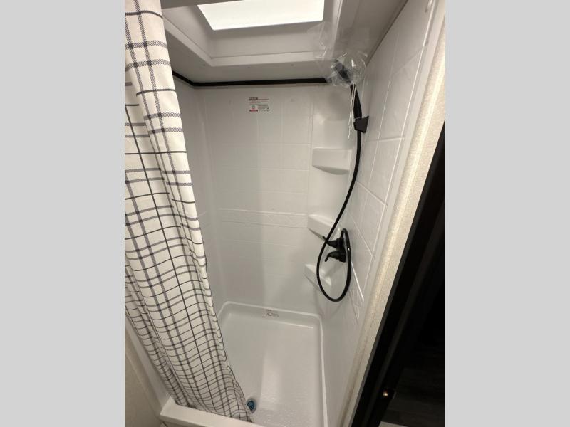 This travel trailer includes everything you need for fun trips at the lake. When you arrive at the campground, you can unload the exterior storage, then put out the 12' power awning with LED lights. There is also an LP Quick Connect if you want to hook up your own grill! The booth dinette inside will provide a place to dine together, and the full rear bath with a tub/shower will make bath time easier than ever for little ones. A front RV queen bed will provide a great night's rest, and the privacy curtain will be appreciated when you're getting dressed in the morning.
