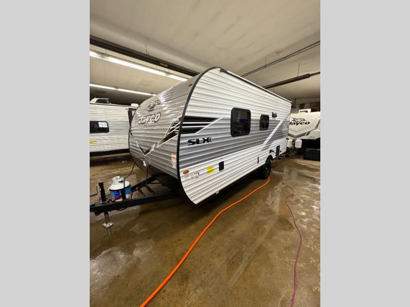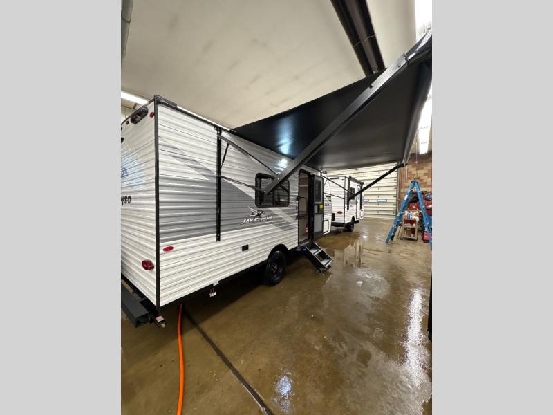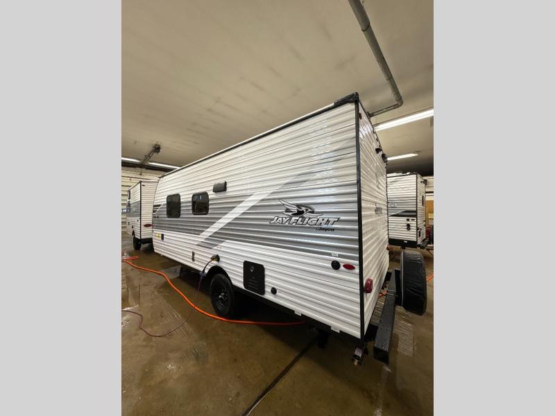 The Jayco Jay Flight SLX travel trailer is quite easy to own because it is lightweight for an easier towing experience. Built on a fully integrated A-frame with galvanized-steel, impact-resistant wheel wells, the Jay Flight SLX has quality at its very foundation. That quality continues on to the electric self-adjusting brakes, easy-lube hubs, Magnum Truss roof system, and LP quick connect. Some of what the mandatory Customer Value Package includes is backup camera prep, Keyed-Alike entry and baggage doors, and an on-demand tankless water heater.
