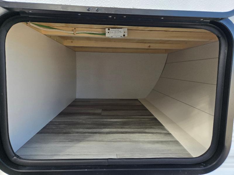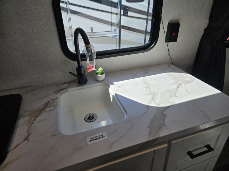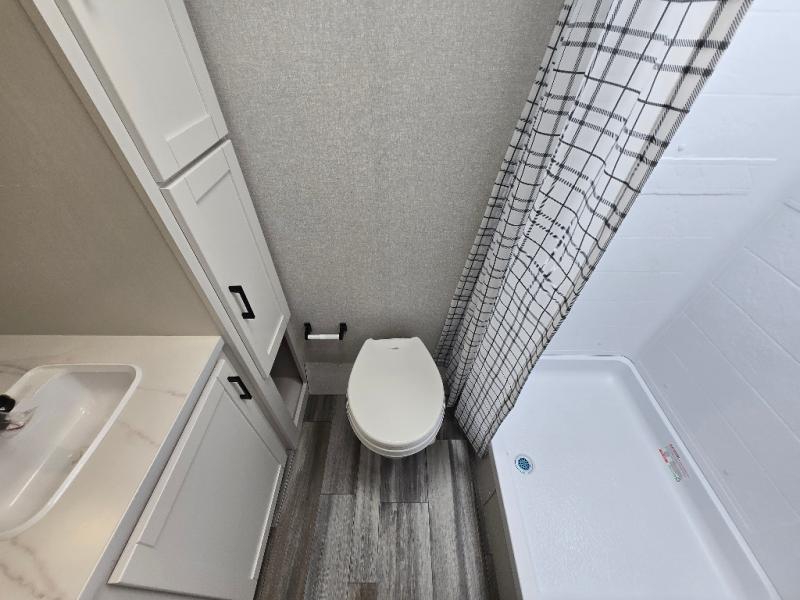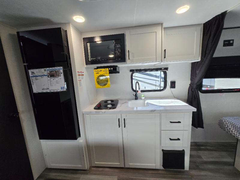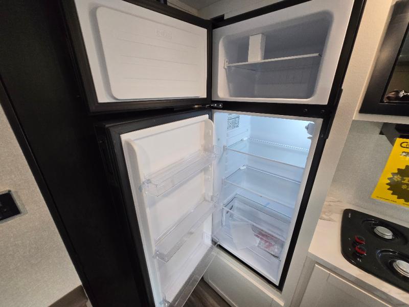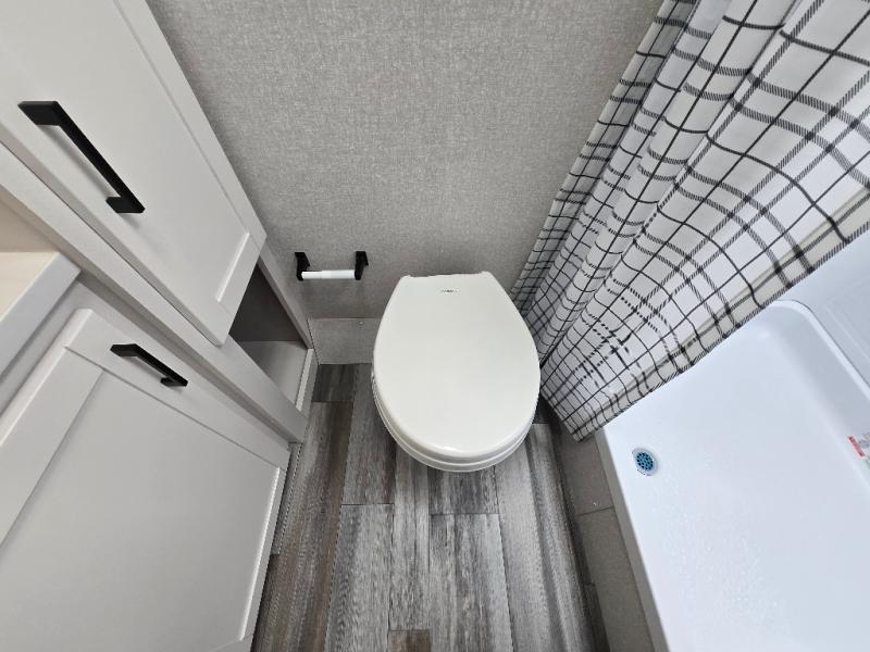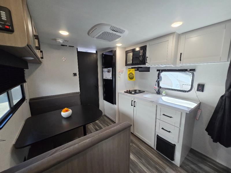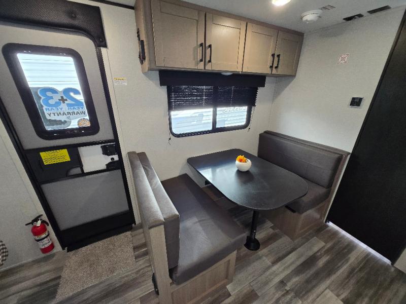 This travel trailer includes everything you need for fun trips at the lake. When you arrive at the campground, you can unload the exterior storage, then put out the 12' power awning with LED lights. There is also an LP Quick Connect if you want to hook up your own grill! The booth dinette inside will provide a place to dine together, and the full rear bath with a tub/shower will make bath time easier than ever for little ones. A front RV queen bed will provide a great night's rest, and the privacy curtain will be appreciated when you're getting dressed in the morning.