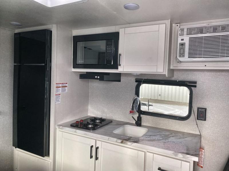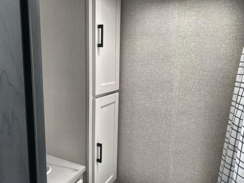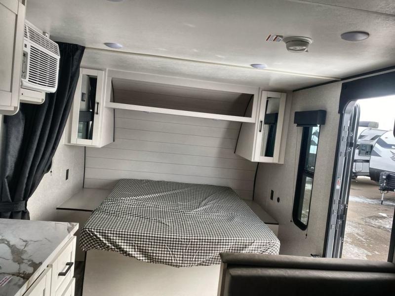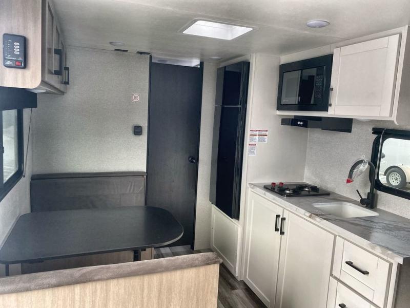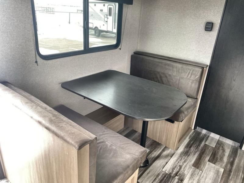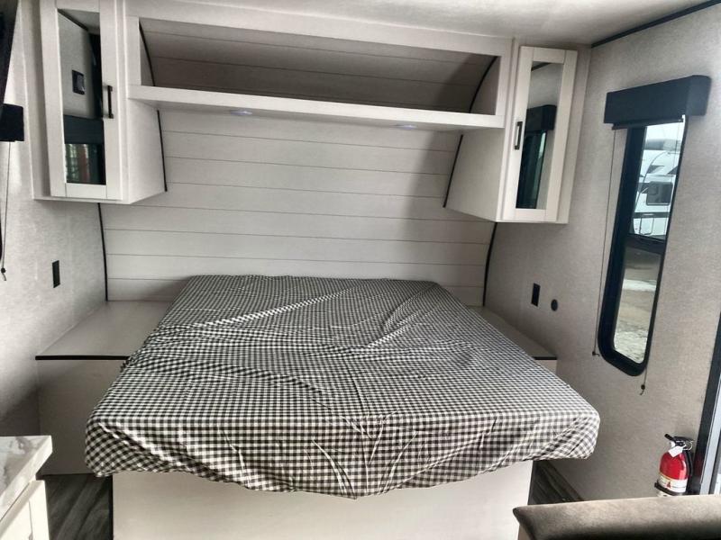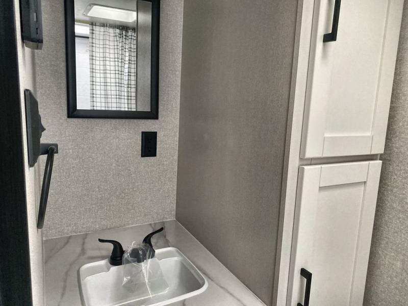 This travel trailer includes everything you need for fun trips at the lake. When you arrive at the campground, you can unload the exterior storage, then put out the 12' power awning with LED lights. There is also an LP Quick Connect if you want to hook up your own grill! The booth dinette inside will provide a place to dine together, and the full rear bath with a tub/shower will make bath time easier than ever for little ones. A front RV queen bed will provide a great night's rest, and the privacy curtain will be appreciated when you're getting dressed in the morning.