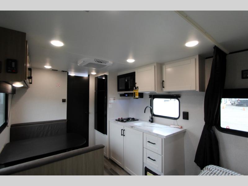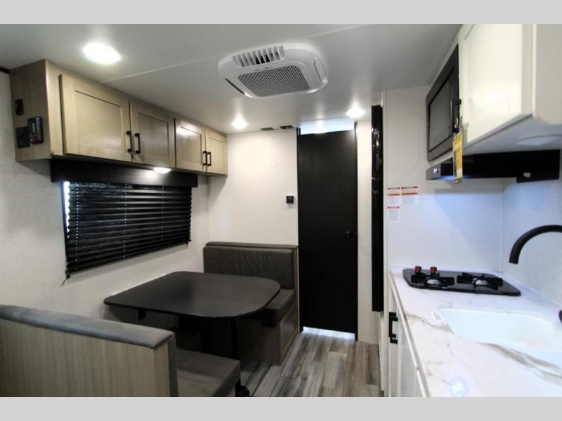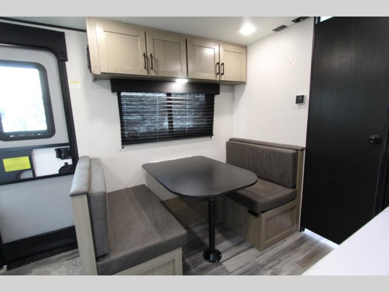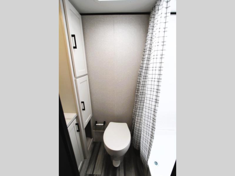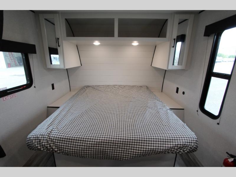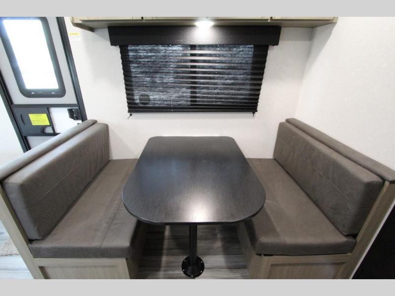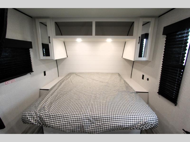 This travel trailer includes everything you need for fun trips at the lake. When you arrive at the campground, you can unload the exterior storage, then put out the 12' power awning with LED lights. There is also an LP Quick Connect if you want to hook up your own grill! The booth dinette inside will provide a place to dine together, and the full rear bath with a tub/shower will make bath time easier than ever for little ones. A front RV queen bed will provide a great night's rest, and the privacy curtain will be appreciated when you're getting dressed in the morning.
