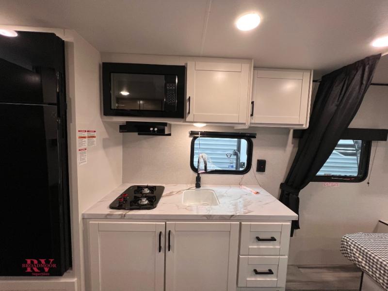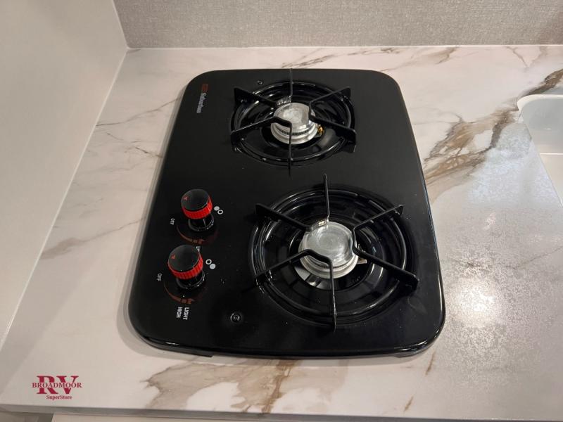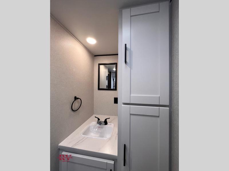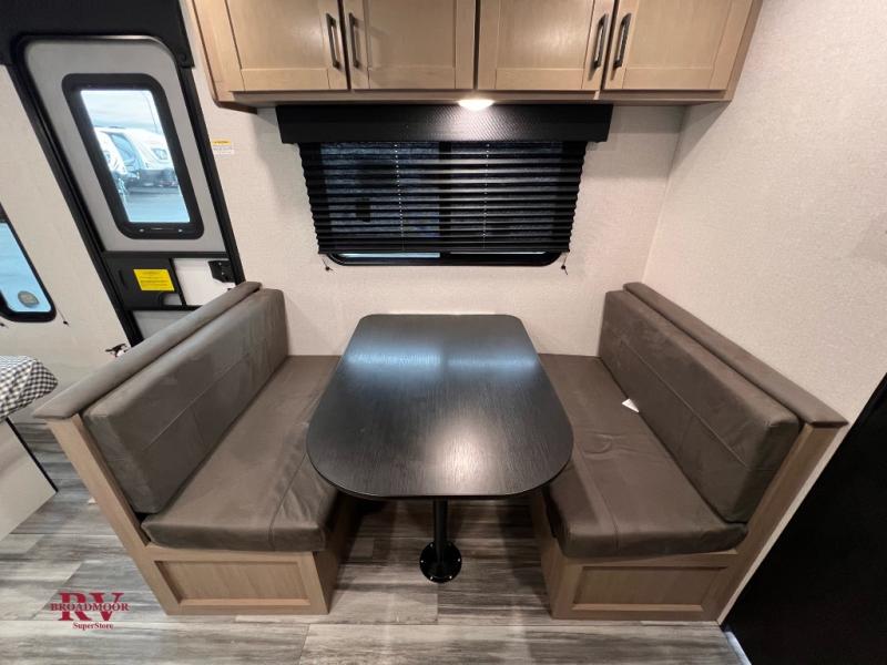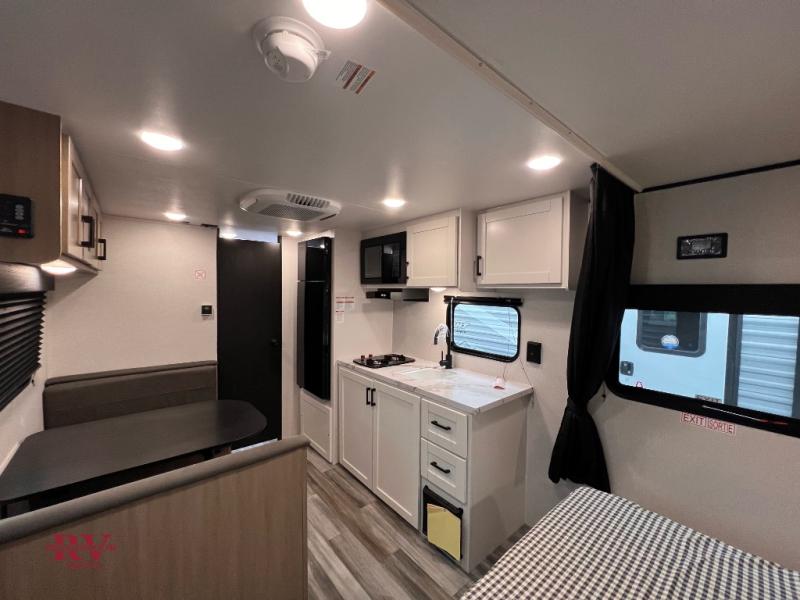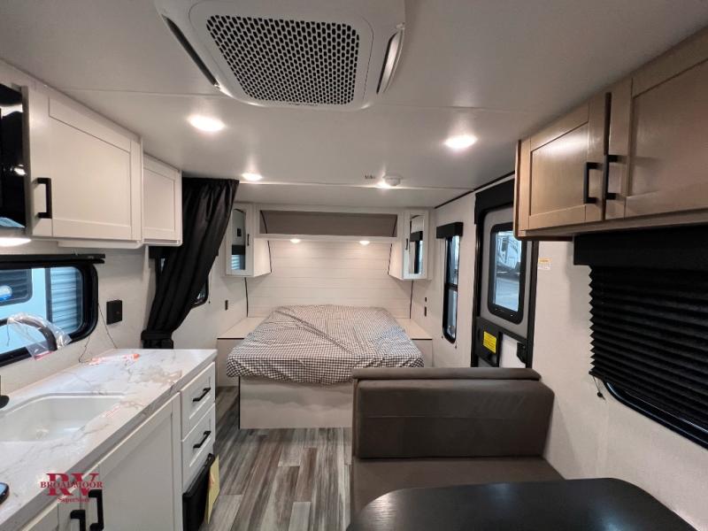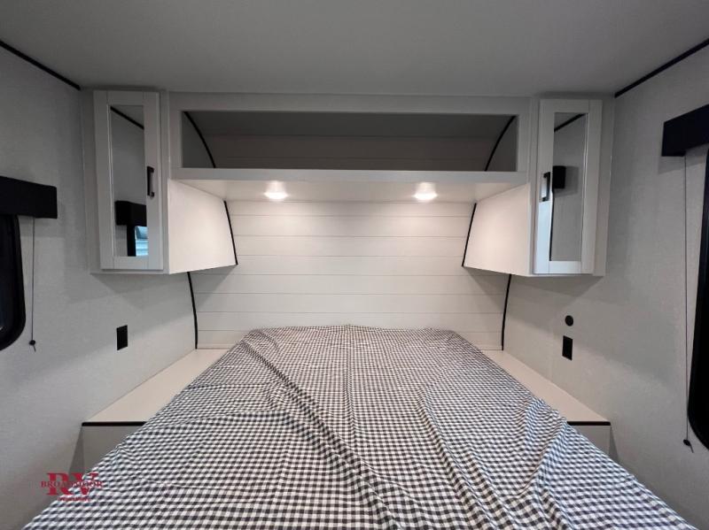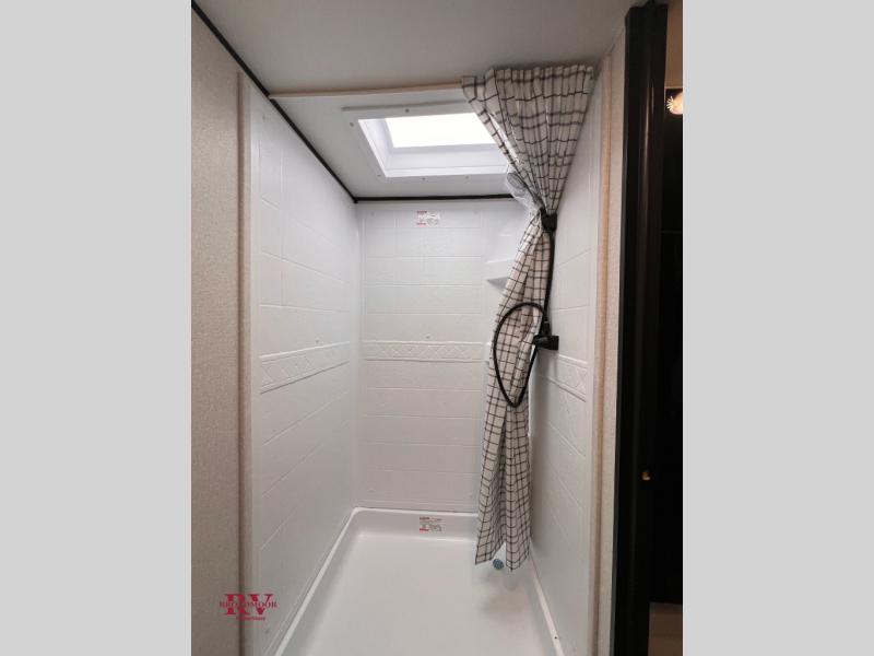 This travel trailer includes everything you need for fun trips at the lake. When you arrive at the campground, you can unload the exterior storage, then put out the 12' power awning with LED lights. There is also an LP Quick Connect if you want to hook up your own grill! The booth dinette inside will provide a place to dine together, and the full rear bath with a tub/shower will make bath time easier than ever for little ones. A front RV queen bed will provide a great night's rest, and the privacy curtain will be appreciated when you're getting dressed in the morning.
