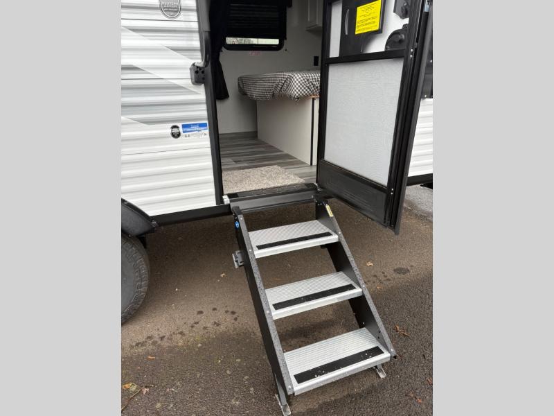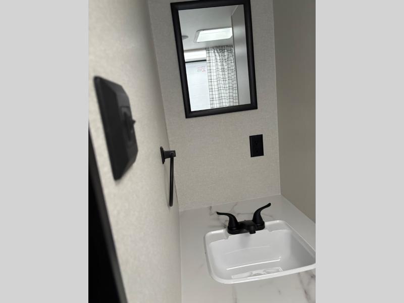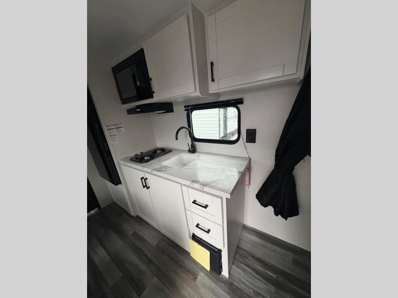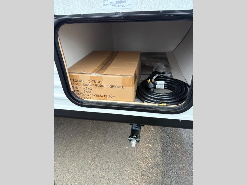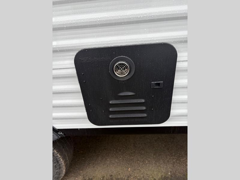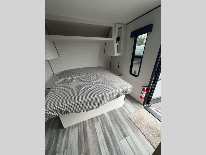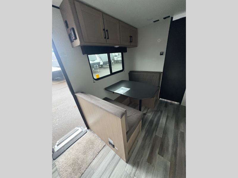 This travel trailer includes everything you need for fun trips at the lake. When you arrive at the campground, you can unload the exterior storage, then put out the 12' power awning with LED lights. There is also an LP Quick Connect if you want to hook up your own grill! The booth dinette inside will provide a place to dine together, and the full rear bath with a tub/shower will make bath time easier than ever for little ones. A front RV queen bed will provide a great night's rest, and the privacy curtain will be appreciated when you're getting dressed in the morning.