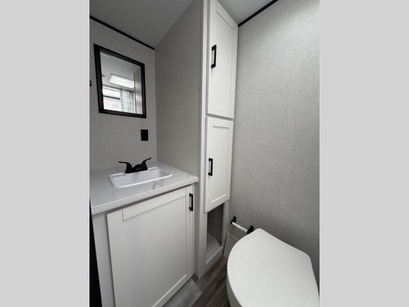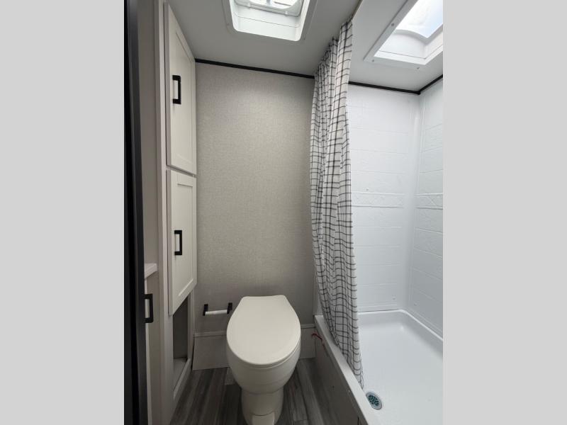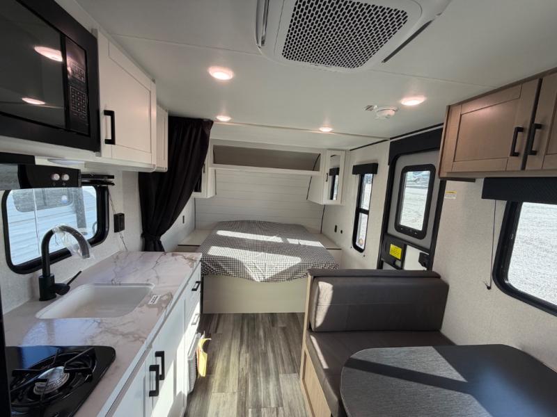 This travel trailer includes everything you need for fun trips at the lake. When you arrive at the campground, you can unload the exterior storage, then put out the 12' power awning with LED lights. There is also an LP Quick Connect if you want to hook up your own grill! The booth dinette inside will provide a place to dine together, and the full rear bath with a tub/shower will make bath time easier than ever for little ones. A front RV queen bed will provide a great night's rest, and the privacy curtain will be appreciated when you're getting dressed in the morning.