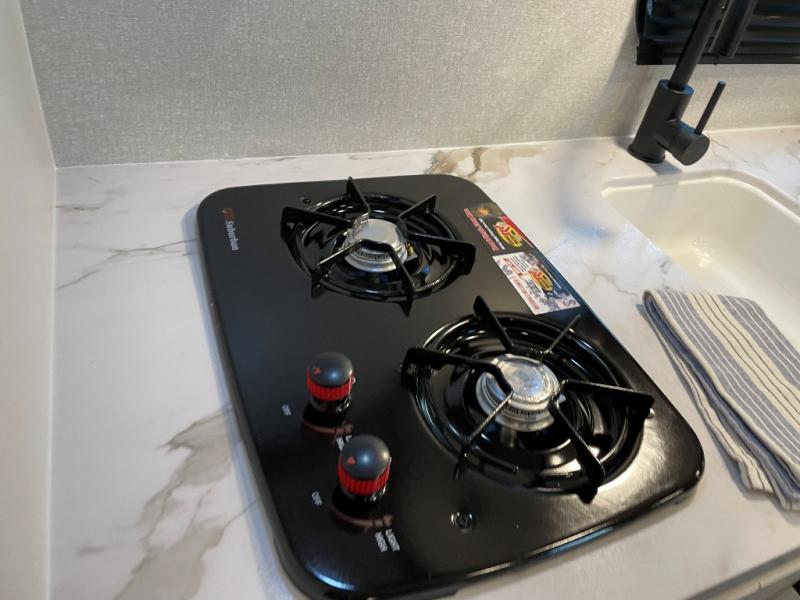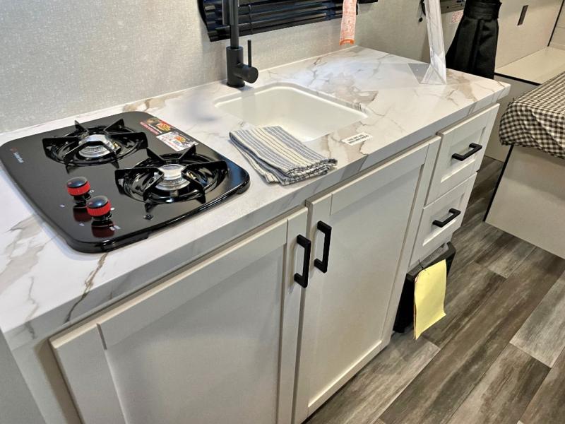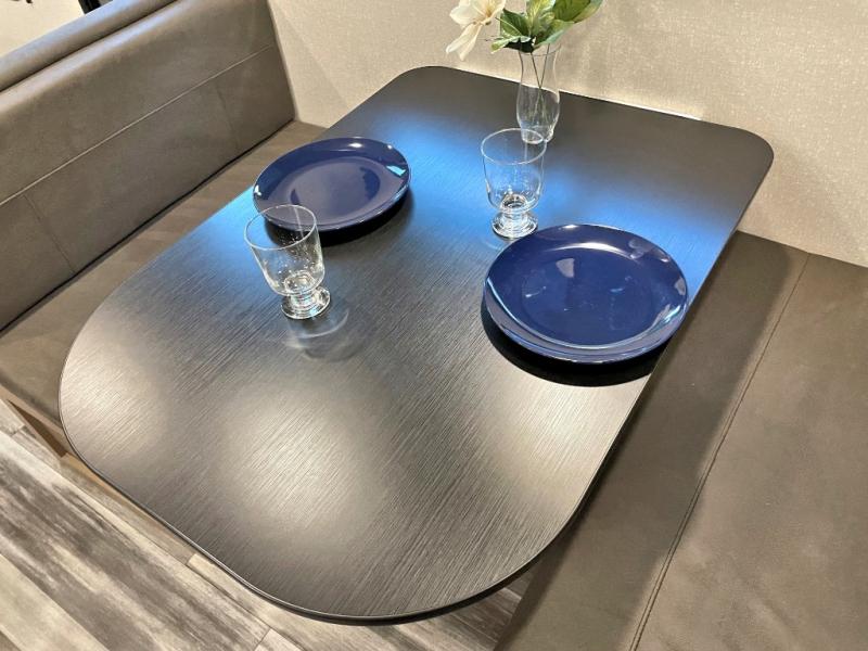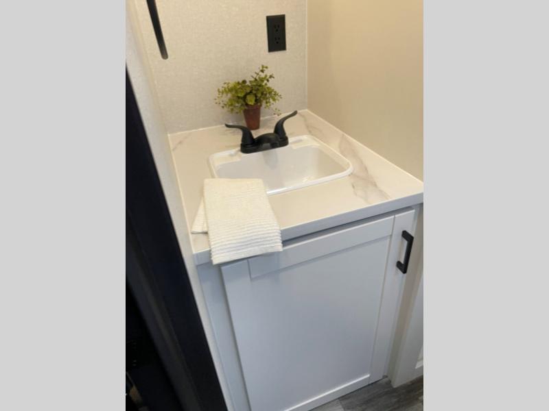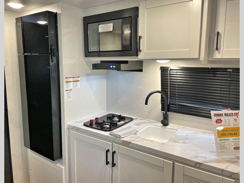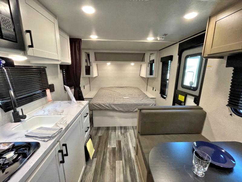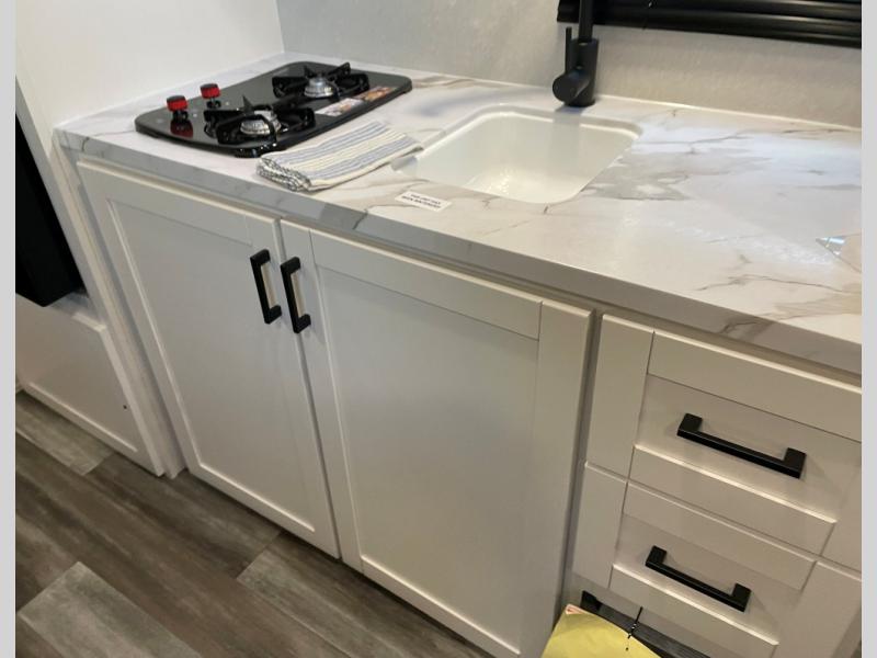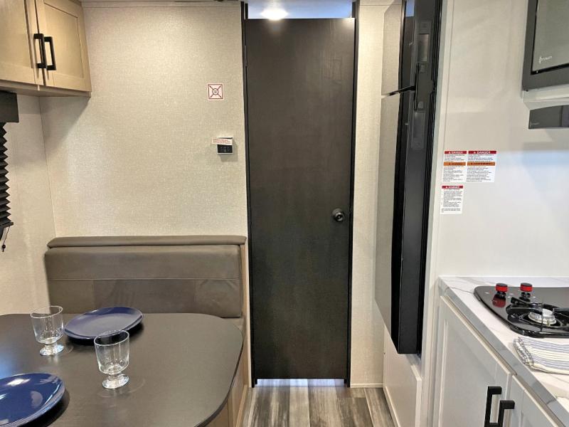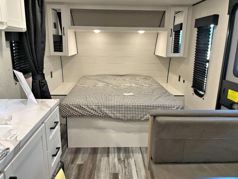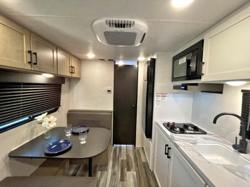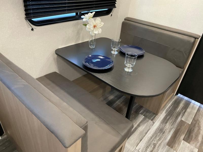 This travel trailer includes everything you need for fun trips at the lake. When you arrive at the campground, you can unload the exterior storage, then put out the 12' power awning with LED lights. There is also an LP Quick Connect if you want to hook up your own grill! The booth dinette inside will provide a place to dine together, and the full rear bath with a tub/shower will make bath time easier than ever for little ones. A front RV queen bed will provide a great night's rest, and the privacy curtain will be appreciated when you're getting dressed in the morning.