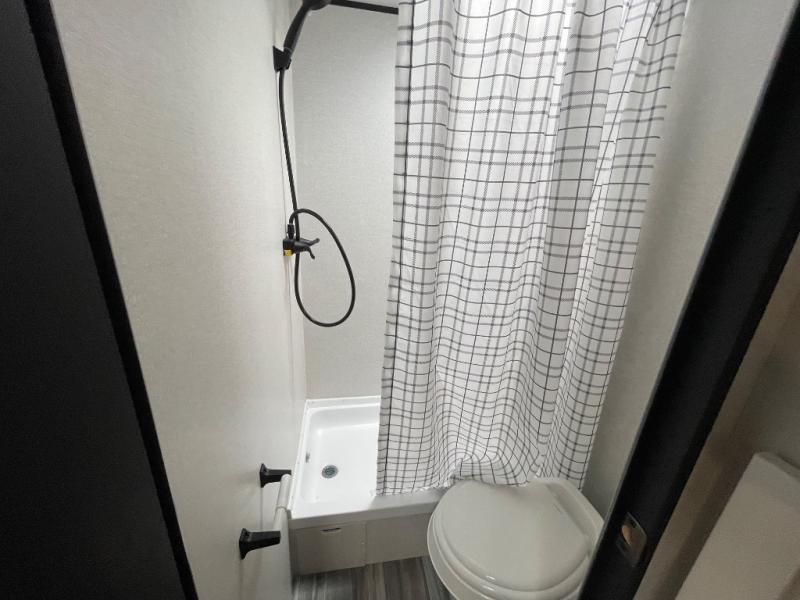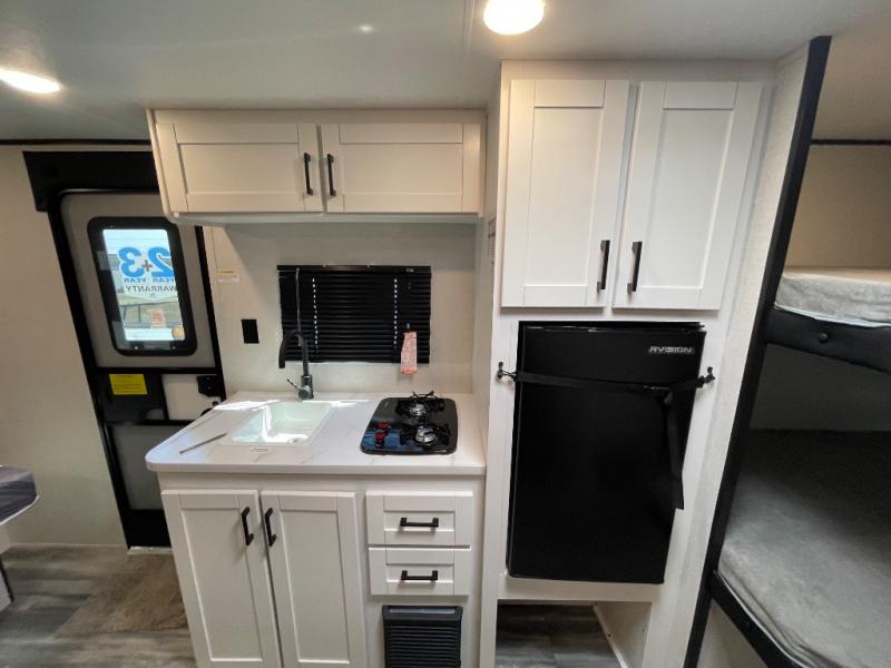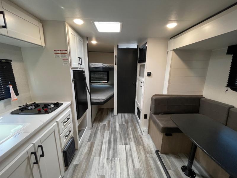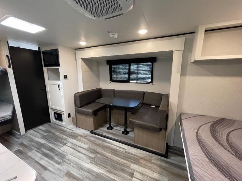 Your crew of eight will love camping in this travel trailer! There are double-size bunk beds in the rear corner and a private bath in the other rear corner for easy nighttime use. You will have the front queen bed to yourselves, along with an overhead shelf and a nightstand for your things. And the U-shaped dinette provides a place to dine, play games, and even let more guests sleep over. The Customer Value Package on this Sport Edition model includes a 19K BTU furnace, stabilizer jacks, a power awning, an entry door with a window and shade prep, and many more stand-out features!