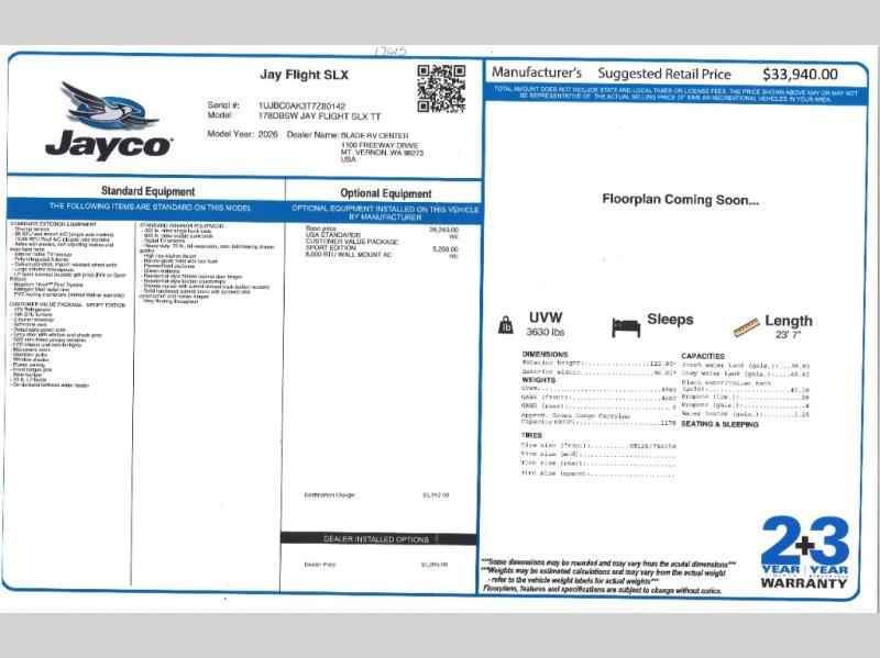 New 2026 Jayco Jay Flight SLX 178DBSW Travel Trailer