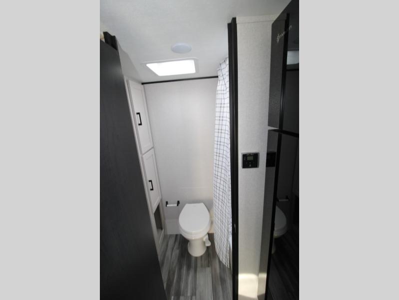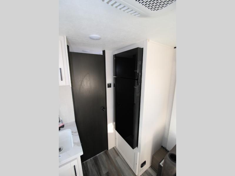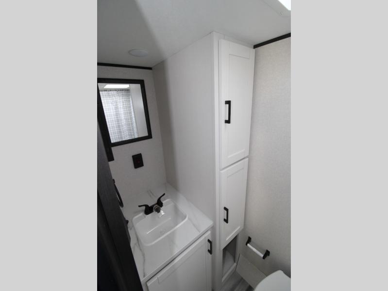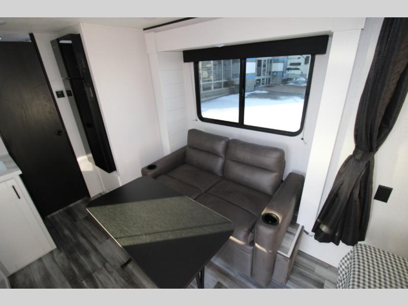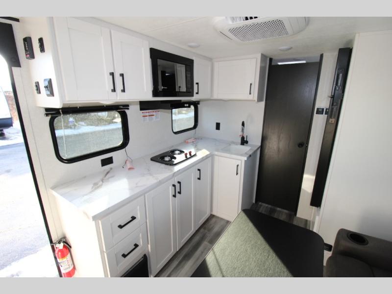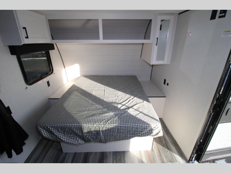 You will love camping in this lightweight, yet spacious travel trailer! There is a front bedroom with a privacy curtain, a walk-around 60" x 75" RV queen bed, plus an overhead shelf and a wardrobe to keep your things organized. If you have additional guests or little ones, they can sleep on the jack-knife sofa within the slide out, and there is a moveable table here as well to utilize how you wish. Generous counter space in the kitchen will let you prepare your best meals, and a full rear bath eliminates the need to leave your camper in the middle of the night!