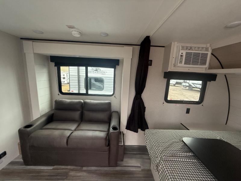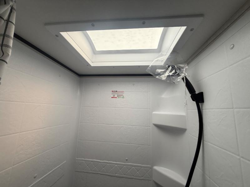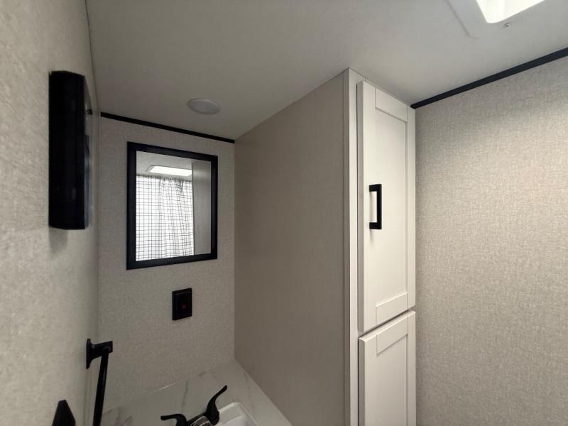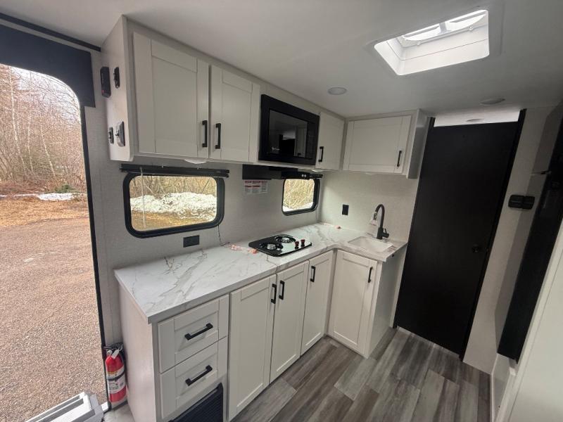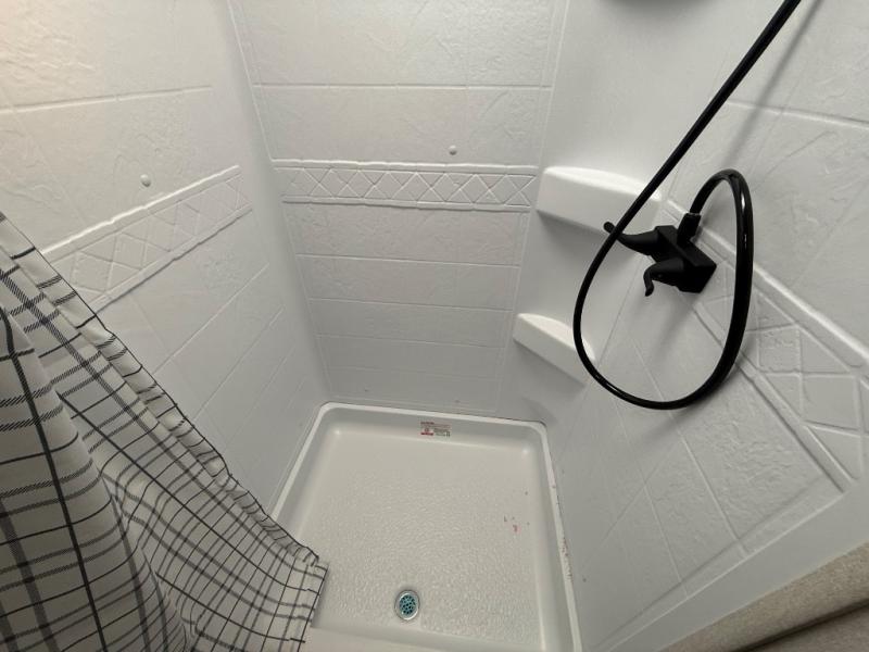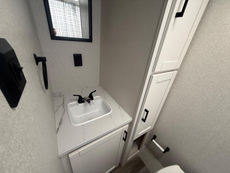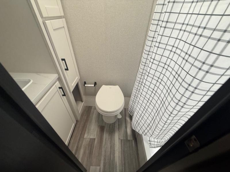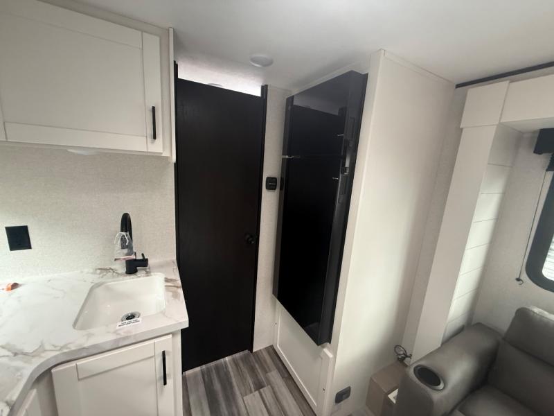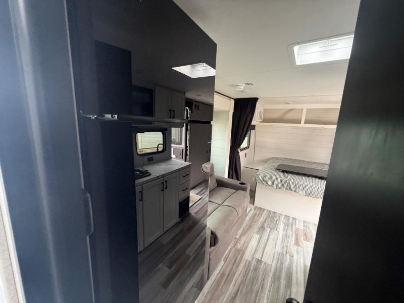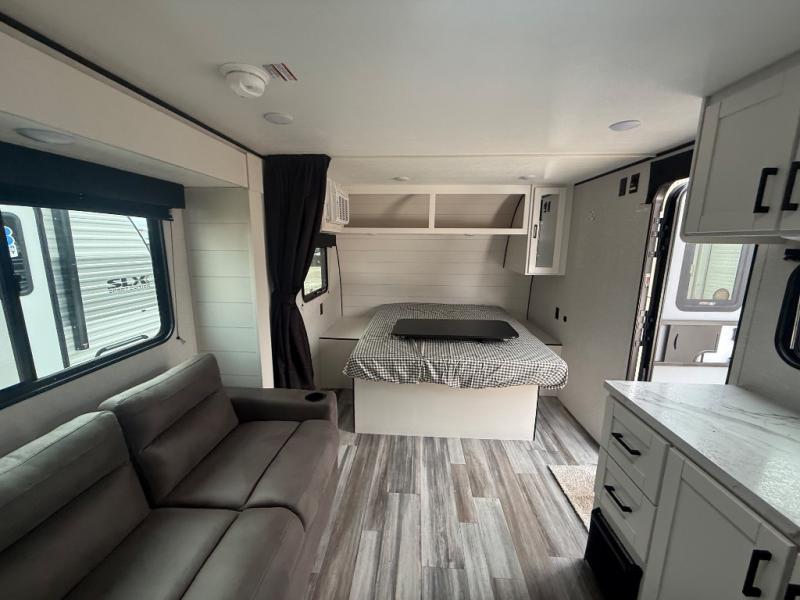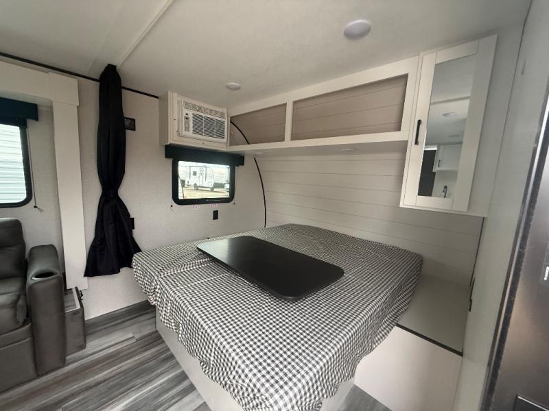 You will love camping in this lightweight, yet spacious travel trailer! There is a front bedroom with a privacy curtain, a walk-around 60" x 75" RV queen bed, plus an overhead shelf and a wardrobe to keep your things organized. If you have additional guests or little ones, they can sleep on the jack-knife sofa within the slide out, and there is a moveable table here as well to utilize how you wish. Generous counter space in the kitchen will let you prepare your best meals, and a full rear bath eliminates the need to leave your camper in the middle of the night!