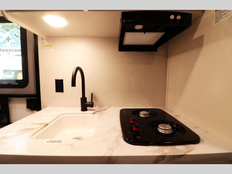 Kitchen Amenities: Includes a two-burner cooktop, microwave, range hood, high-rise kitchen faucet, solid residential-style countertops.