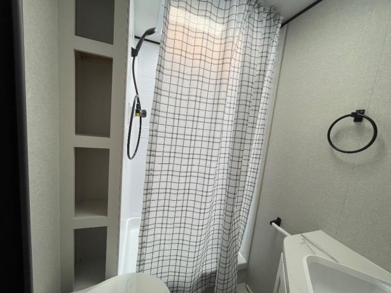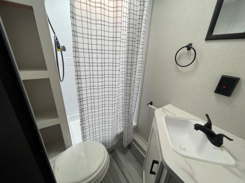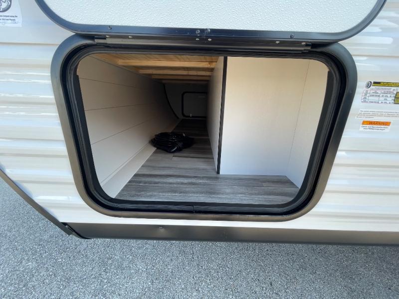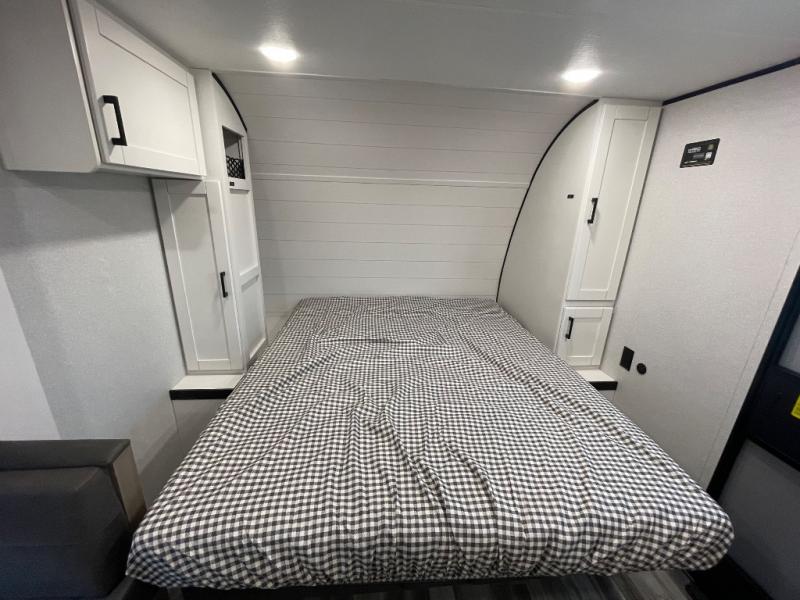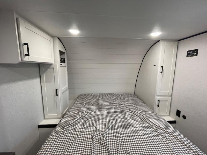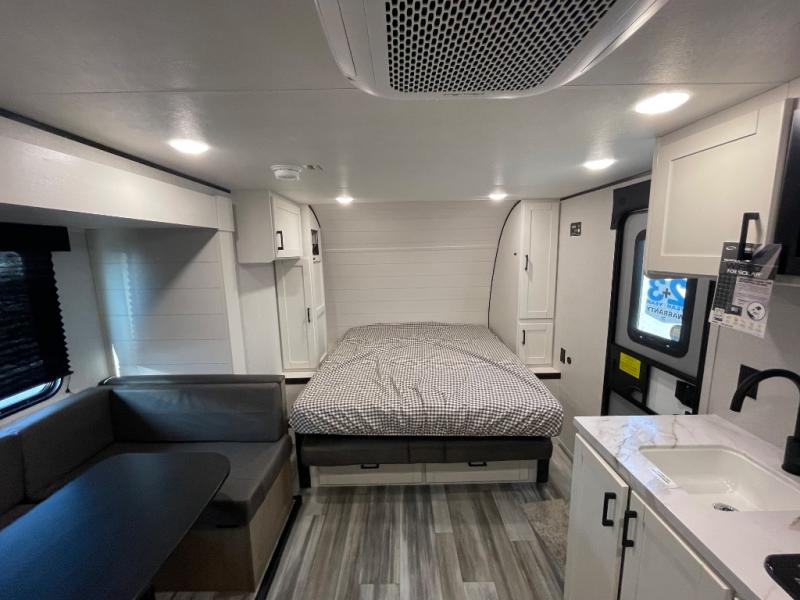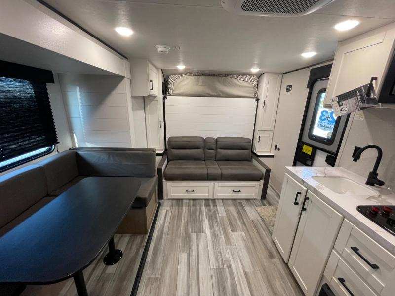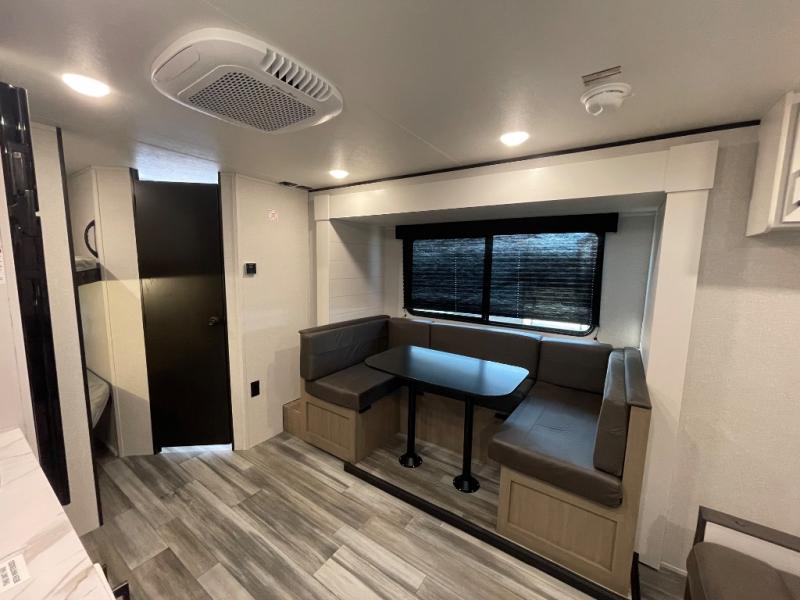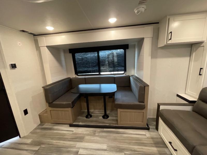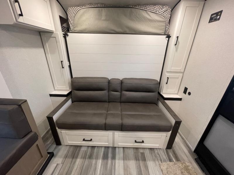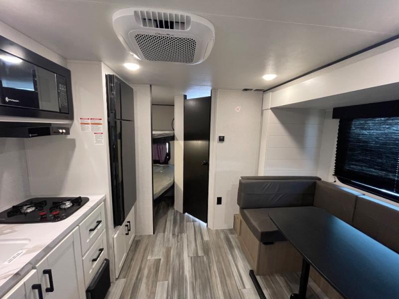 Any time spent in this travel trailer will be time well spent! You can easily sleep eight people each night thanks to the double-size bunks, front Murphy bed, and U-shaped dinette within the slide out. There is a full bath next to the bunks for easy nighttime use, and the linen closet will be perfect for clean towels. A cooktop, microwave oven, and 8 cu. ft. 12V refrigerator will let you cook and store food, and there is an overhead cabinet for spices or snacks!
