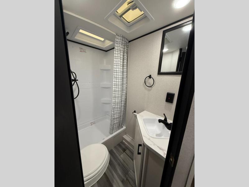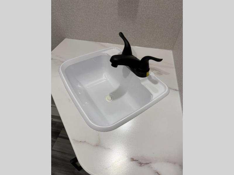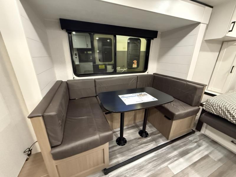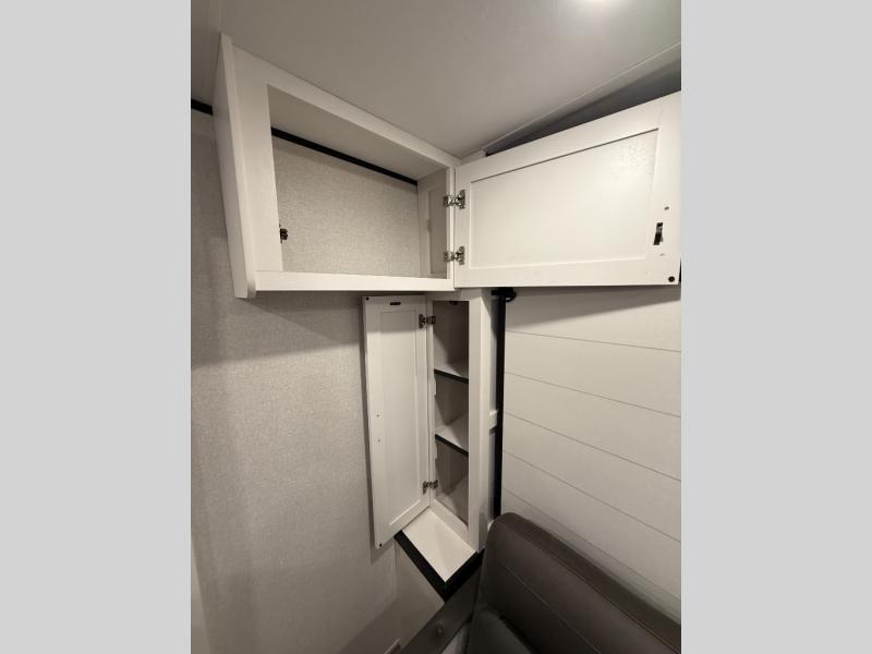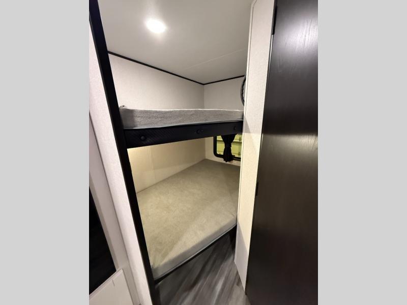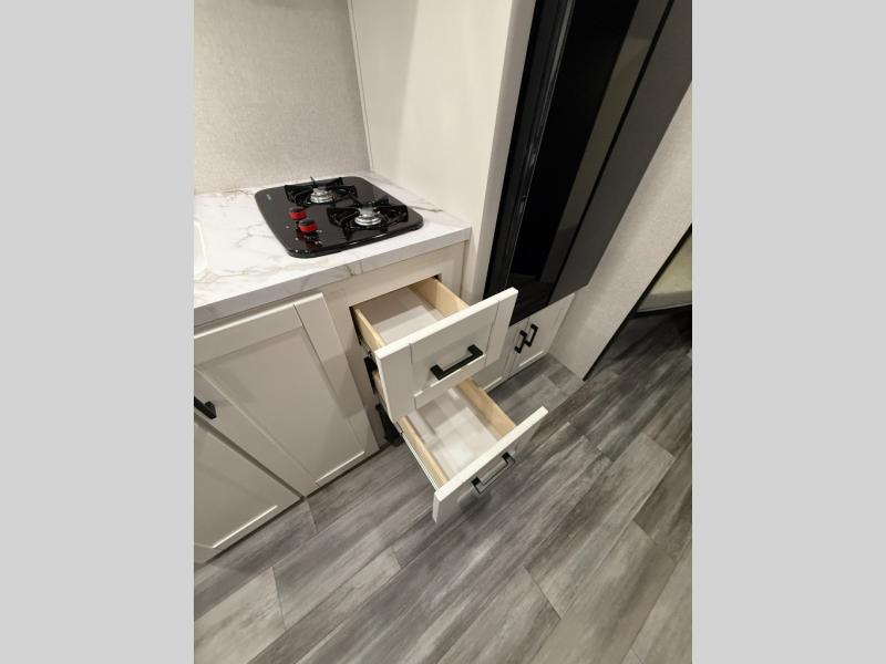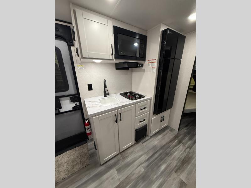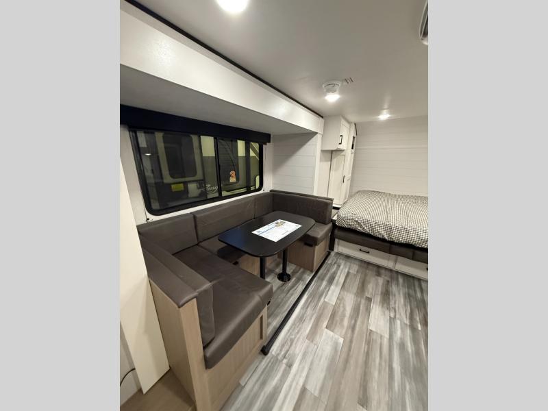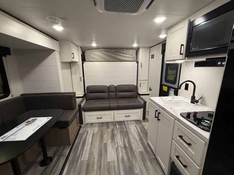 Any time spent in this travel trailer will be time well spent! You can easily sleep eight people each night thanks to the double-size bunks, front Murphy bed, and U-shaped dinette within the slide out. There is a full bath next to the bunks for easy nighttime use, and the linen closet will be perfect for clean towels. A cooktop, microwave oven, and 8 cu. ft. 12V refrigerator will let you cook and store food, and there is an overhead cabinet for spices or snacks!