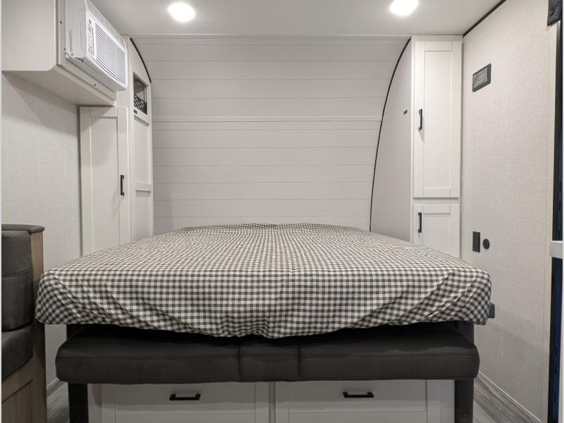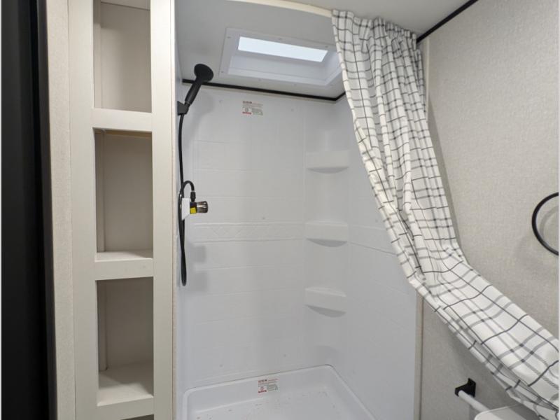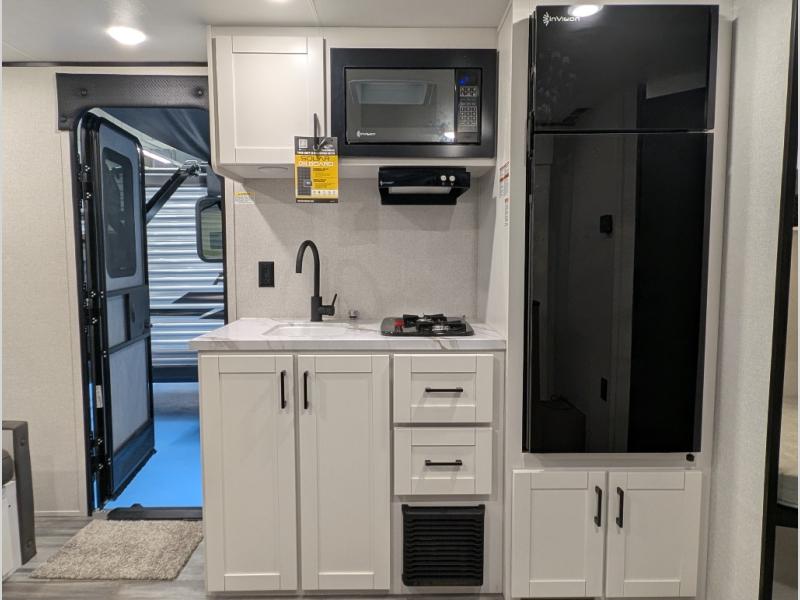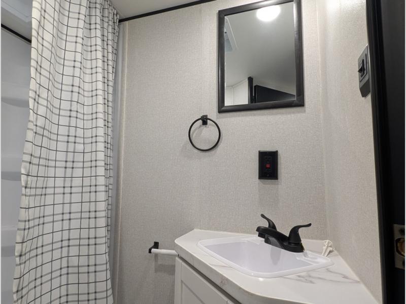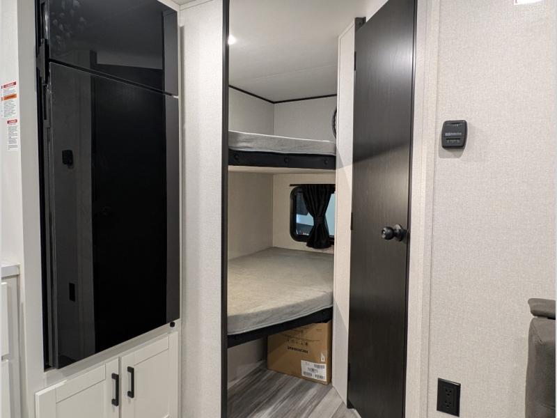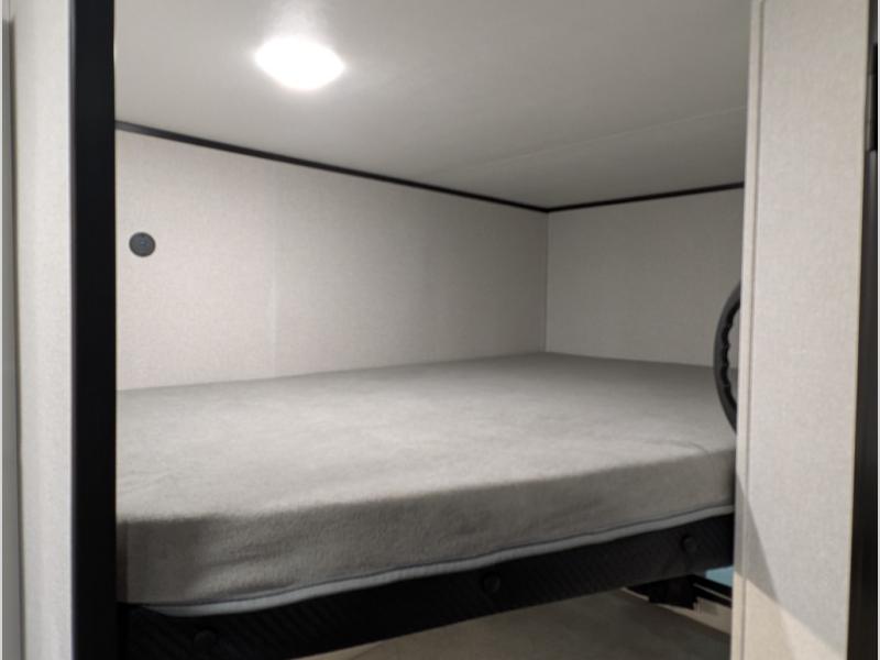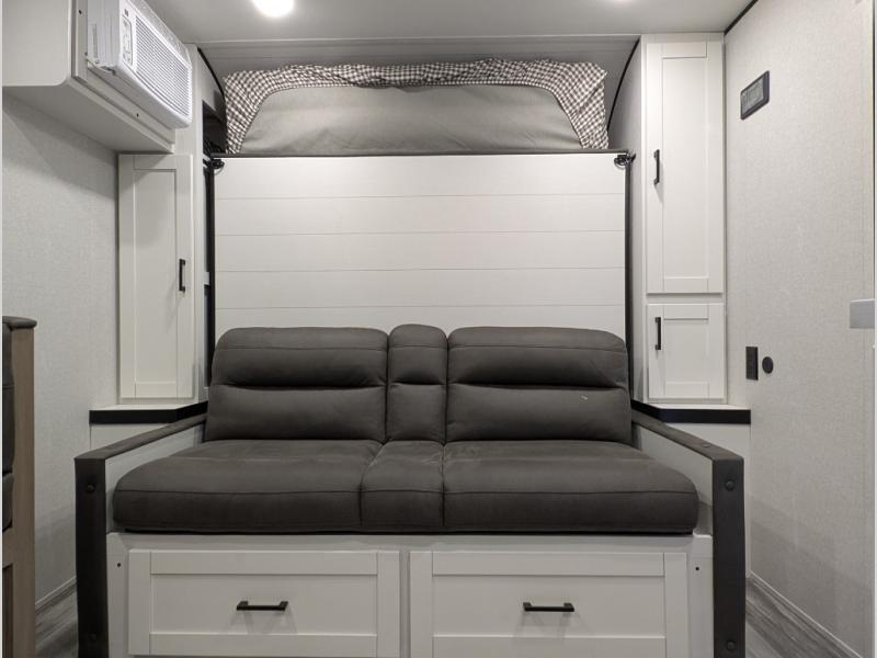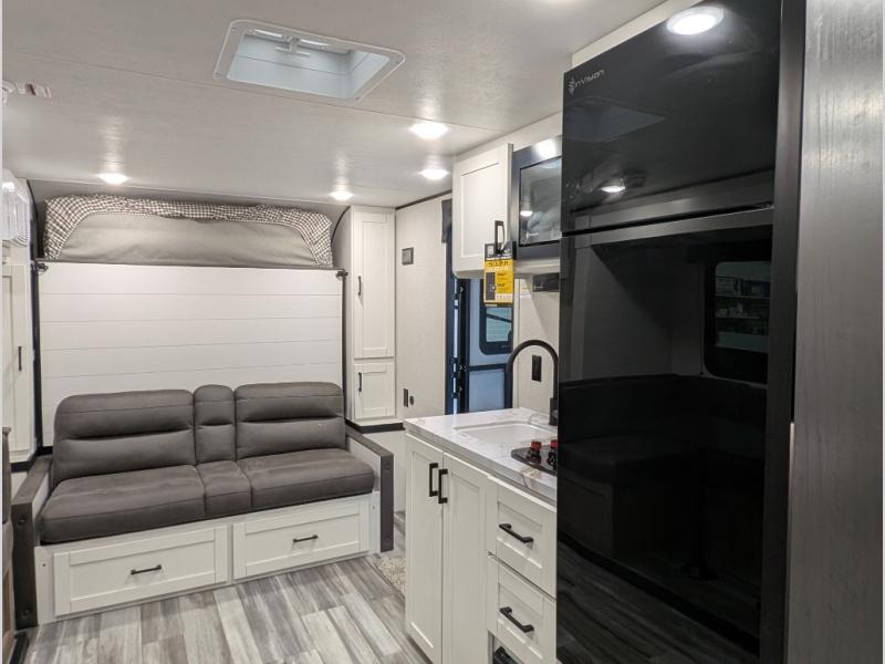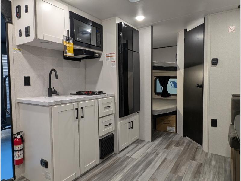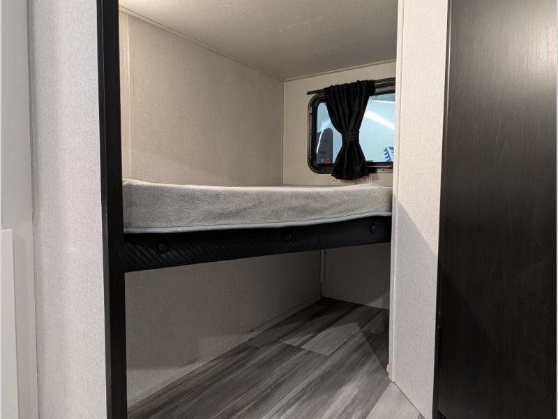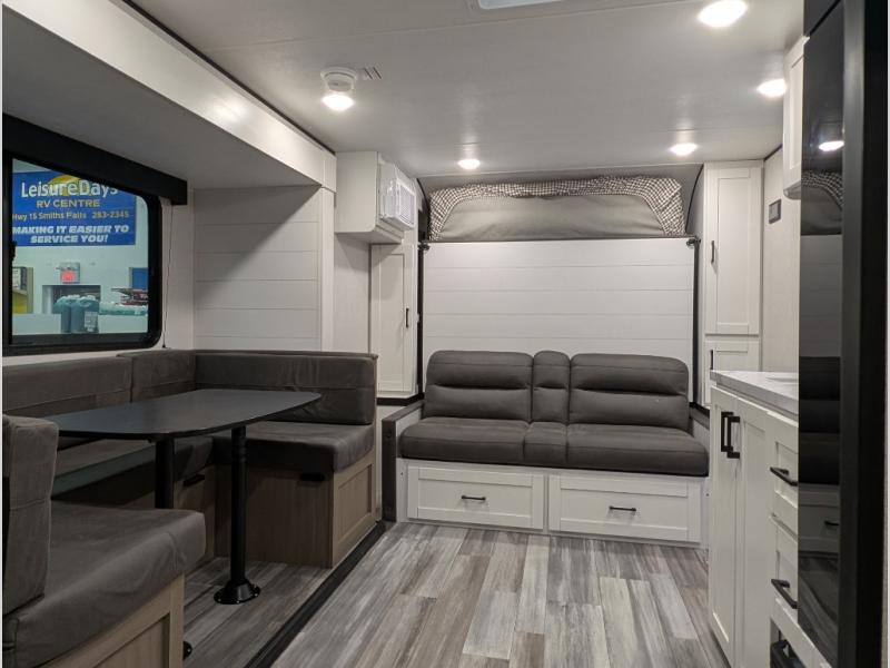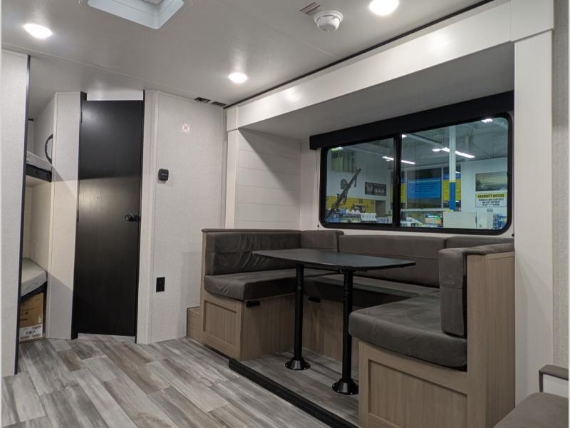 Any time spent in this travel trailer will be time well spent! You can easily sleep eight people each night thanks to the double-size bunks, front Murphy bed, and U-shaped dinette within the slide out. There is a full bath next to the bunks for easy nighttime use, and the linen closet will be perfect for clean towels. A cooktop, microwave oven, and 8 cu. ft. 12V refrigerator will let you cook and store food, and there is an overhead cabinet for spices or snacks!
