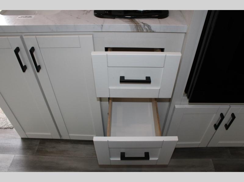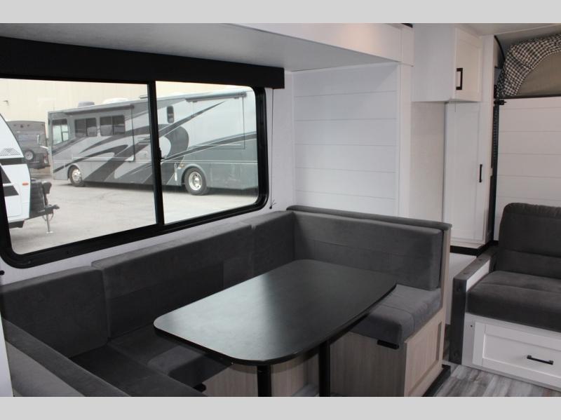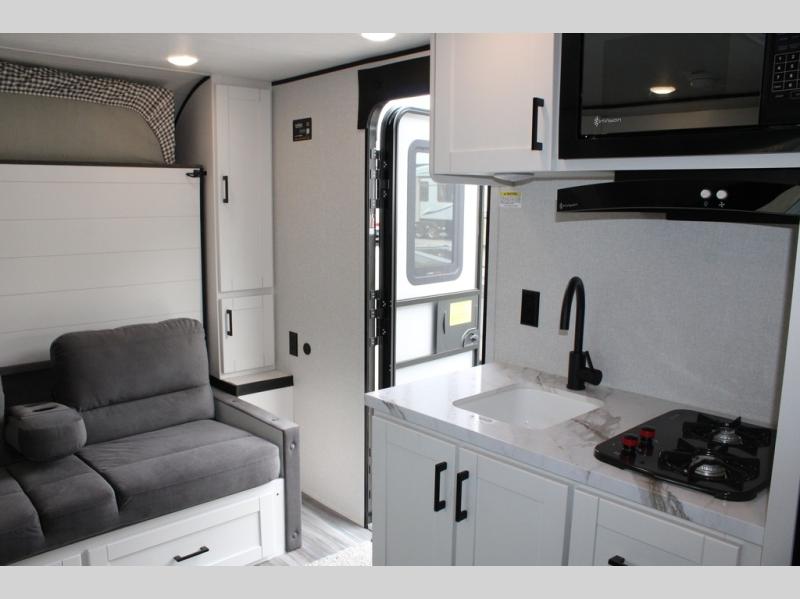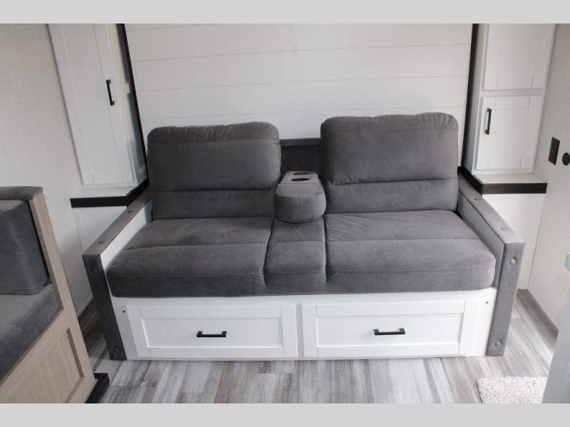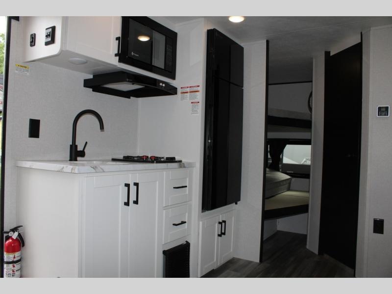 Any time spent in this travel trailer will be time well spent! You can easily sleep eight people each night thanks to the double-size bunks, front Murphy bed, and U-shaped dinette within the slide out. There is a full bath next to the bunks for easy nighttime use, and the linen closet will be perfect for clean towels. A cooktop, microwave oven, and 8 cu. ft. 12V refrigerator will let you cook and store food, and there is an overhead cabinet for spices or snacks!