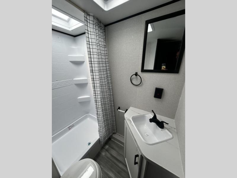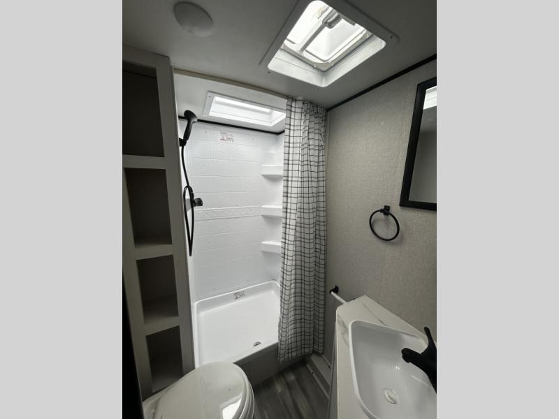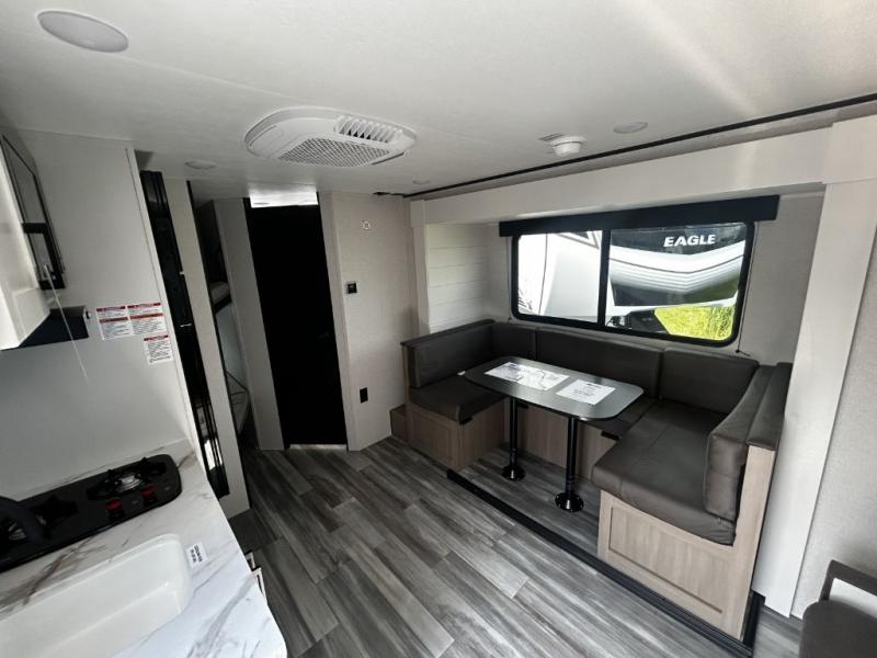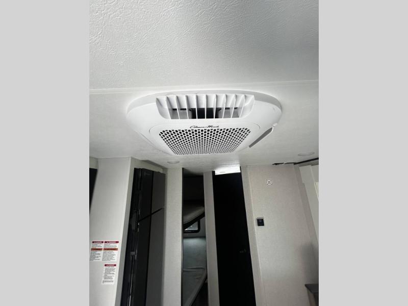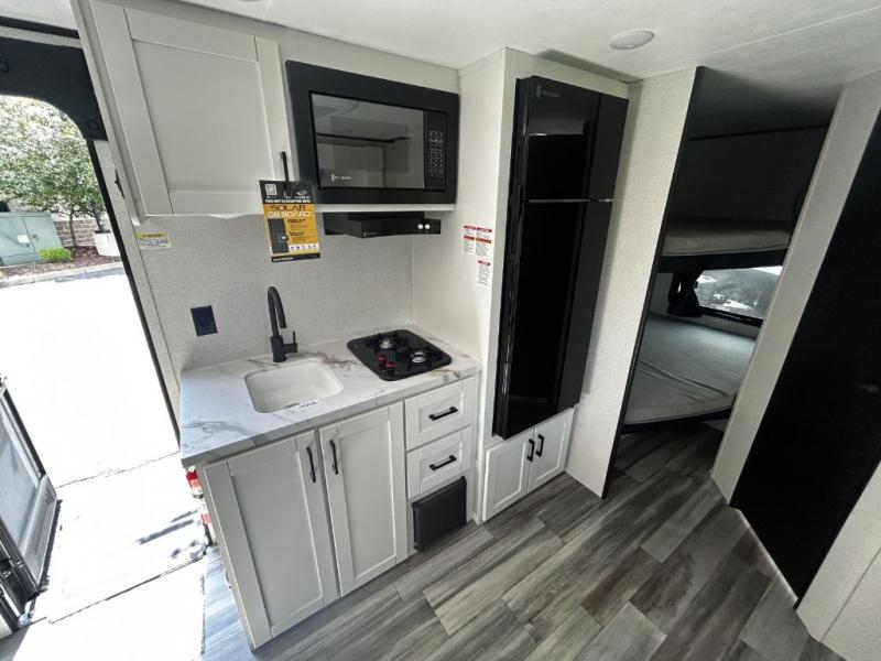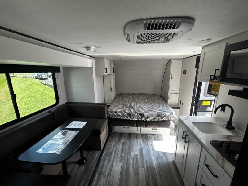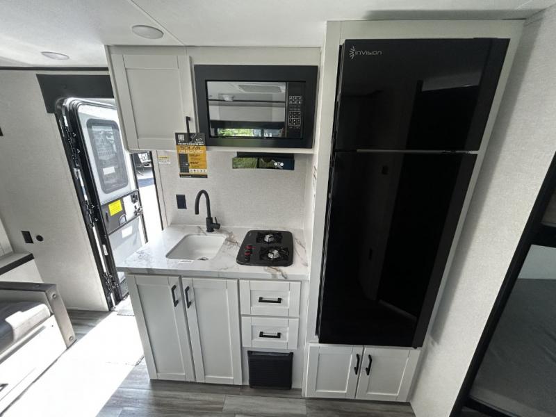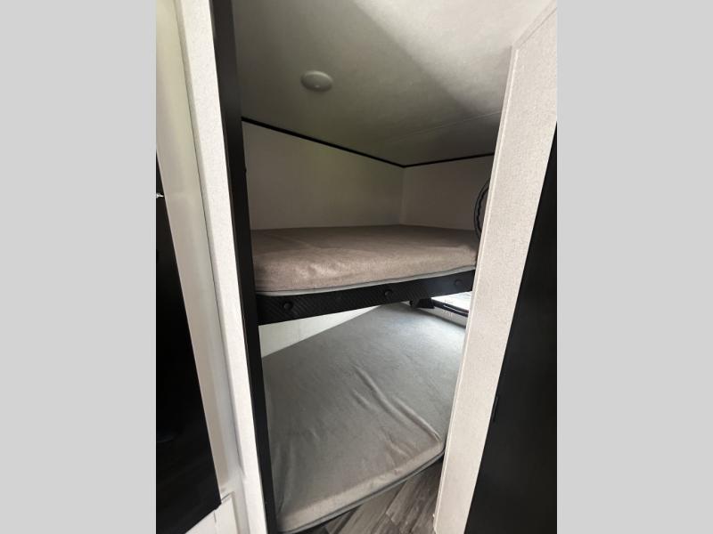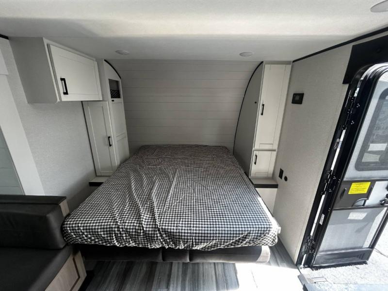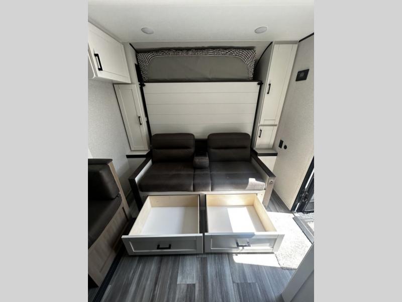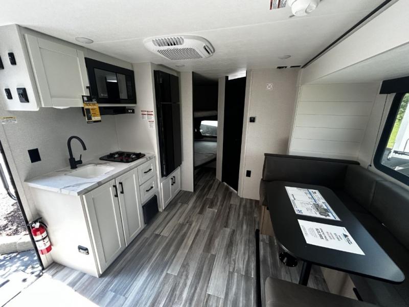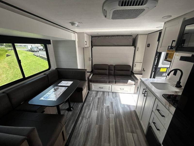 Any time spent in this travel trailer will be time well spent! You can easily sleep eight people each night thanks to the double-size bunks, front Murphy bed, and U-shaped dinette within the slide out. There is a full bath next to the bunks for easy nighttime use, and the linen closet will be perfect for clean towels. A cooktop, microwave oven, and 8 cu. ft. 12V refrigerator will let you cook and store food, and there is an overhead cabinet for spices or snacks!