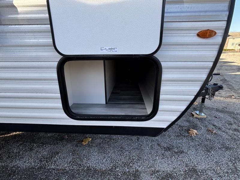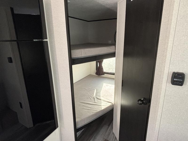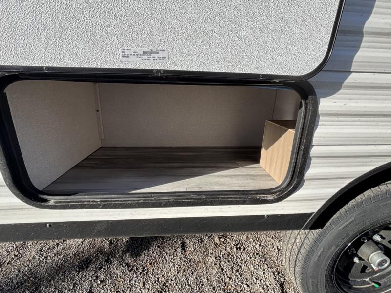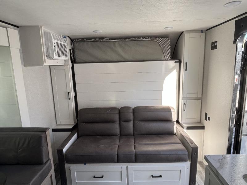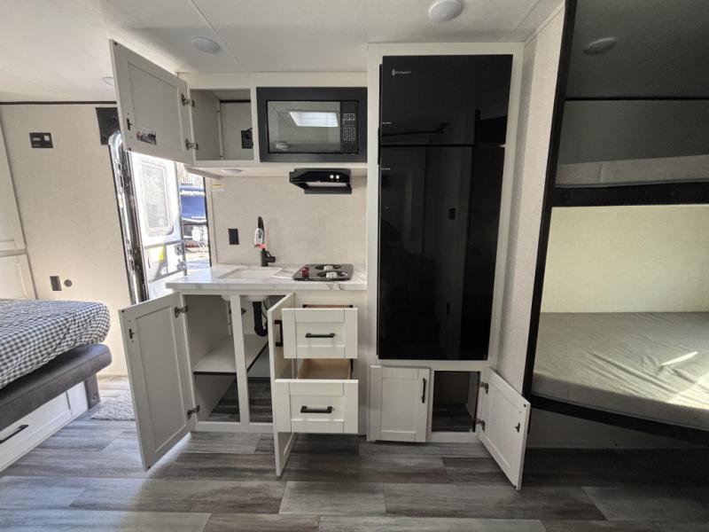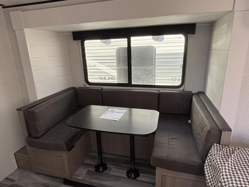 Any time spent in this travel trailer will be time well spent! You can easily sleep eight people each night thanks to the double-size bunks, front Murphy bed, and U-shaped dinette within the slide out. There is a full bath next to the bunks for easy nighttime use, and the linen closet will be perfect for clean towels. A cooktop, microwave oven, and 8 cu. ft. 12V refrigerator will let you cook and store food, and there is an overhead cabinet for spices or snacks!