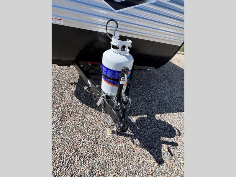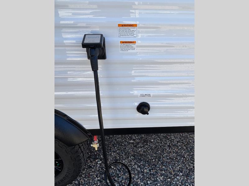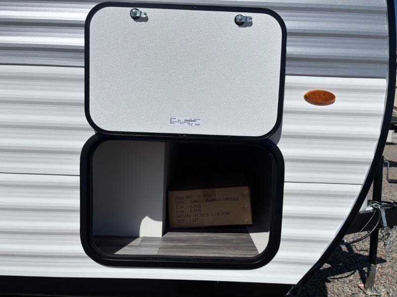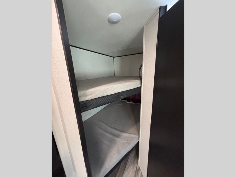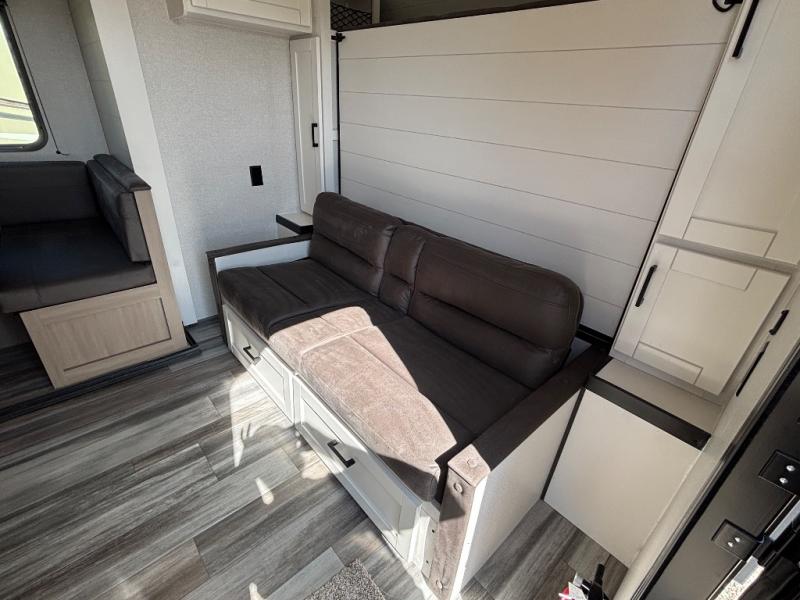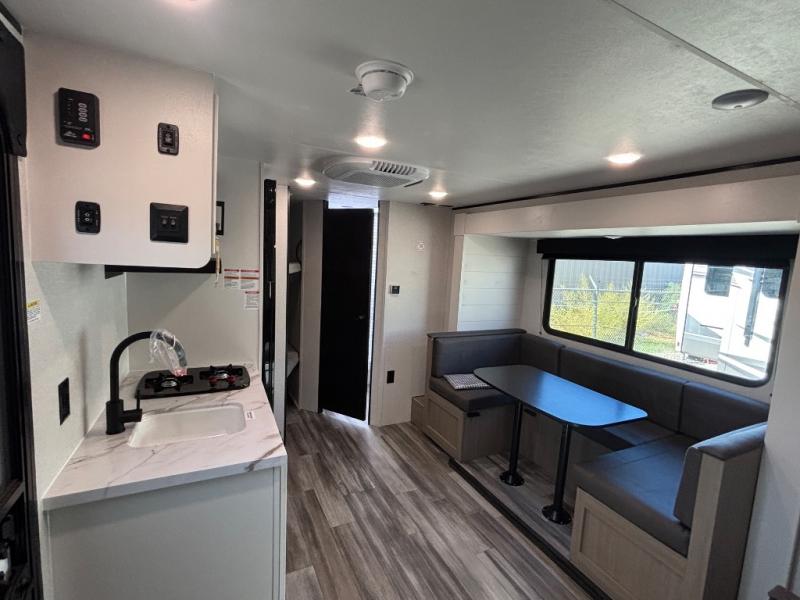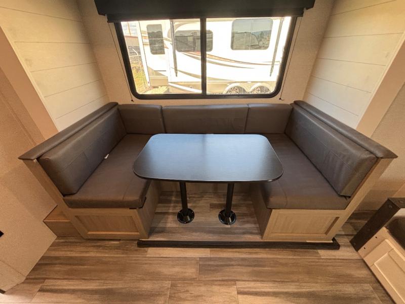 Any time spent in this travel trailer will be time well spent! You can easily sleep eight people each night thanks to the double-size bunks, front Murphy bed, and U-shaped dinette within the slide out. There is a full bath next to the bunks for easy nighttime use, and the linen closet will be perfect for clean towels. A cooktop, microwave oven, and 8 cu. ft. 12V refrigerator will let you cook and store food, and there is an overhead cabinet for spices or snacks!