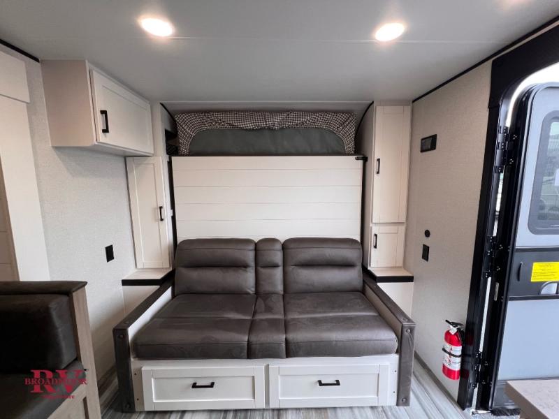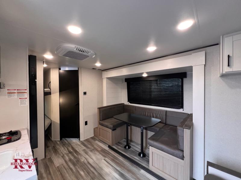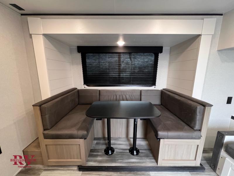 Any time spent in this travel trailer will be time well spent! You can easily sleep eight people each night thanks to the double-size bunks, front Murphy bed, and U-shaped dinette within the slide out. There is a full bath next to the bunks for easy nighttime use, and the linen closet will be perfect for clean towels. A cooktop, microwave oven, and 8 cu. ft. 12V refrigerator will let you cook and store food, and there is an overhead cabinet for spices or snacks!