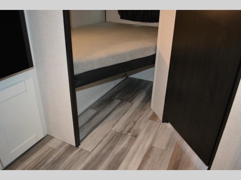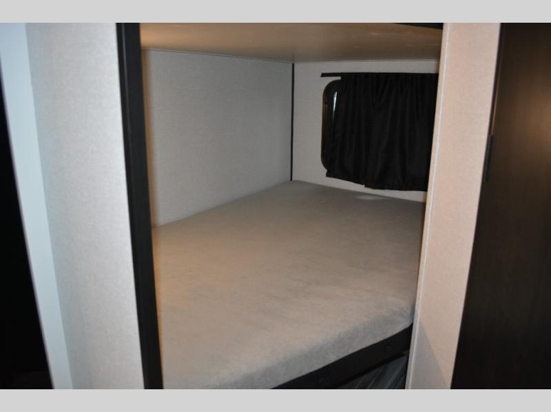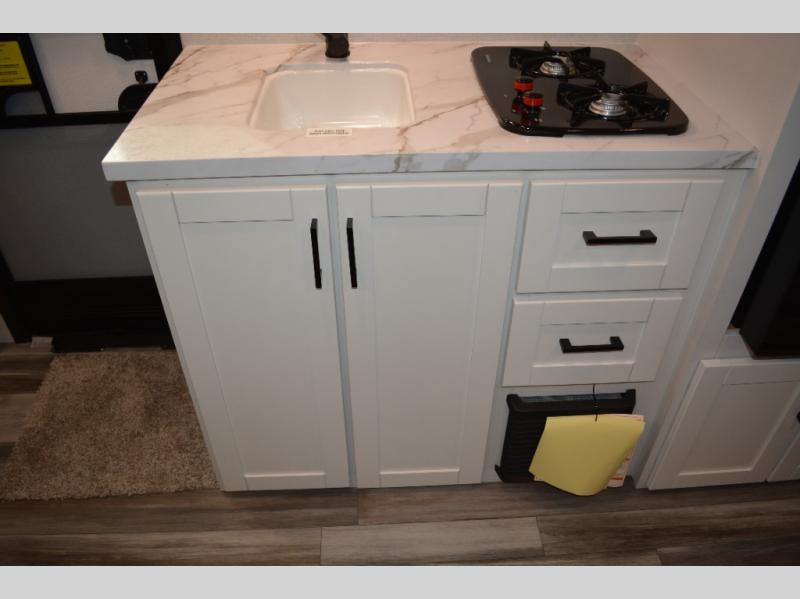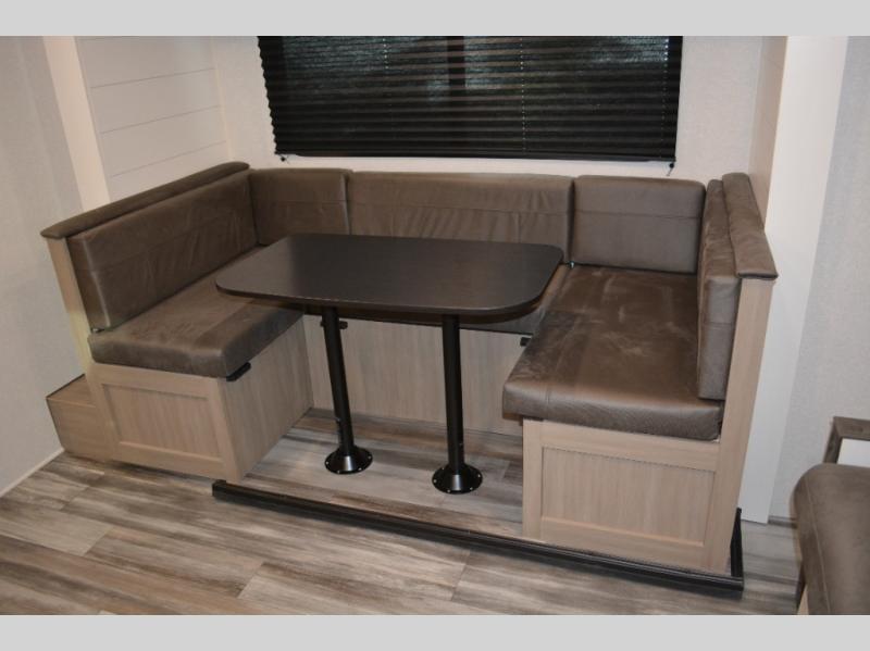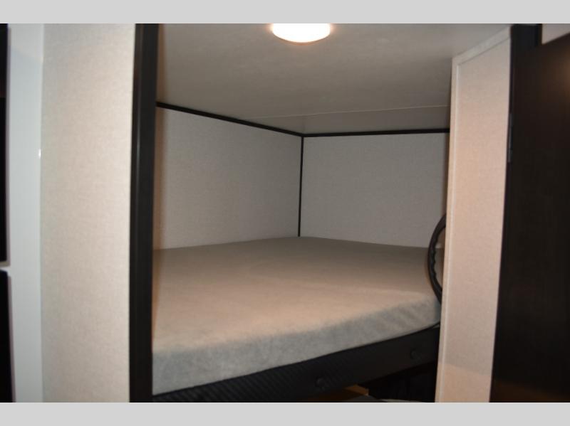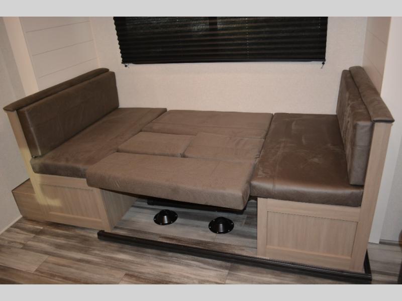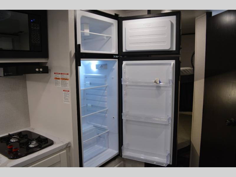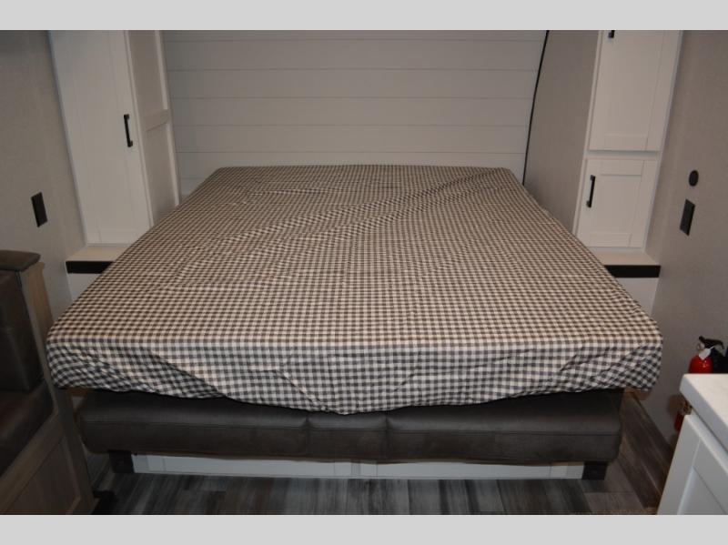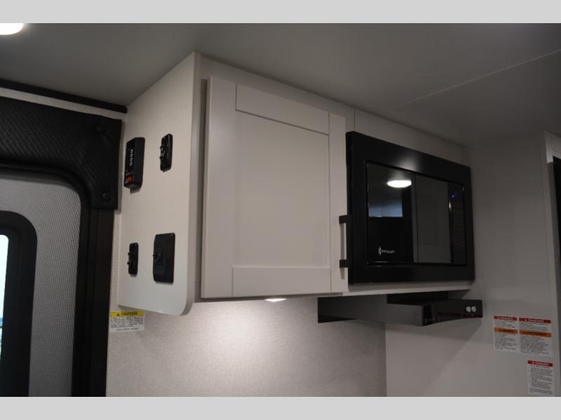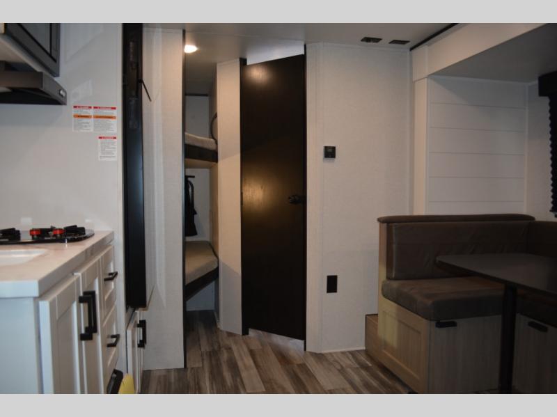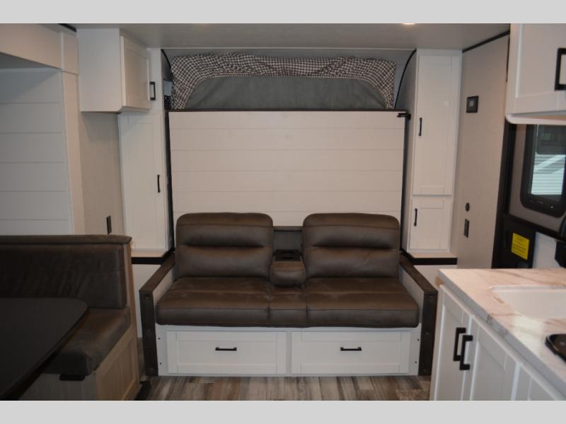 Any time spent in this travel trailer will be time well spent! You can easily sleep eight people each night thanks to the double-size bunks, front Murphy bed, and U-shaped dinette within the slide out. There is a full bath next to the bunks for easy nighttime use, and the linen closet will be perfect for clean towels. A cooktop, microwave oven, and 8 cu. ft. 12V refrigerator will let you cook and store food, and there is an overhead cabinet for spices or snacks!