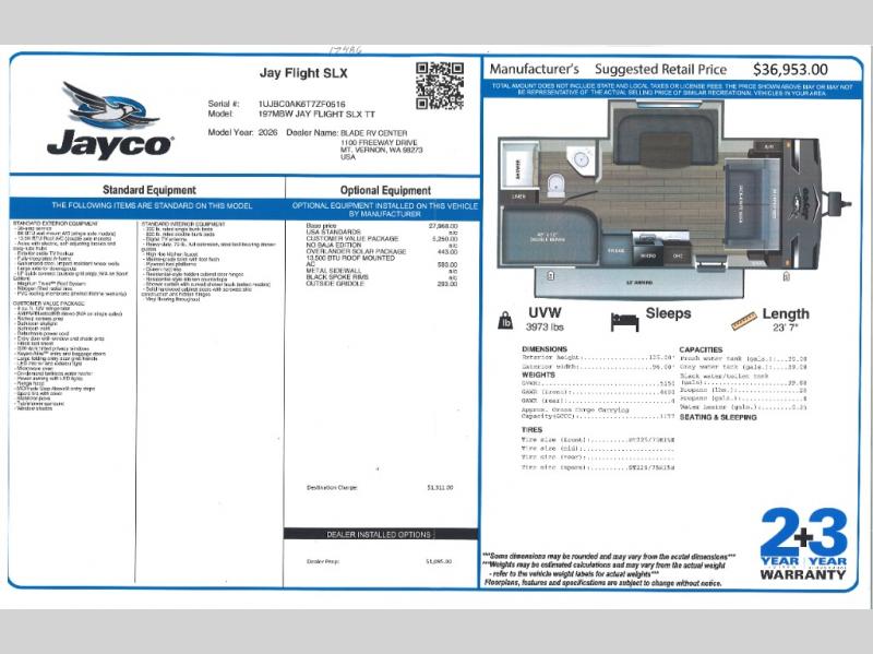 New 2026 Jayco Jay Flight SLX 197MBW Travel Trailer