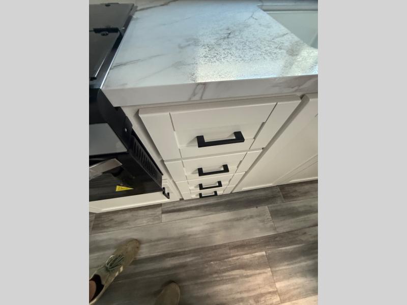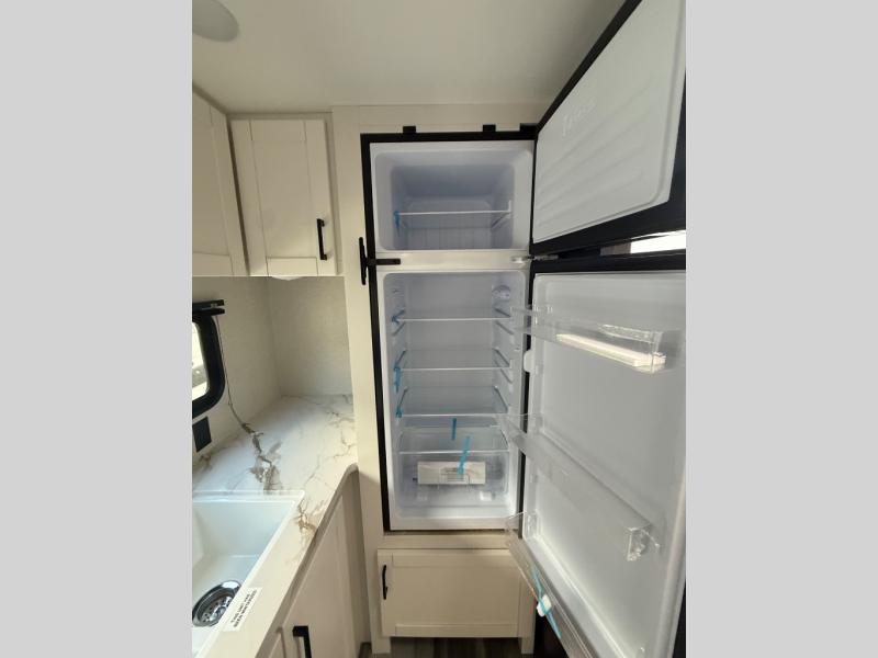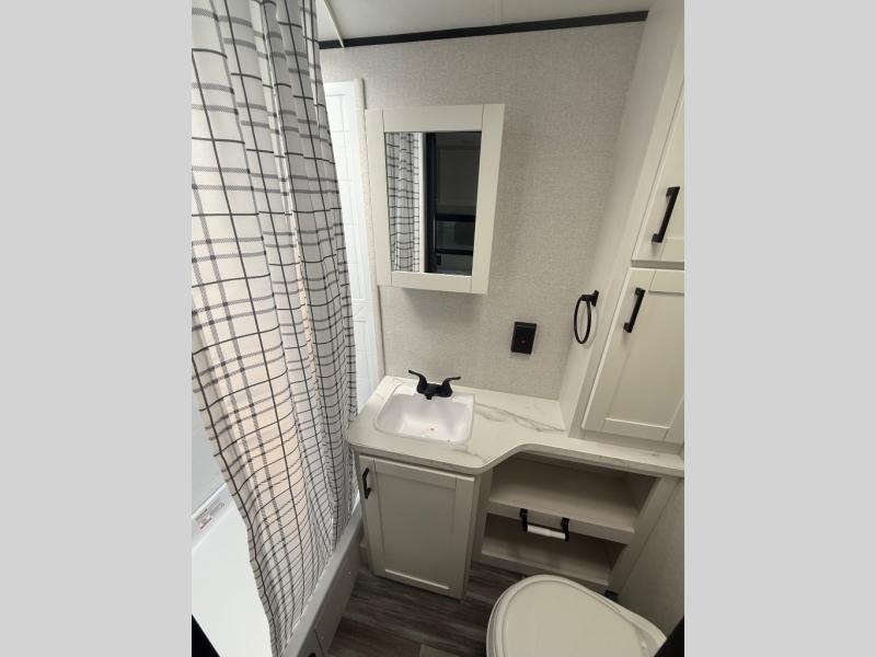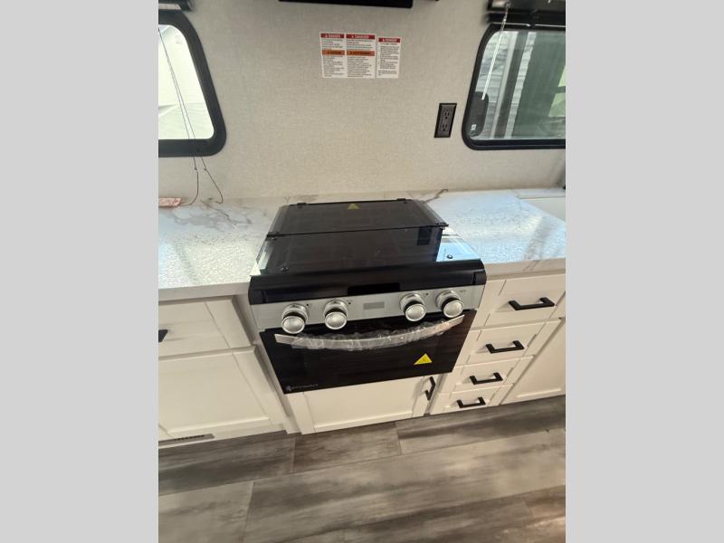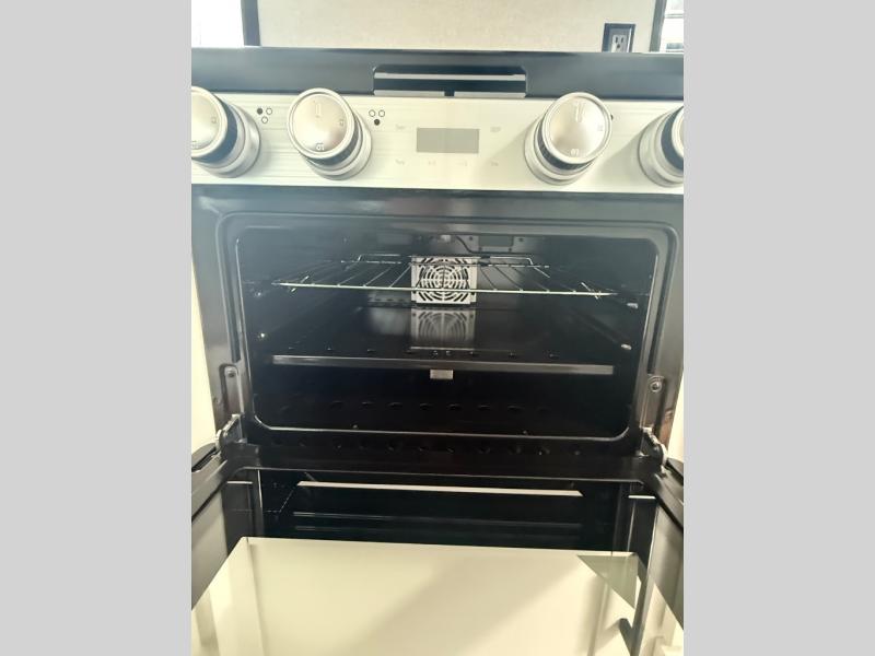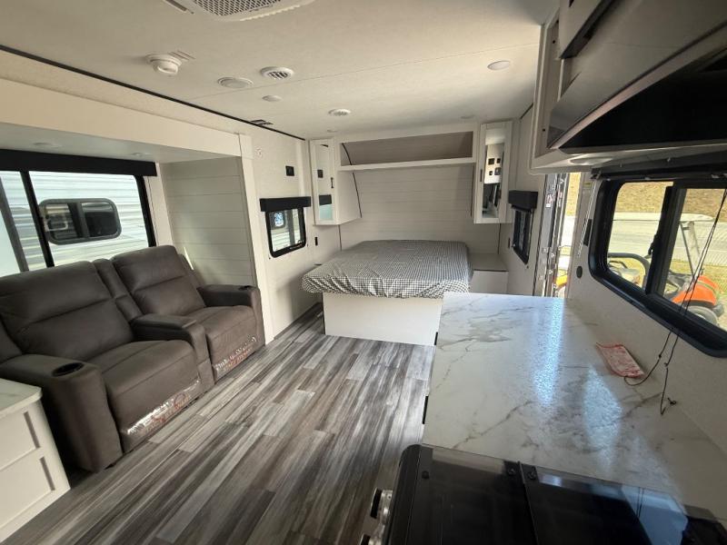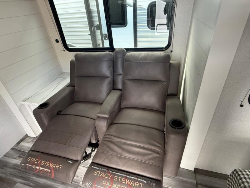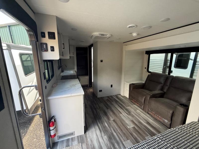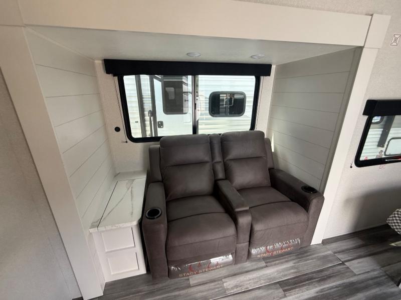 This couple's trailer will be perfect for weekend trips to the lake or extended stays at the campground. You can sleep on the front queen bed each night instead of on an air mattress, and the dual bedroom wardrobes will help keep your space organized. The theater seat with tables is within a slide for more floor space, and the fully-equipped kitchen will allow you to make meals each day. You'll also appreciate the rear corner full bath to stay clean throughout each trip!