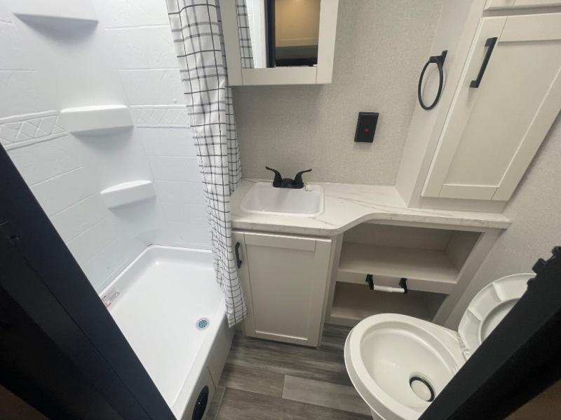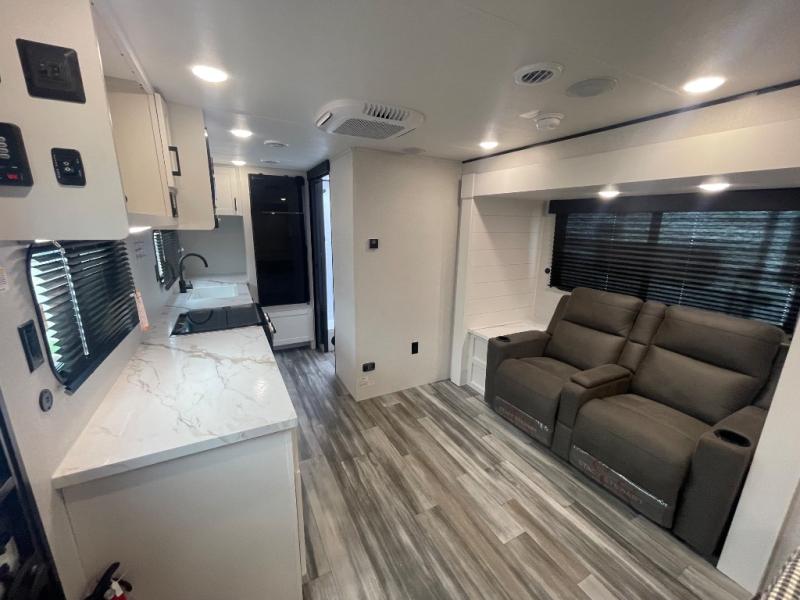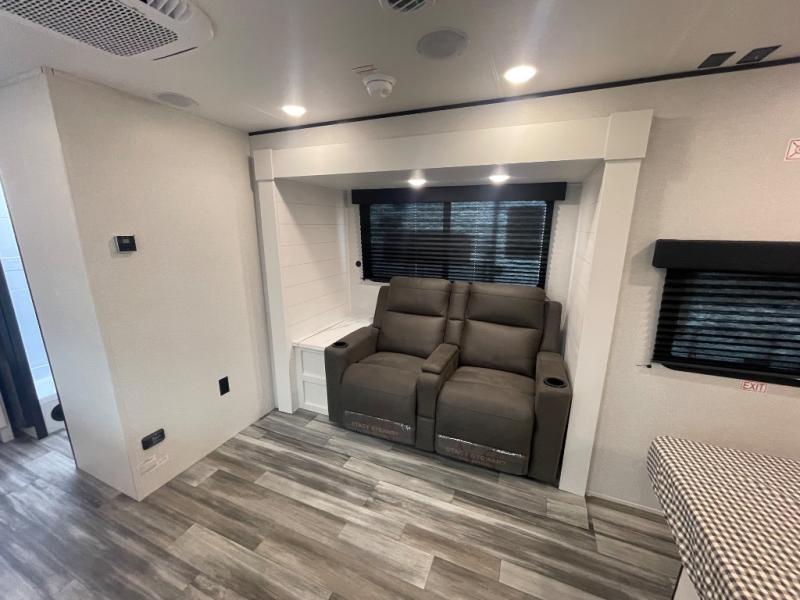 This couple's trailer will be perfect for weekend trips to the lake or extended stays at the campground. You can sleep on the front queen bed each night instead of on an air mattress, and the dual bedroom wardrobes will help keep your space organized. The theater seat is within a slide for more floor space, and the fully-equipped kitchen will allow you to make meals each day. You'll also appreciate the rear corner full bath to stay clean throughout each trip!