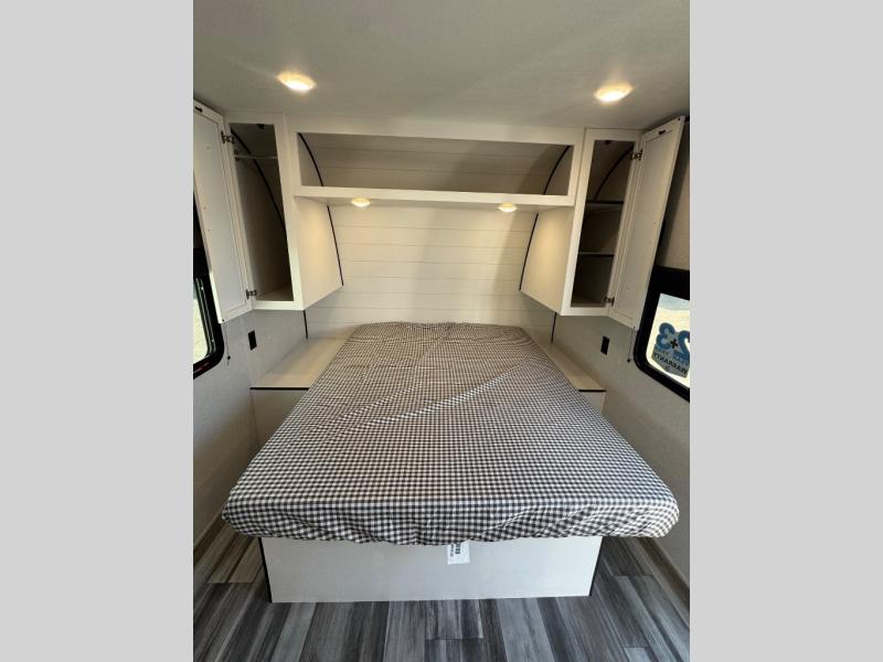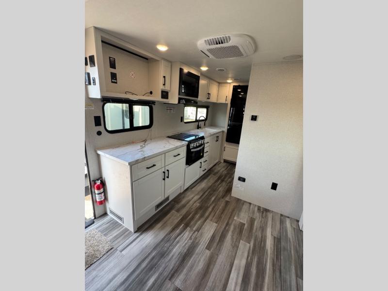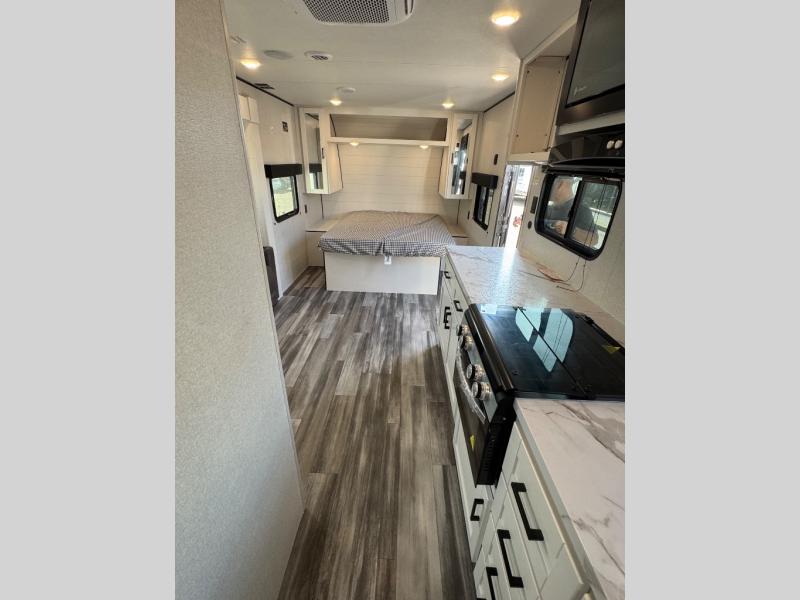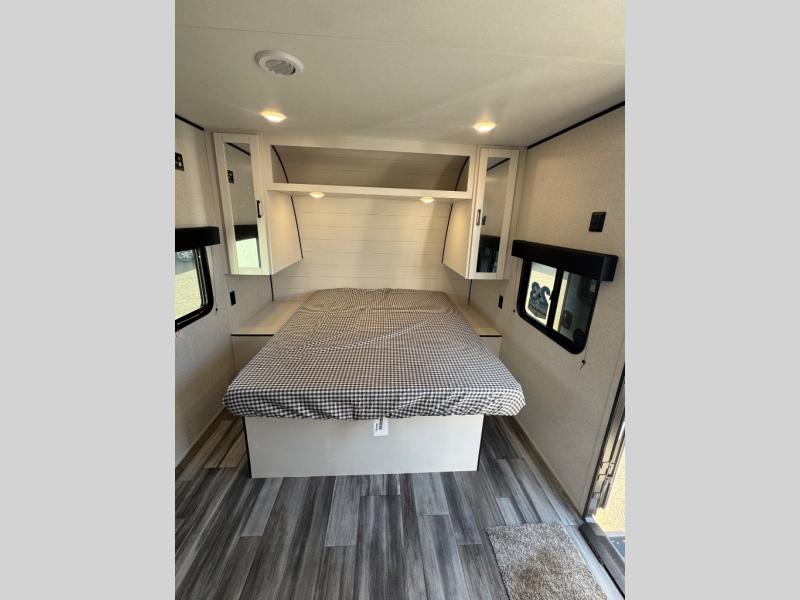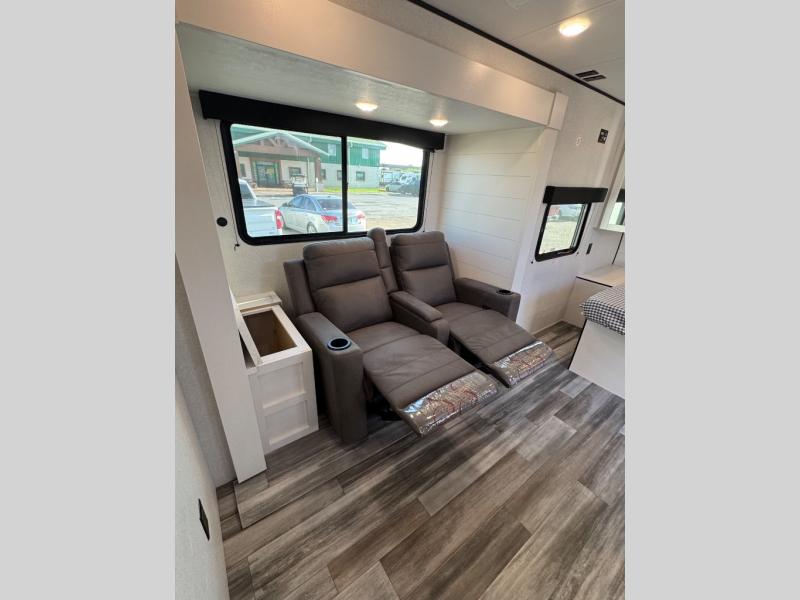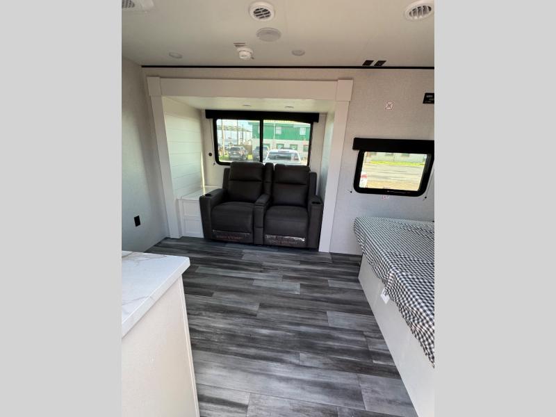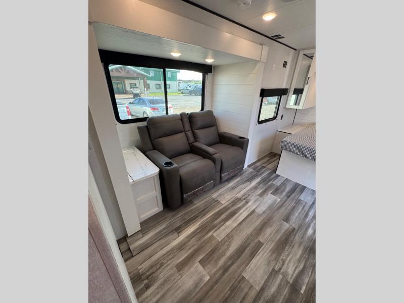 This couple's trailer will be perfect for weekend trips to the lake or extended stays at the campground. You can sleep on the front queen bed each night instead of on an air mattress, and the dual bedroom wardrobes will help keep your space organized. The theater seat is within a slide for more floor space, and the fully-equipped kitchen will allow you to make meals each day. You'll also appreciate the rear corner full bath to stay clean throughout each trip!