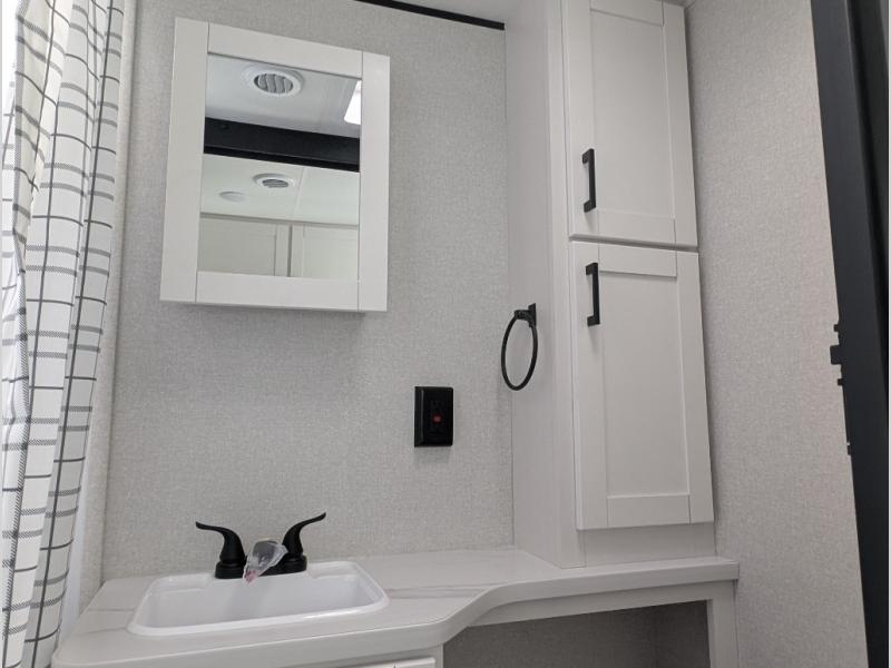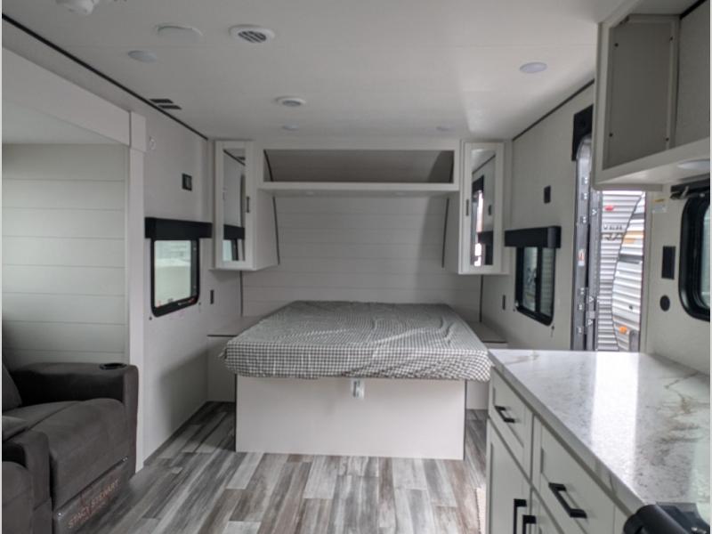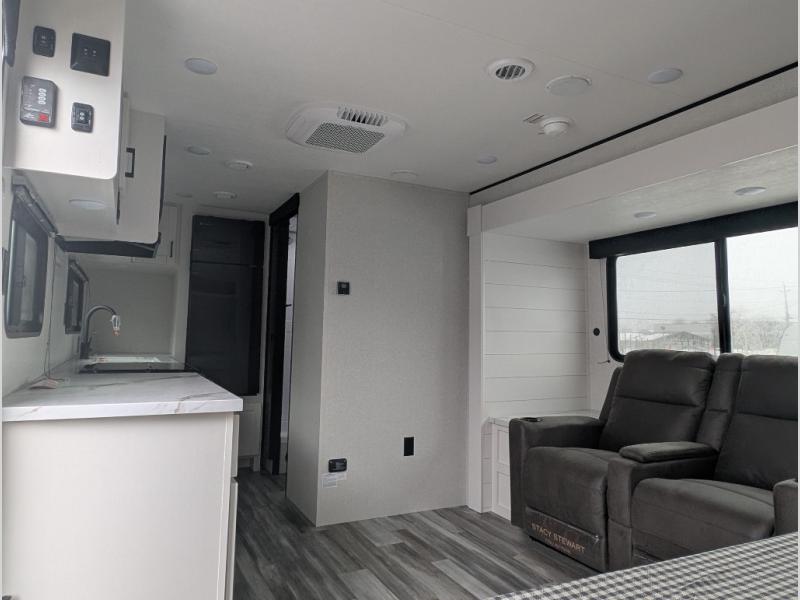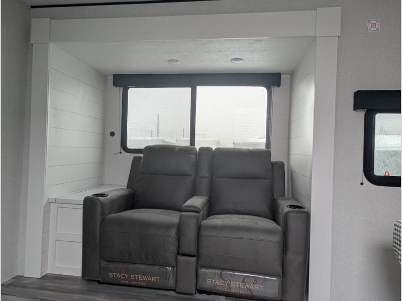 This couple's trailer will be perfect for weekend trips to the lake or extended stays at the campground. You can sleep on the front queen bed each night instead of on an air mattress, and the dual bedroom wardrobes will help keep your space organized. The theater seat is within a slide for more floor space, and the fully-equipped kitchen will allow you to make meals each day. You'll also appreciate the rear corner full bath to stay clean throughout each trip!