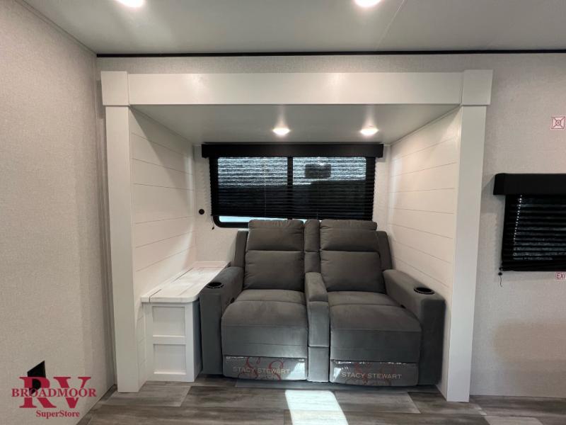 This couple's trailer will be perfect for weekend trips to the lake or extended stays at the campground. You can sleep on the front queen bed each night instead of on an air mattress, and the dual bedroom wardrobes will help keep your space organized. The theater seat with tables is within a slide for more floor space, and the fully-equipped kitchen will allow you to make meals each day. You'll also appreciate the rear corner full bath to stay clean throughout each trip!
