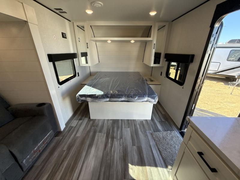 The Jayco Jay Flight SLX travel trailer is quite easy to own because it is lightweight for an easier towing experience. Built on a fully integrated A-frame with galvanized-steel, impact-resistant wheel wells, the Jay Flight SLX has quality at its very foundation. That quality continues on to the electric self-adjusting brakes, easy-lube hubs, Magnum Truss roof system, and LP quick connect. Some of what the mandatory Customer Value Package includes is backup camera prep, Keyed-Alike entry and baggage doors, marine grade exterior speakers, and an on-demand tankless water heater.