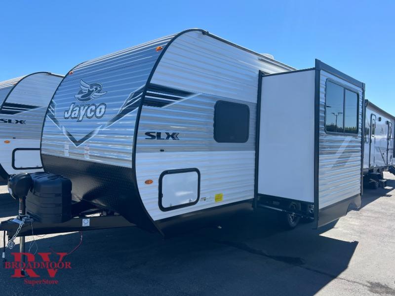 The Jayco Jay Flight SLX travel trailer is quite easy to own because it is lightweight for an easier towing experience. Built on a fully integrated A-frame with galvanized-steel, impact-resistant wheel wells, the Jay Flight SLX has quality at its very foundation. That quality continues on to the electric self-adjusting brakes, easy-lube hubs, Magnum Truss roof system, and LP quick connect. Some of what the mandatory Customer Value Package includes is backup camera prep, Keyed-Alike entry and baggage doors, marine grade exterior speakers, and an on-demand tankless water heater.