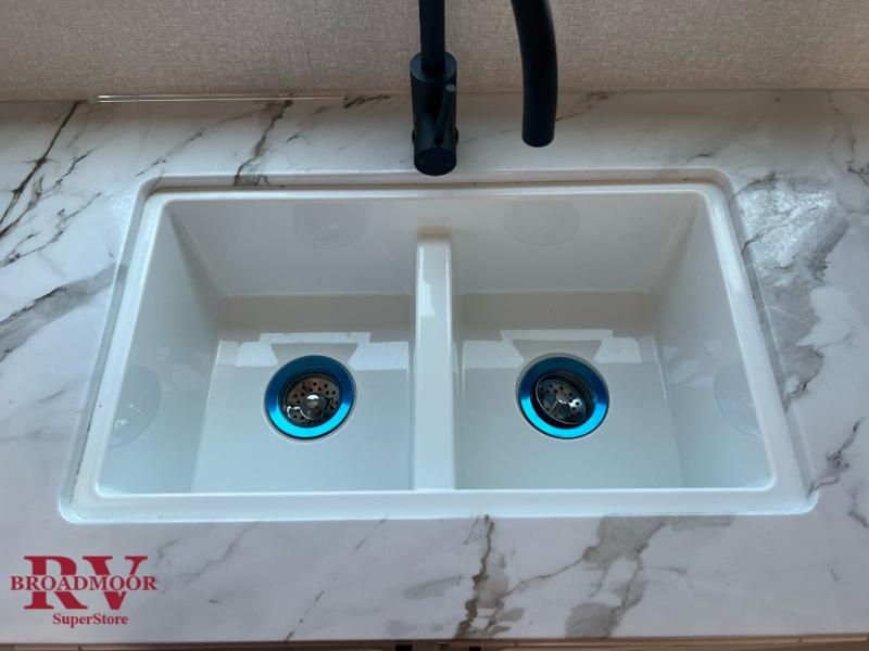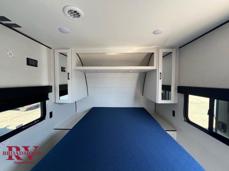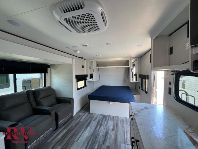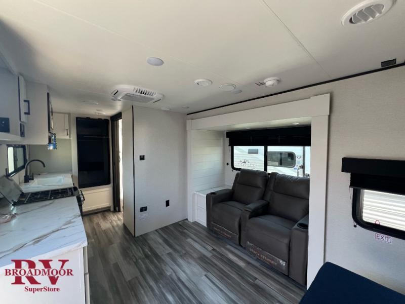 This couple's trailer will be perfect for weekend trips to the lake or extended stays at the campground. You can sleep on the front queen bed each night instead of on an air mattress, and the dual bedroom wardrobes will help keep your space organized. The theater seat with tables is within a slide for more floor space, and the fully-equipped kitchen will allow you to make meals each day. You'll also appreciate the rear corner full bath to stay clean throughout each trip!