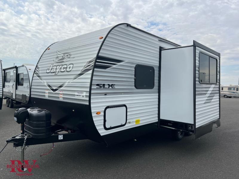 The Jayco Jay Flight SLX travel trailer is quite easy to own because it is lightweight for an easier towing experience. Built on a fully integrated A-frame with galvanized-steel, impact-resistant wheel wells, the Jay Flight SLX has quality at its very foundation. That quality continues on to the electric self-adjusting brakes, easy-lube hubs, Magnum Truss roof system, and LP quick connect. Some of what the mandatory Customer Value Package includes is backup camera prep, Keyed-Alike entry and baggage doors, marine grade exterior speakers, and an on-demand tankless water heater.