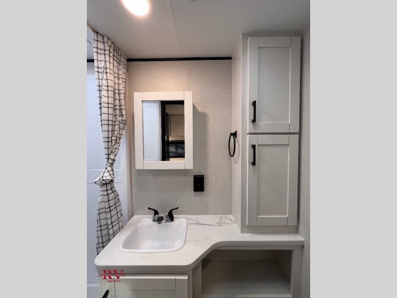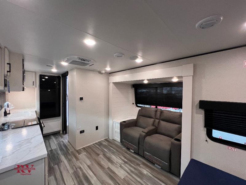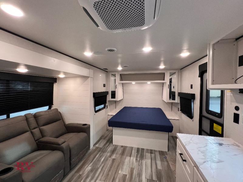 This couple's trailer will be perfect for weekend trips to the lake or extended stays at the campground. You can sleep on the front queen bed each night instead of on an air mattress, and the dual bedroom wardrobes will help keep your space organized. The theater seat is within a slide for more floor space, and the fully-equipped kitchen will allow you to make meals each day. You'll also appreciate the rear corner full bath to stay clean throughout each trip!