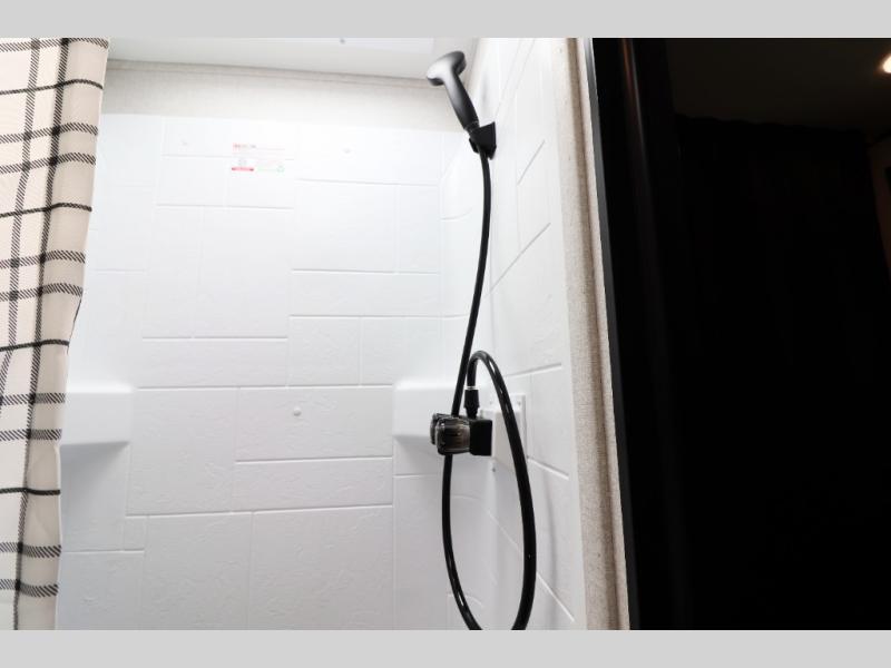 Side bathroom with tub/shower surround, vanity with skylight and vent fan—no need for communal campground restrooms.