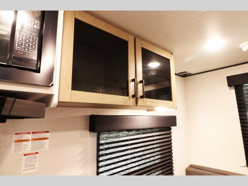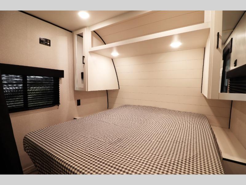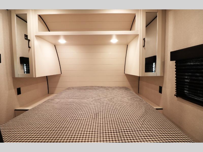 Queen bed up front + bunk beds in rear delivers private spaces and versatility.